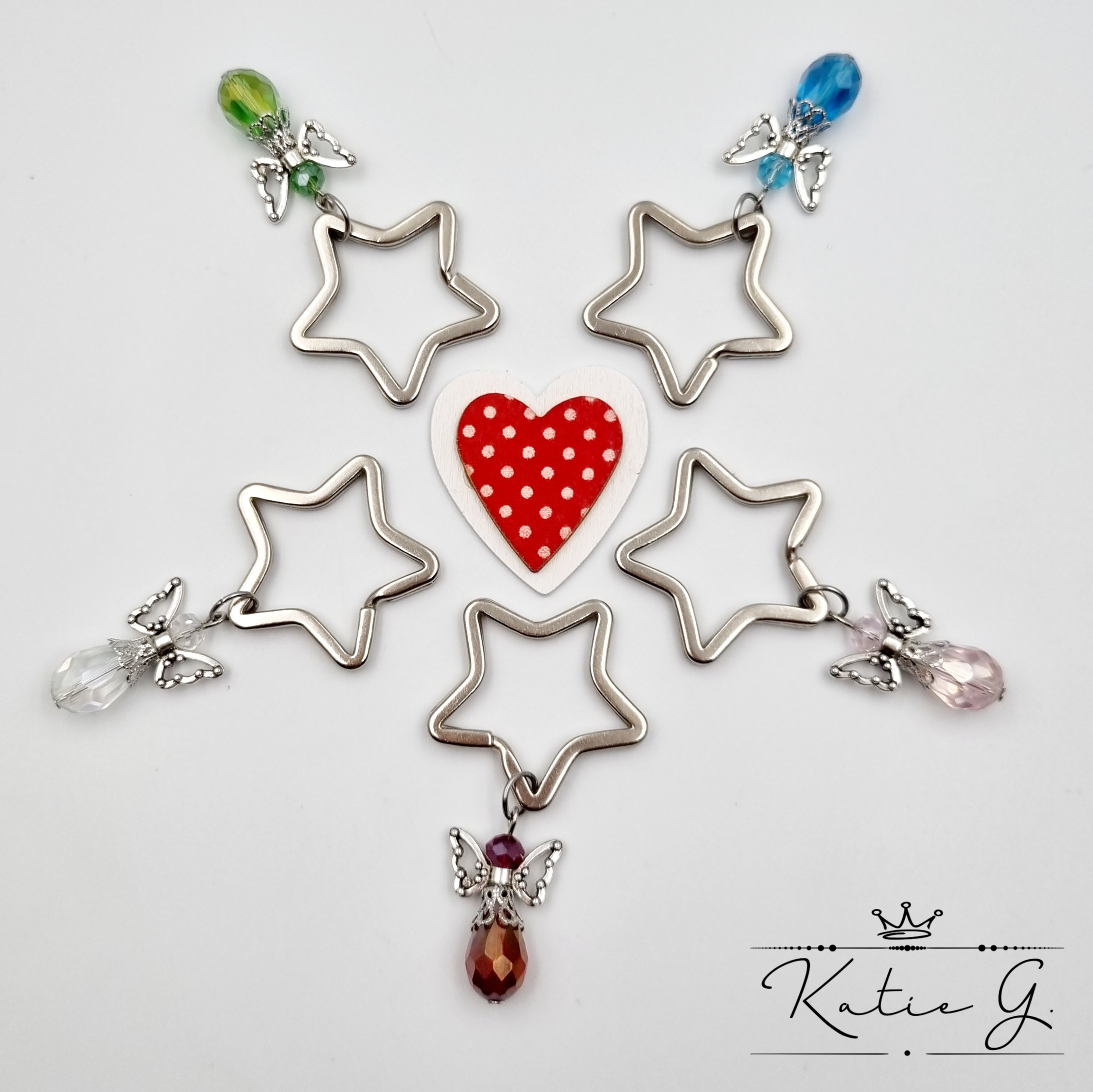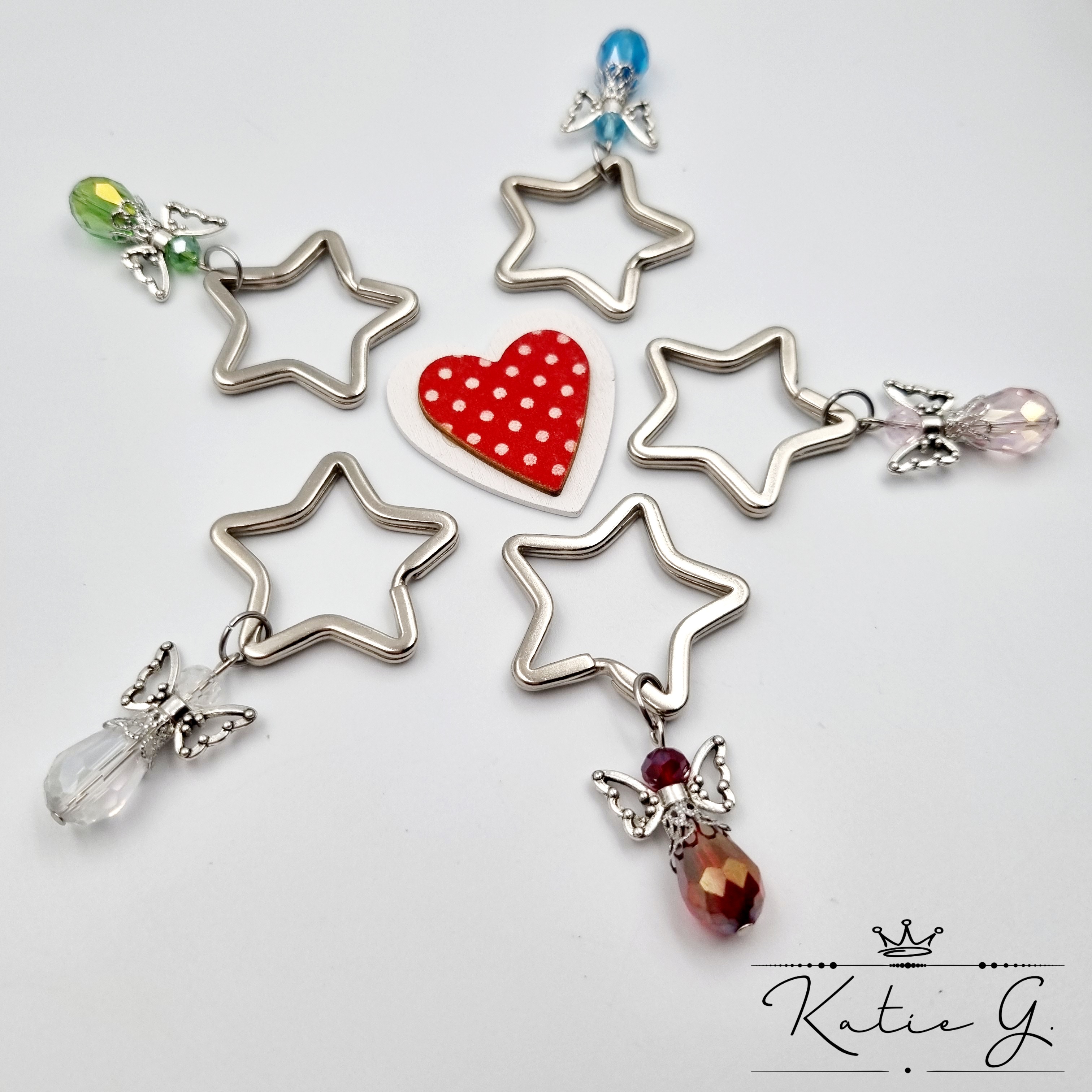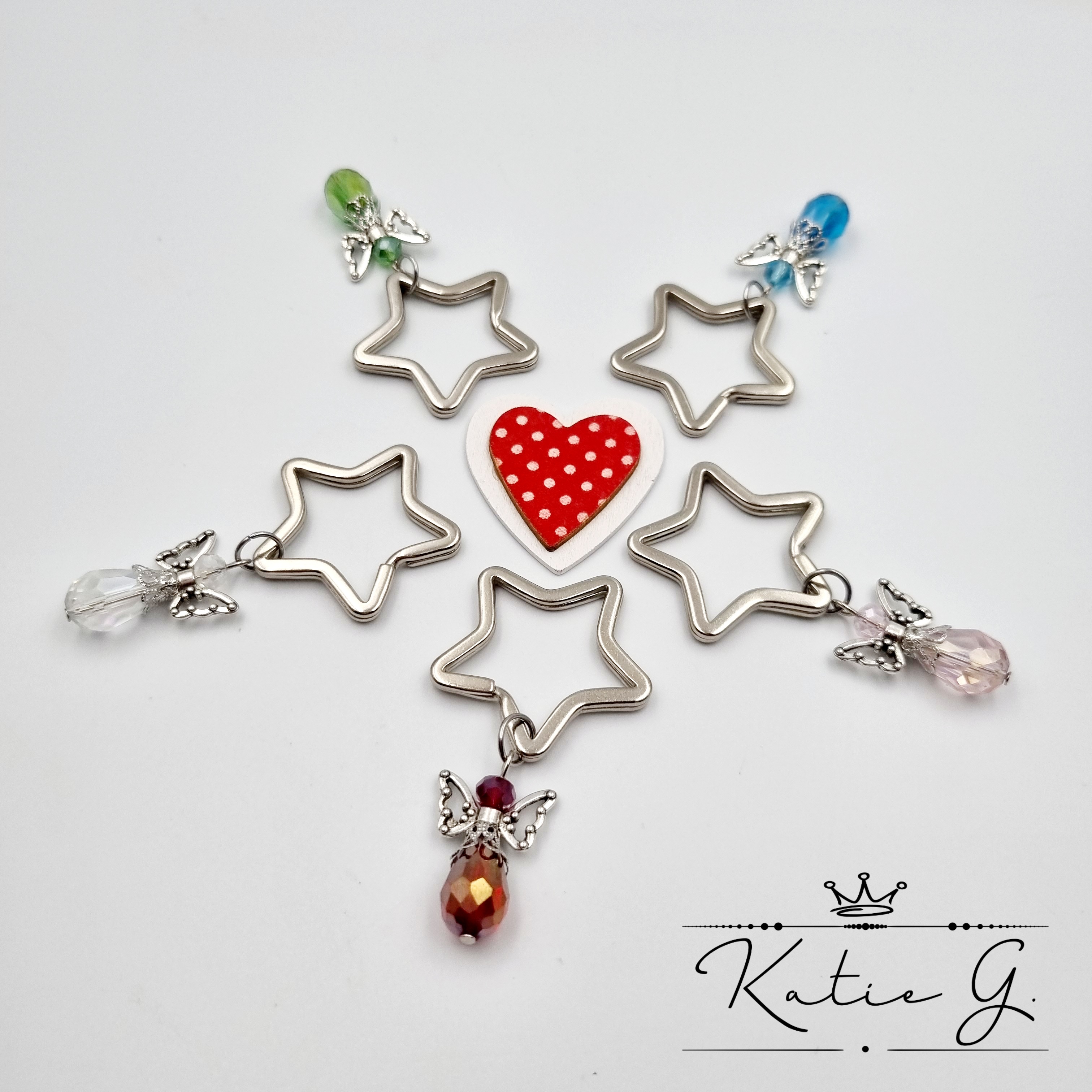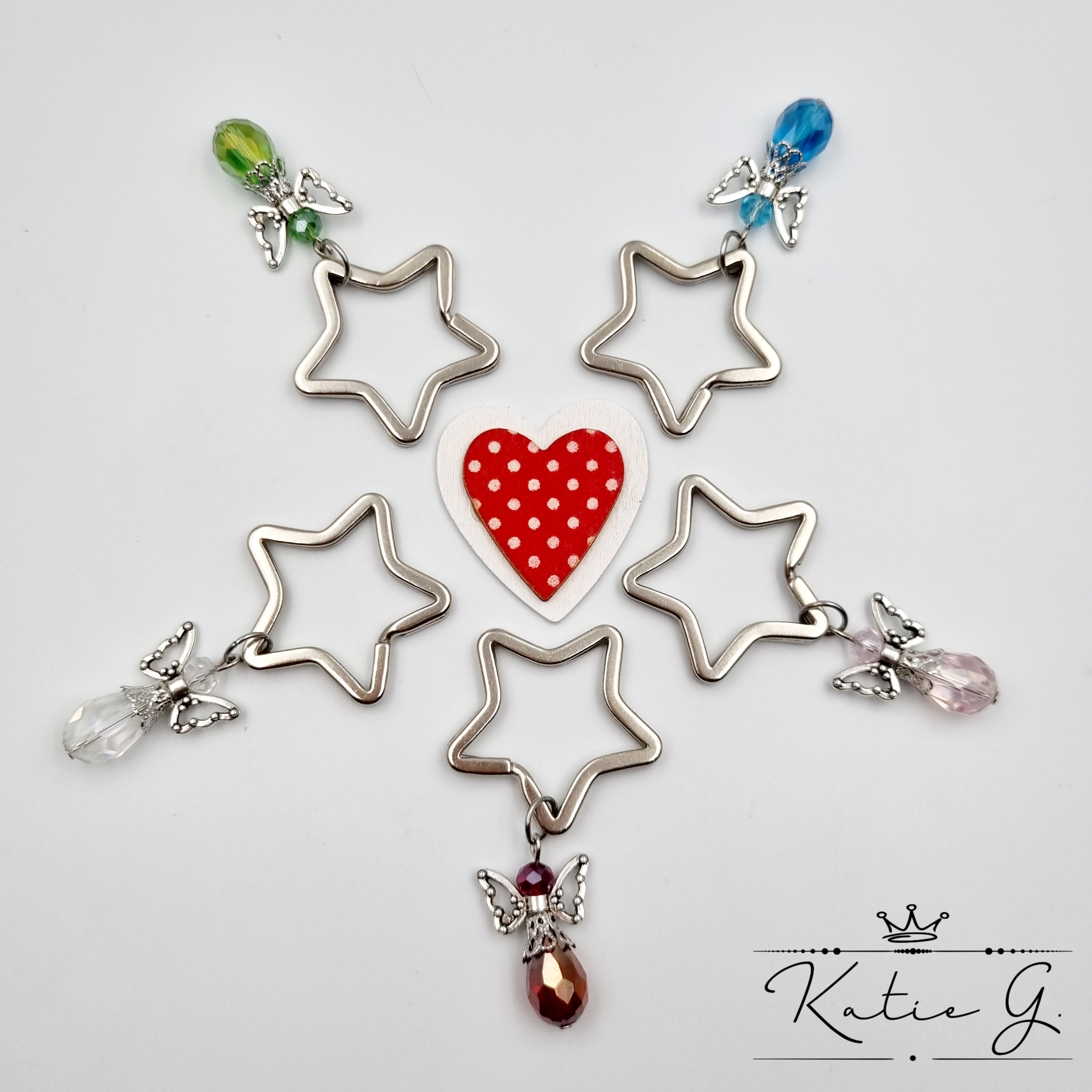 A csomag tartalma: a képen látható 5 db angyalkás csillag kulcstartó (piros, rózsaszín, kék, zöld, és áttetsző színek)