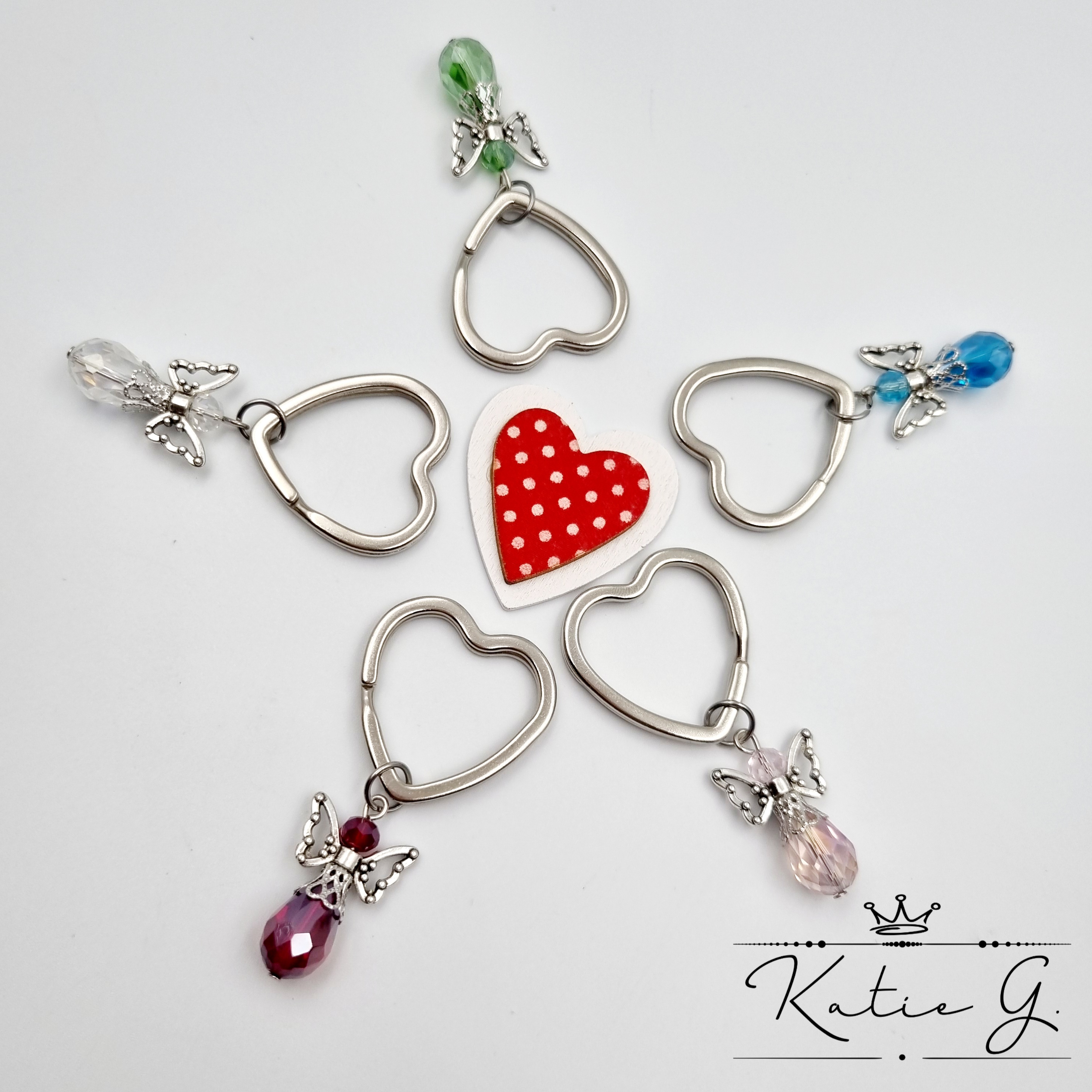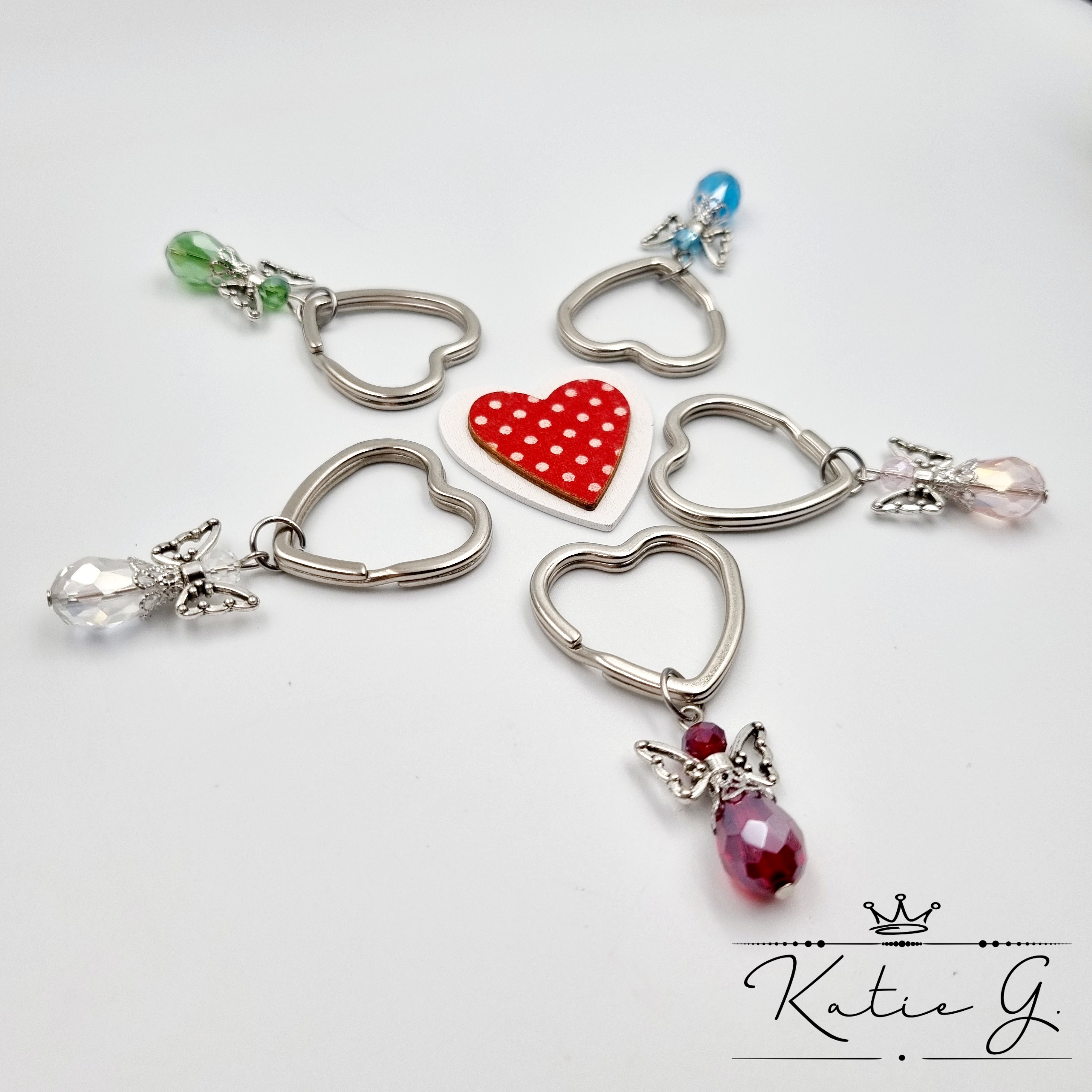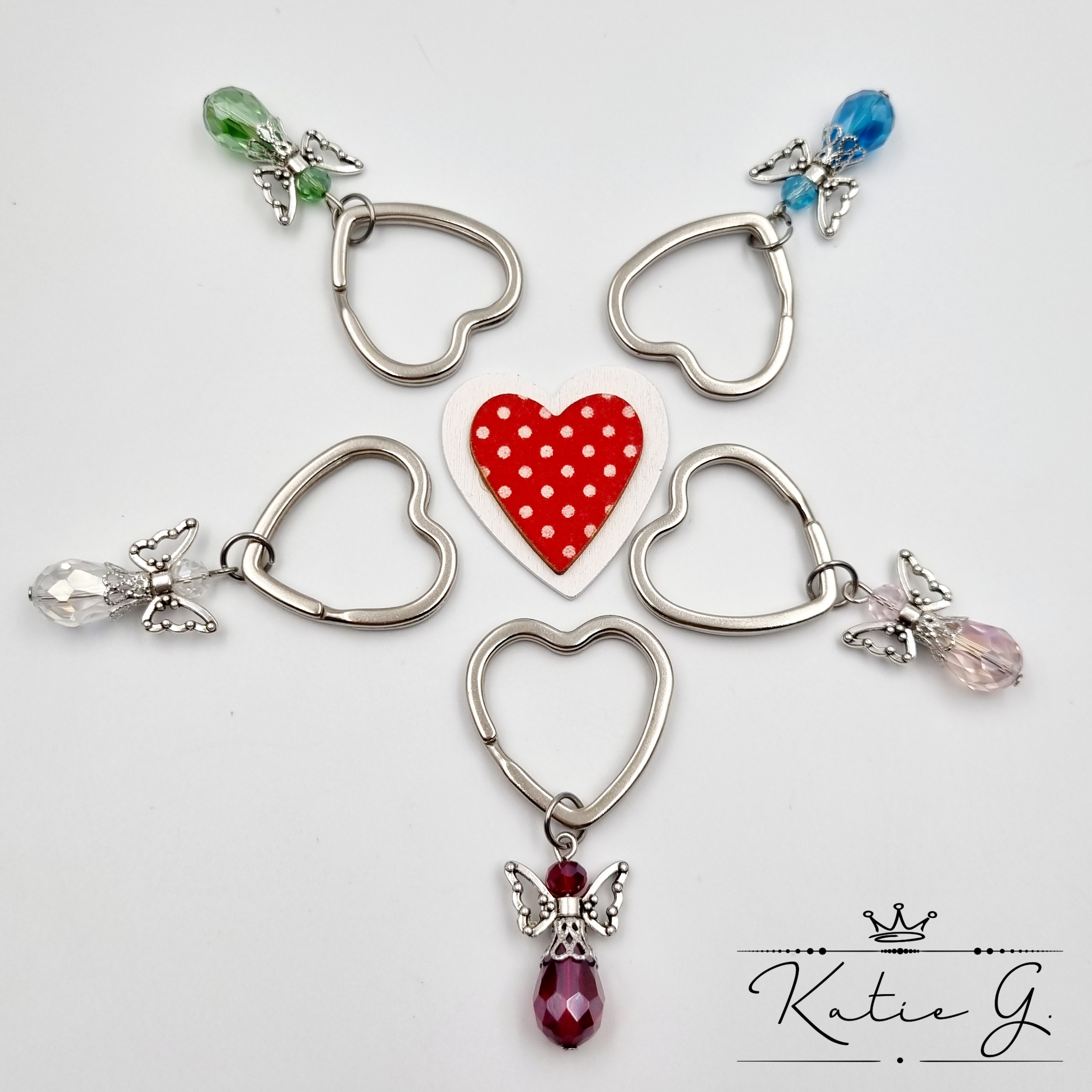 A csomag tartalma: a képen látható 5 db angyalkás szív kulcstartó (piros, rózsaszín, kék, zöld, és áttetsző színek)