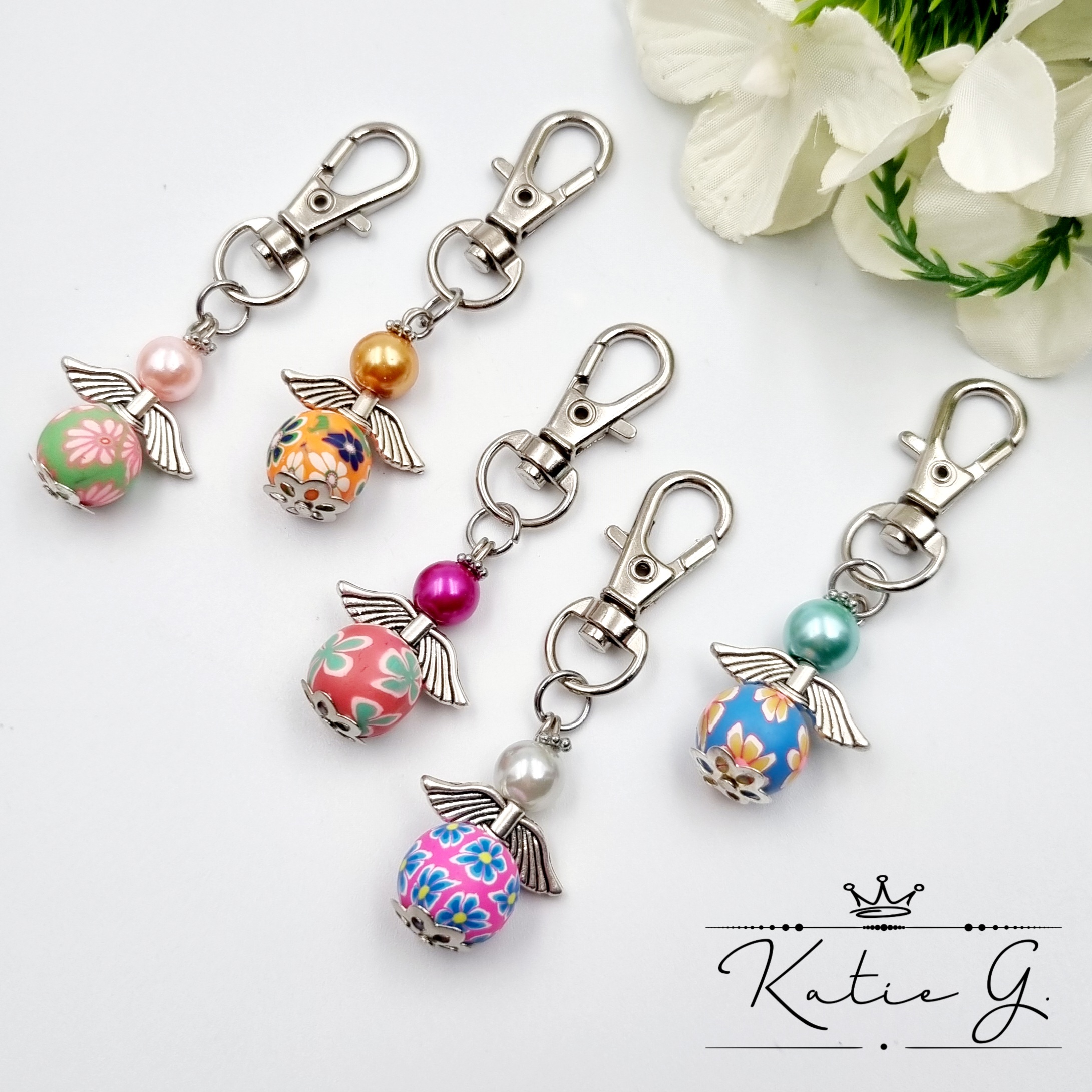 5 db virágos gyöngy angyalka karabíneres kulcstartó - vegyes szín
