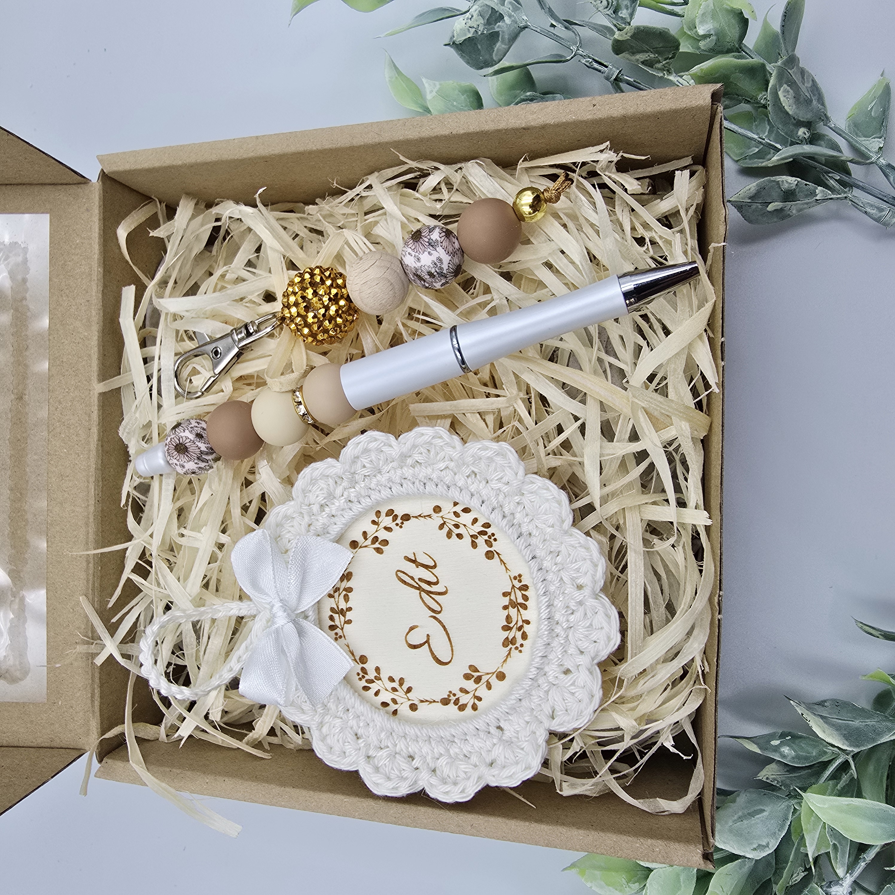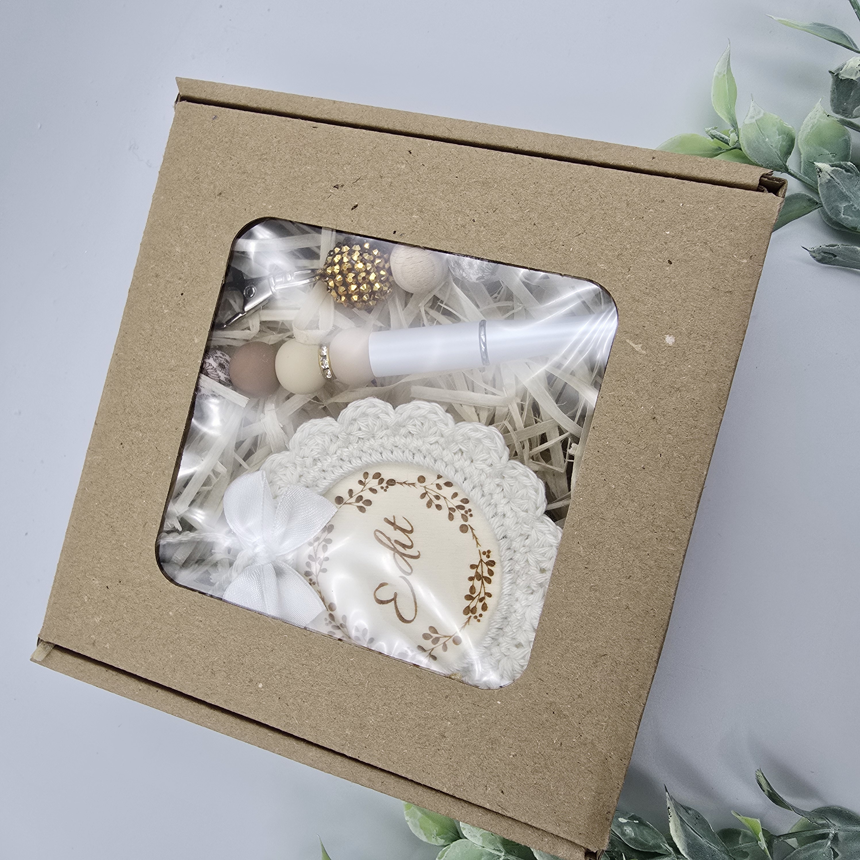 Ez a kézműves karácsonyi ajándékdoboz különleges és személyes választás, ha szerettednek, barátnődnek vagy tanárodnak keresel szívhez szóló ajándékot. A gravírozott horgolt dísz és az összehangolt kiegészítők harmonikus, ünnepi hangulatot teremtenek.