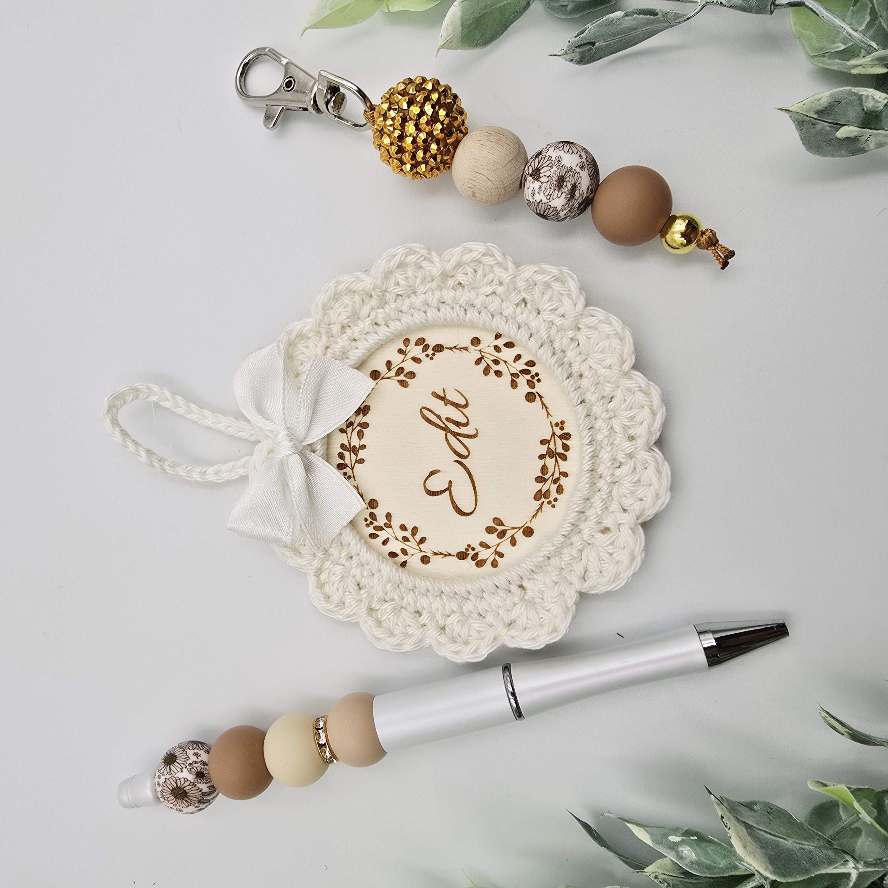 Személyre szabható: a fa korongra gravírozható név vagy rövid szöveg, a horgolt szegély színe pedig választható a legördülő menüben (törtfehér, rózsaszín, almapiros, bézs, szürke). A díszre kerülő nevet vagy rövid szöveget a kosárba tétel után, a kosárnál található megjegyzés rovatba írd be.