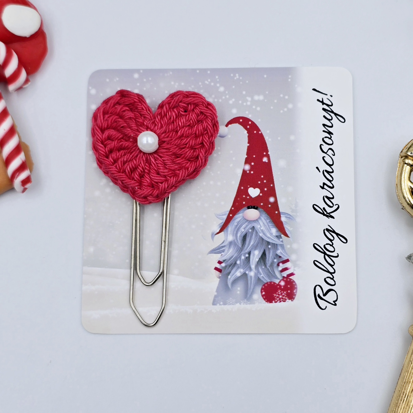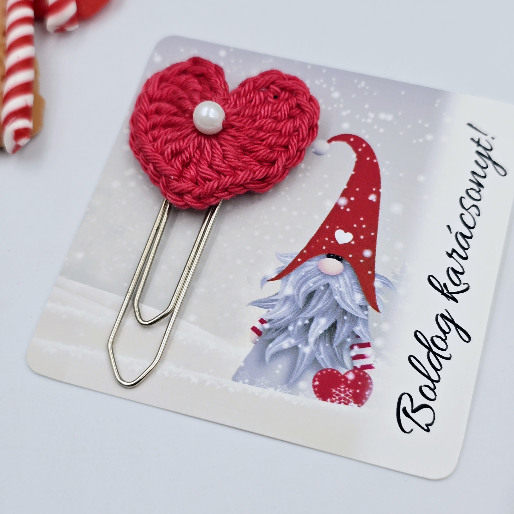 Kezdőlap » Apró ajándékok - minden 990 Ft » Almapiros horgolt szivecskés könyvjelző óriás gémkapoccsal, ajándékkártyán