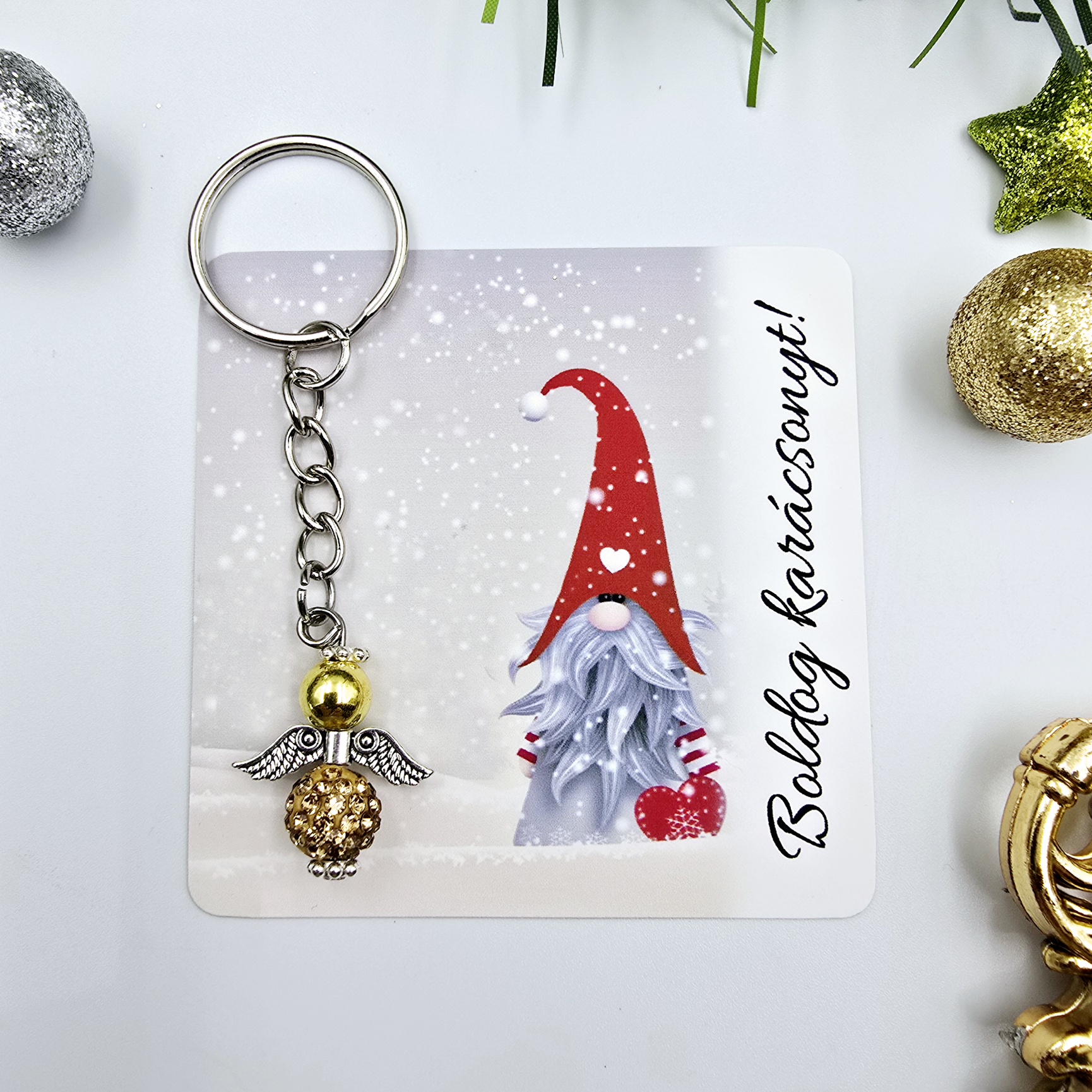 Ez a különleges karácsonyi angyalka kulcstartó tökéletes választás szeretteink számára, akik értékelik az egyedi és kézzel készített ajándékokat. Az angyalka mérete kb. 2,8 cm. A kulcstartót egy karácsonyi ajándékkártyával szállítjuk, melyen a "Boldog karácsonyt!" üzenet olvasható. (Egyedi, személyre szabható felirat ennél a terméknél nem kérhető.)