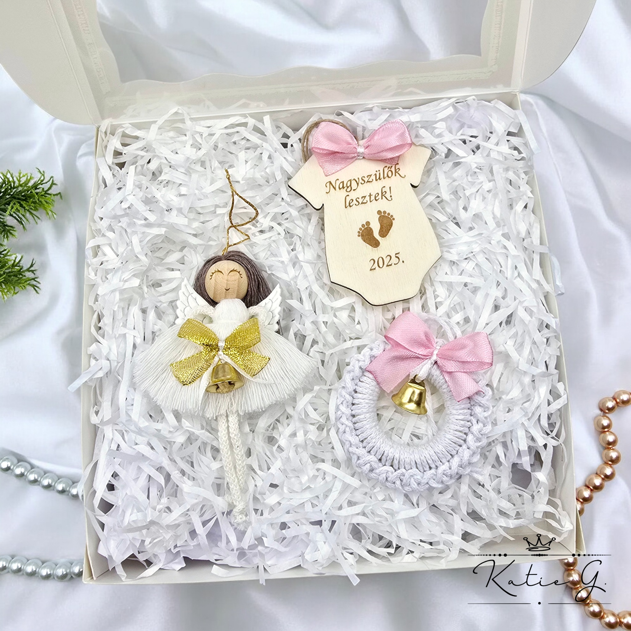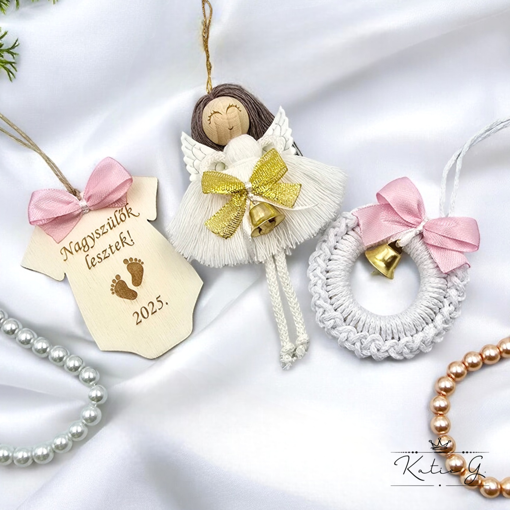 Egy kisgyermek érkezése a legcsodálatosabb dolog, ami történhet! Sokszor alakul úgy , hogy a bababejelentés megható pillanatát a karácsonyi ünnepekre időzítik a leendő szülők. Mindenképp valami különleges, maradandó ajándék illik ehhez a magasztos pillanathoz. Az egyedi kézműves makramé angyalkával és a horgolt illetve egyedi felirattal gravírozott karácsonyfadísszel méltó módon tudatlanok a családdal, hogy jövőre már eggyel többen lesztek.