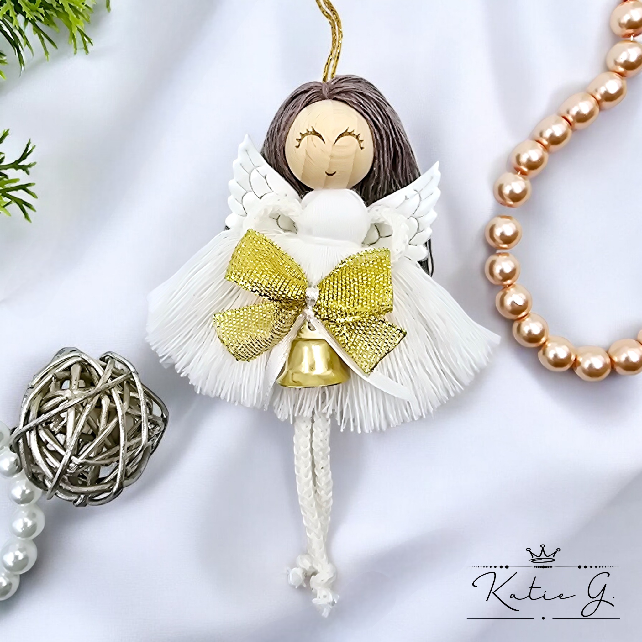 Karácsonyi ajándékbox – Makramé angyalka csengettyűvel + egyedi feliratos gravírozott karácsonyfadísz, + kézműves horgolt karácsonyfadísz