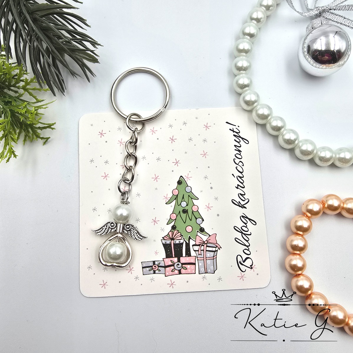 Ez a különleges karácsonyi angyalka kulcstartó tökéletes választás szeretteink számára, akik értékelik az egyedi és kézzel készített ajándékokat. Az angyalka mérete kb. 2,8 cm. A kulcstartót egy karácsonyi ajándékkártyával szállítjuk, melyen a "Boldog karácsonyt!" üzenet olvasható. (Egyedi, személyre szabható felirat ennél a terméknél nem kérhető.)