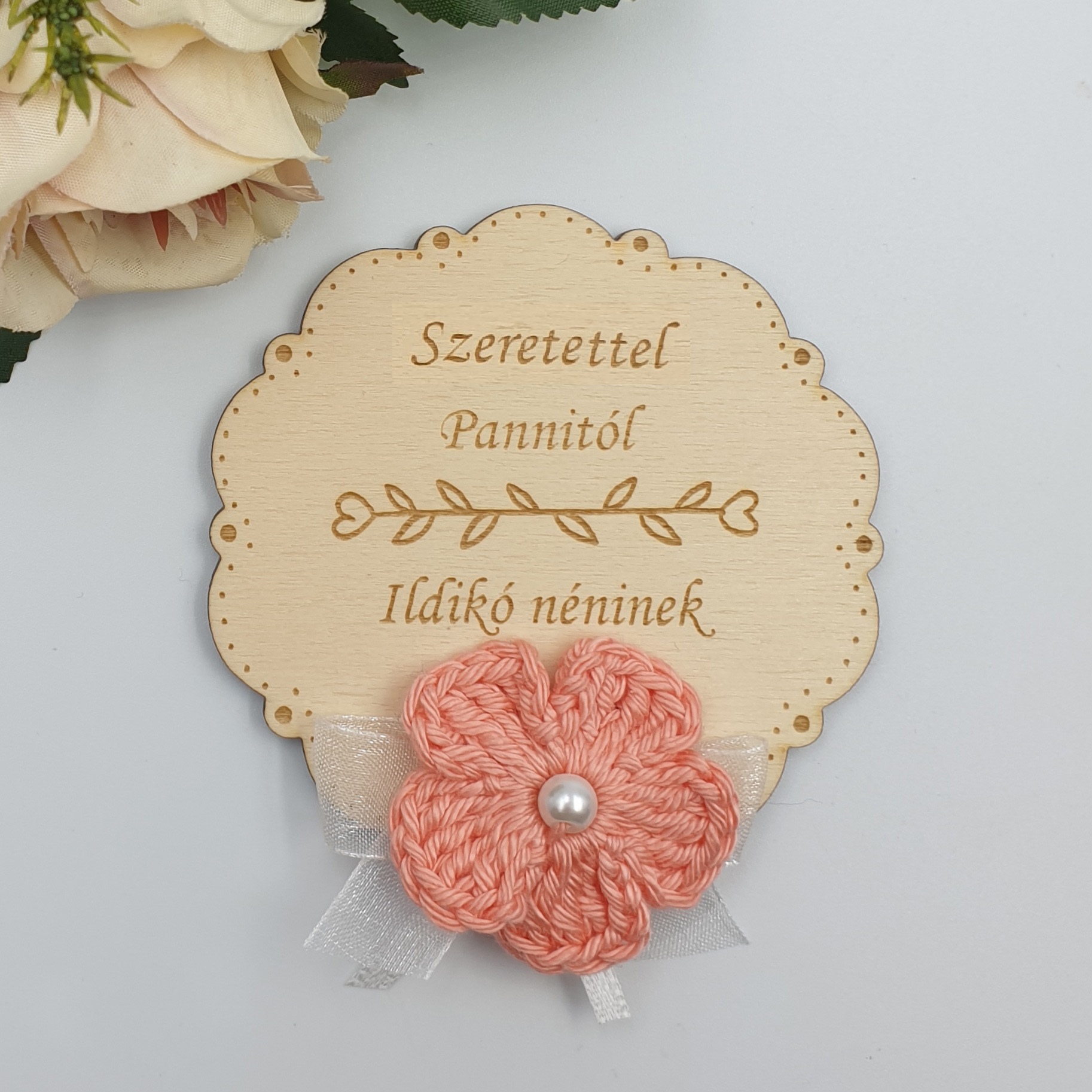 Kezdőlap » Ajándék óvó néninek » Gravírozott fa hűtőmágnes egyedi felirattal, horgolt virággal (20 féle szín)