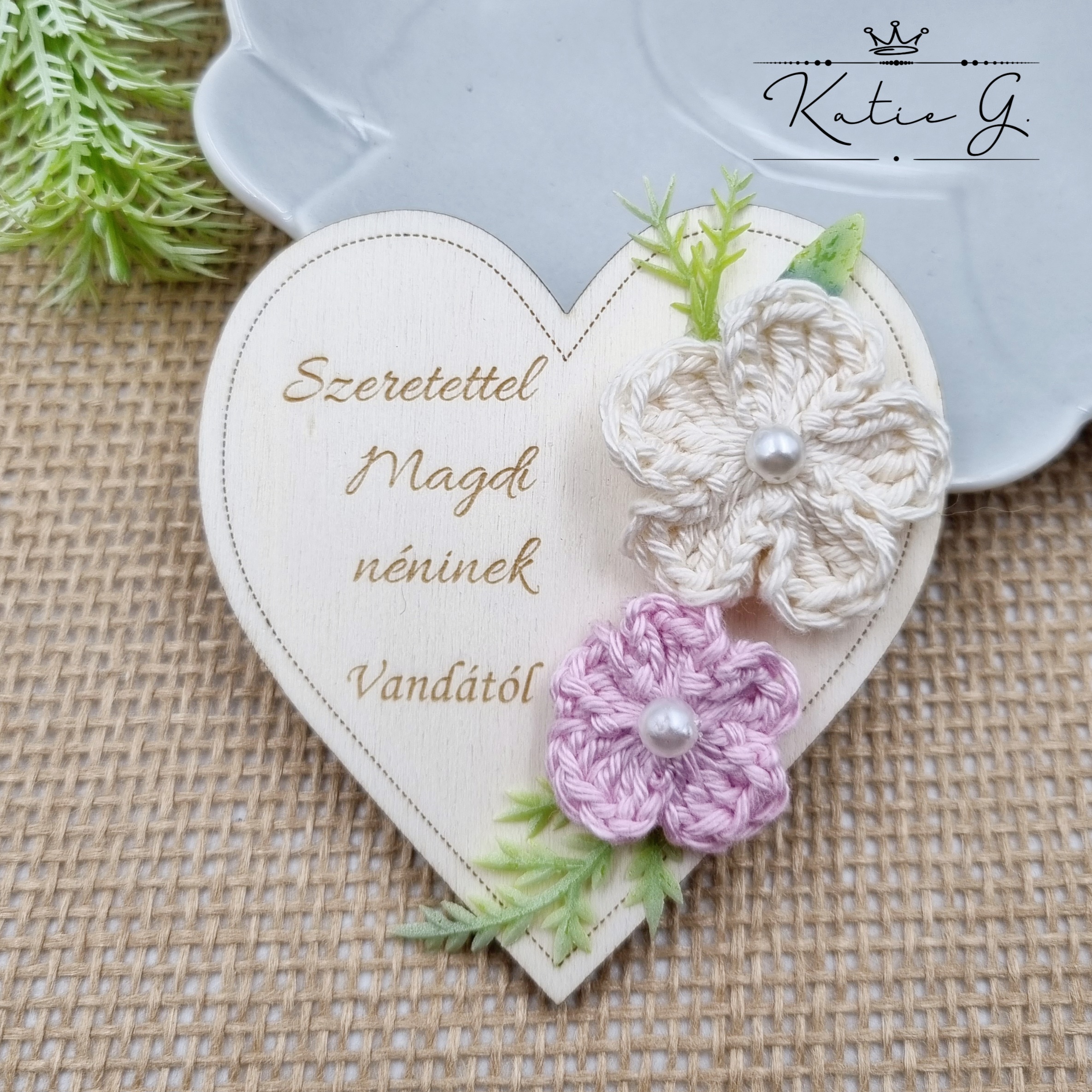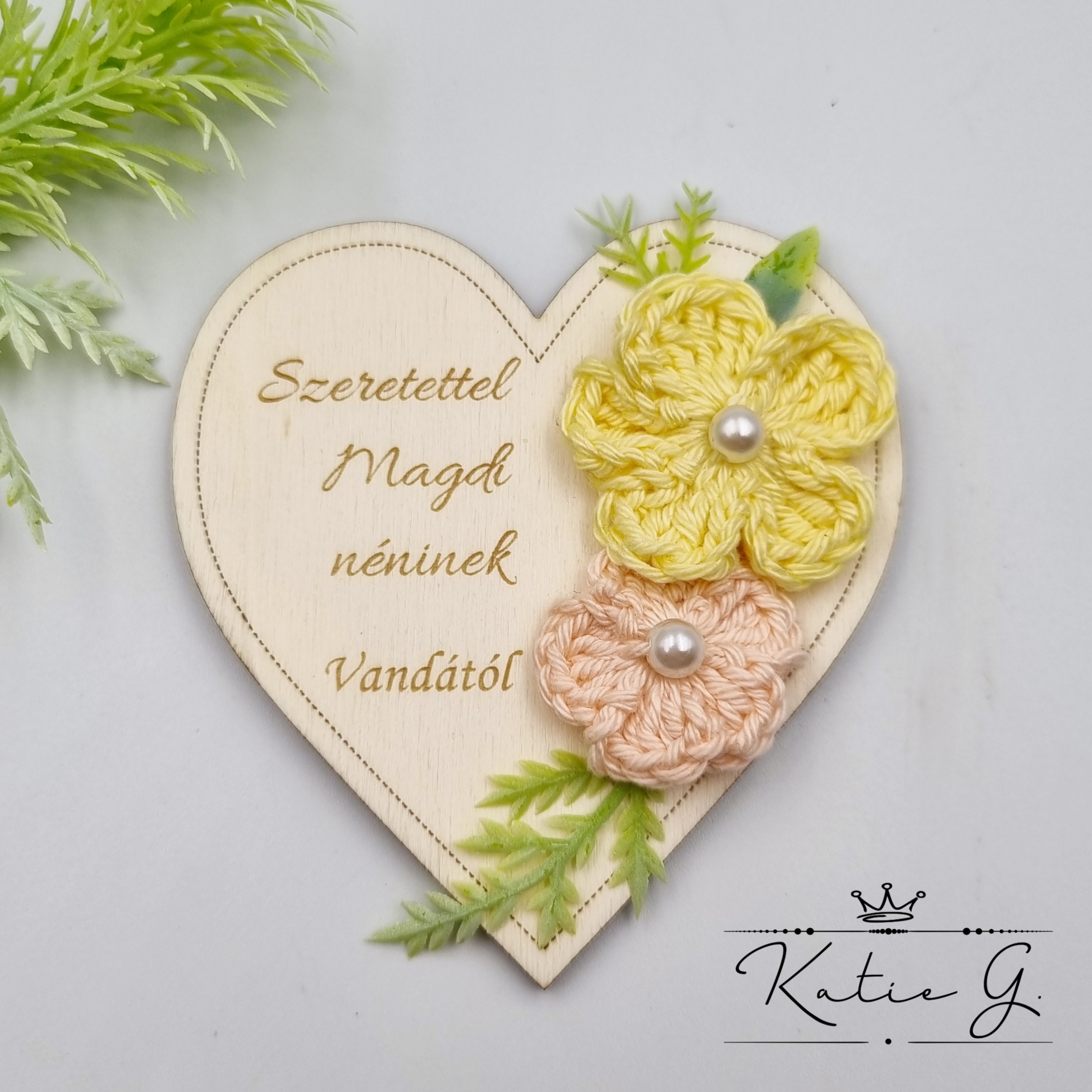 Gravírozott fa hűtőmágnes egyedi felirattal, horgolt virágokkal (20 féle szín)
