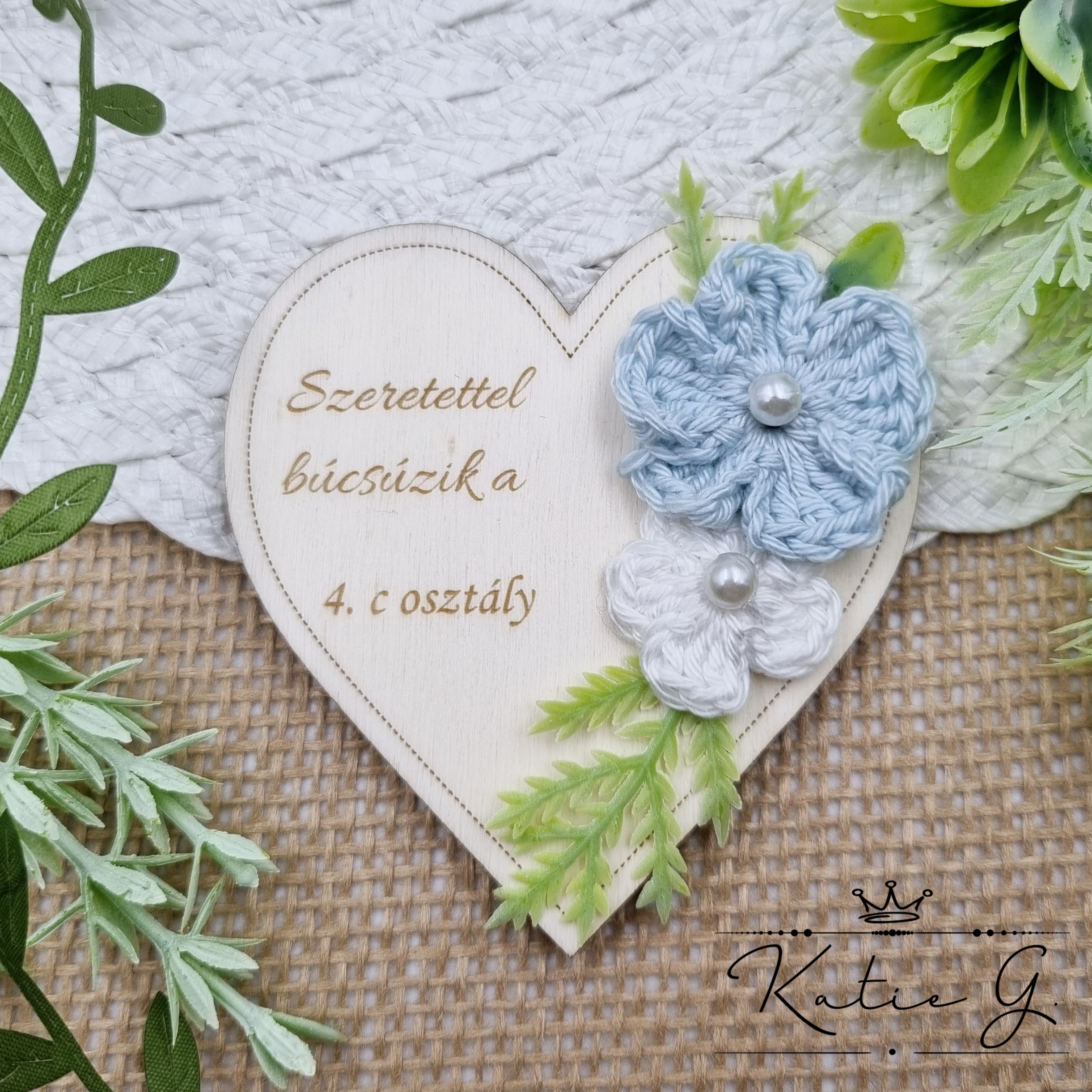 Kezdőlap » Ajándék óvó néninek » Gravírozott fa hűtőmágnes egyedi felirattal, horgolt virágokkal (20 féle szín)