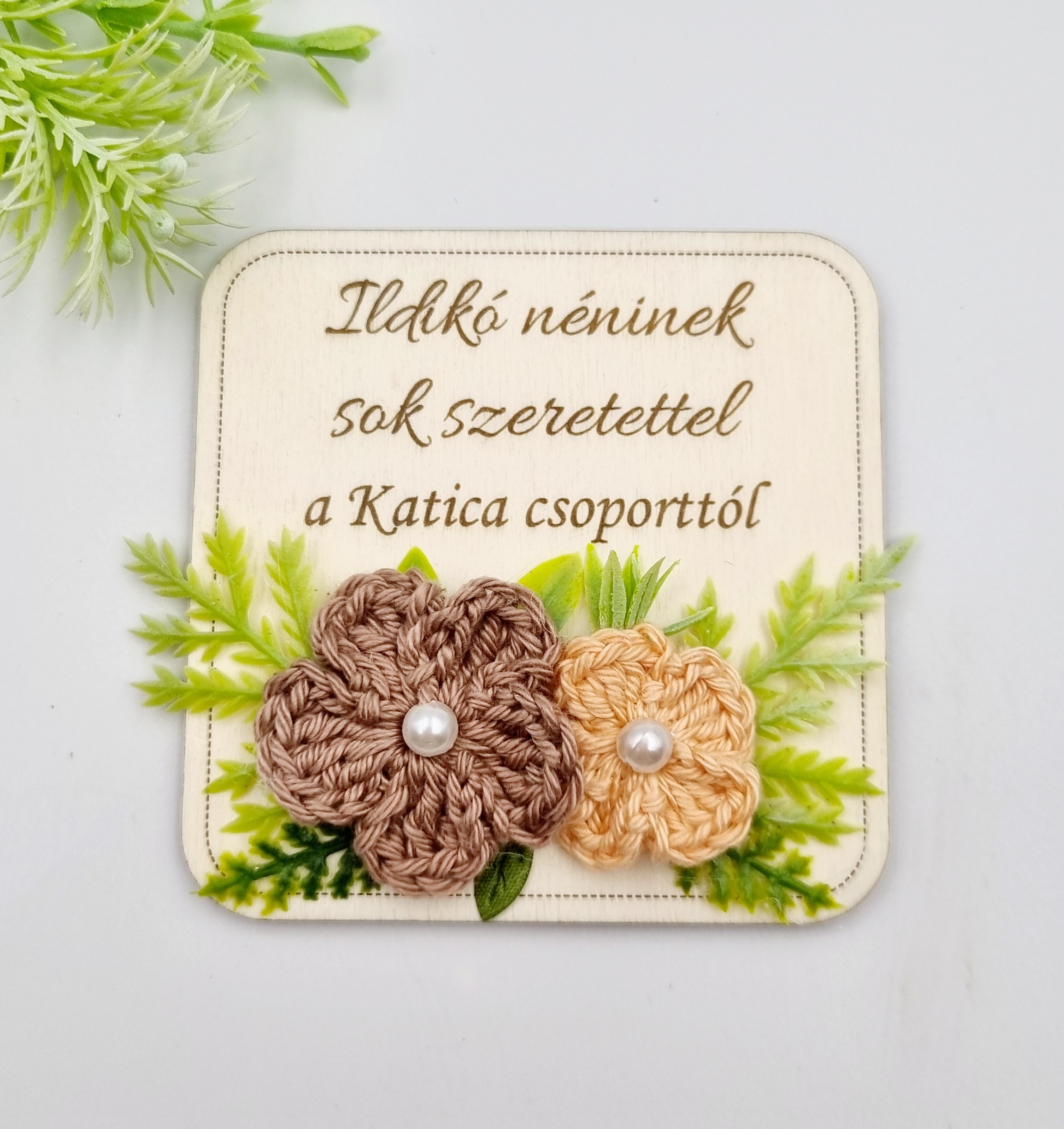 Kezdőlap » Ajándék óvó néninek » Gravírozott fa hűtőmágnes egyedi felirattal, horgolt virágokkal (20 féle szín)