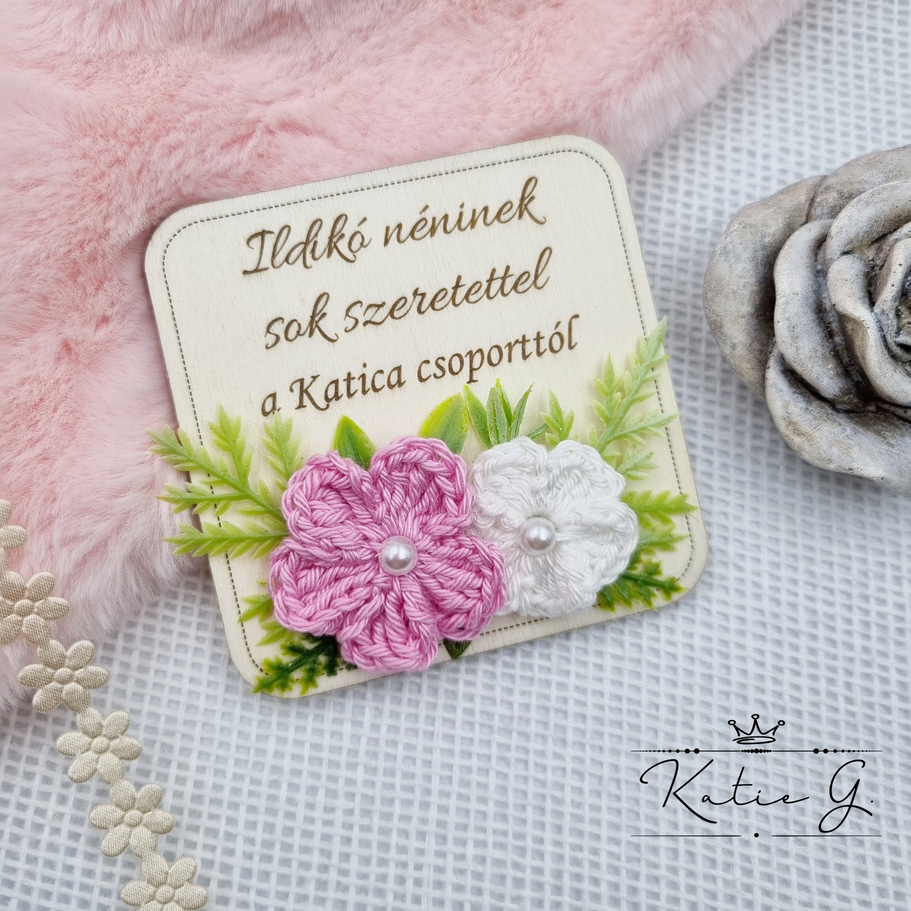 Gravírozott fa hűtőmágnes egyedi felirattal, horgolt virágokkal (20 féle szín)