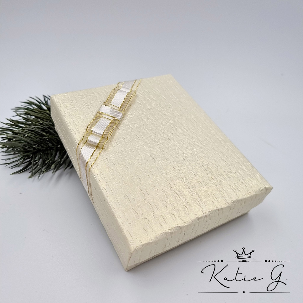 Tipp: kiegészítőként a képen látható díszdoboz, vagy organza ajándékzsák rendelhető fehér színben a kép melletti legördülő menüben.