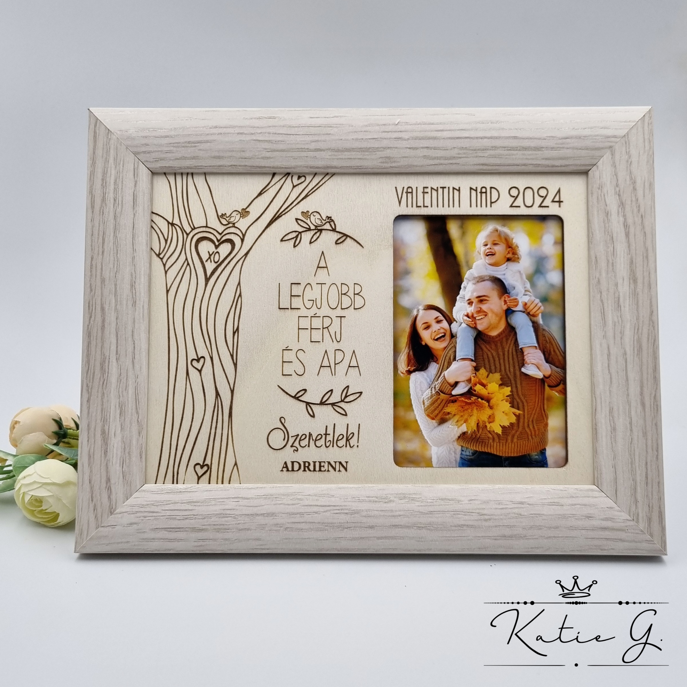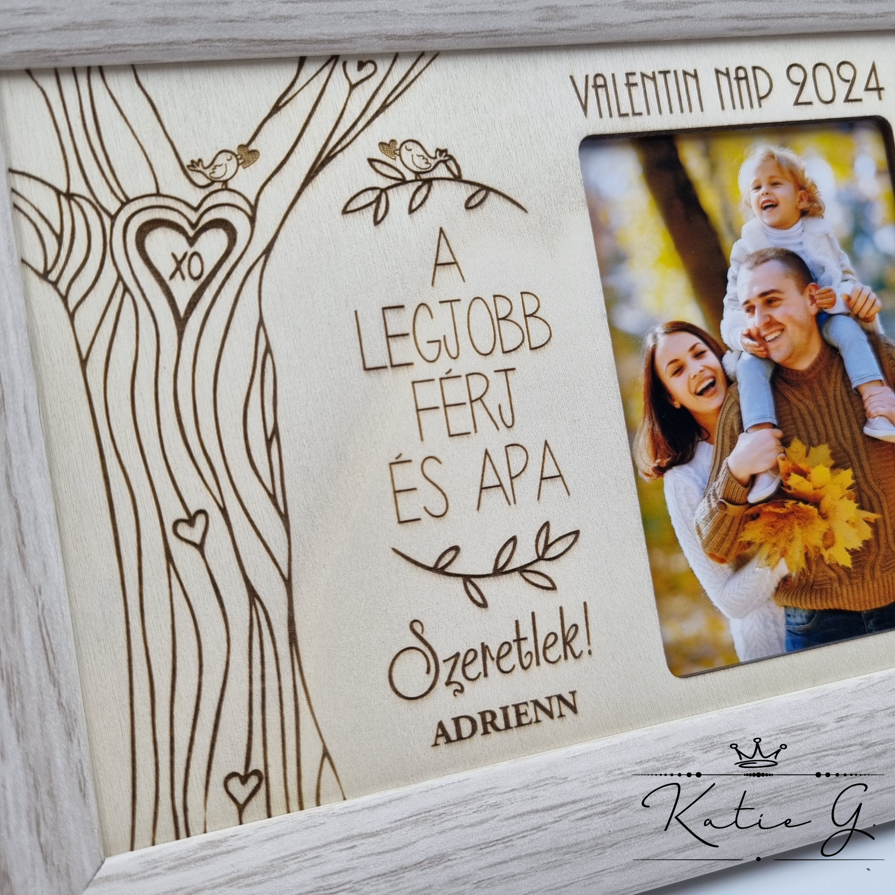 A belső részben látható (A legjobb férj és apa - Szeretlek! Adrienn) felirat szabadon módosítható. A kép felett lévő Valentin nap 2024 felirat is megváltoztatható. A grafikai elemeket (fa, madárka) is rágravírozzuk a termékre.