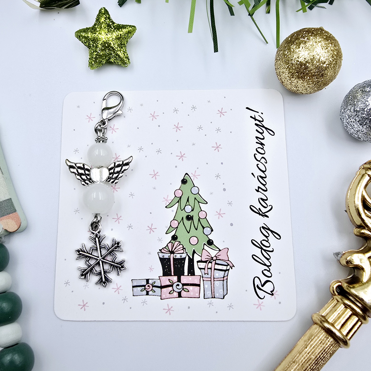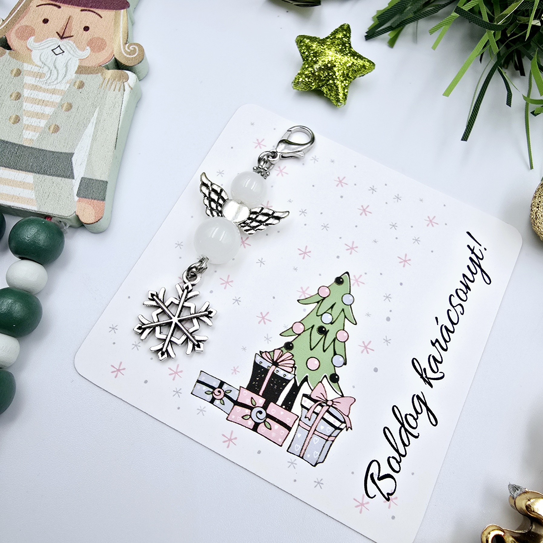Boldog Karácsonyt! Angyalka hópihe charmmal, ajándékkártyán