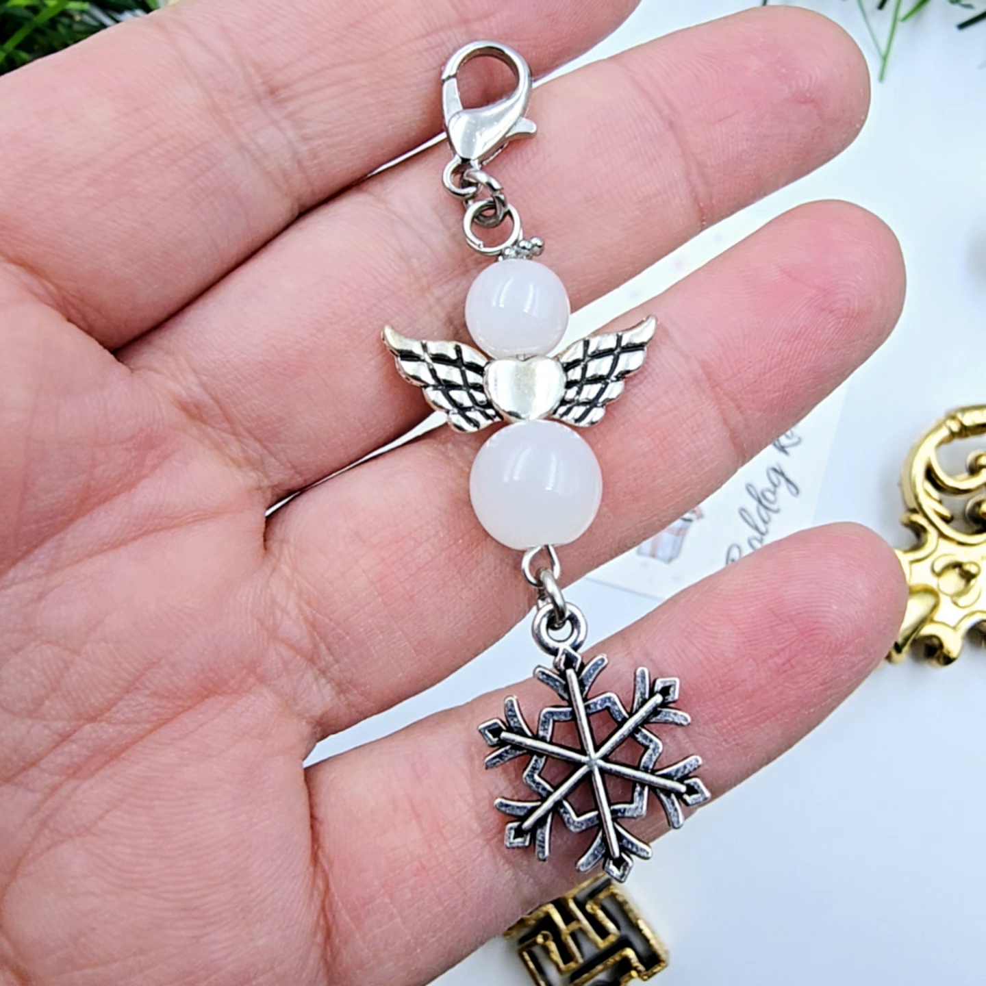 Ez a különleges karácsonyi angyalka dísz tökéletes választás szeretteink számára, akik értékelik az egyedi és kézzel készített ajándékokat. Az angyalka mérete kb. 2,8 cm, teljes hossza a hópihével és karabinerrel együtt kb. 6,8 cm. Az angyalkát finom fehér gyöngyök, és egy elegáns hópihe charm díszíti, amely varázslatos ünnepi hangulatot sugároz. A dísz egy karácsonyi ajándékkártyával szállítjuk, melyen a "Boldog karácsonyt!" üzenet olvasható. (Egyedi, személyre szabható felirat ennél a terméknél nem kérhető.)