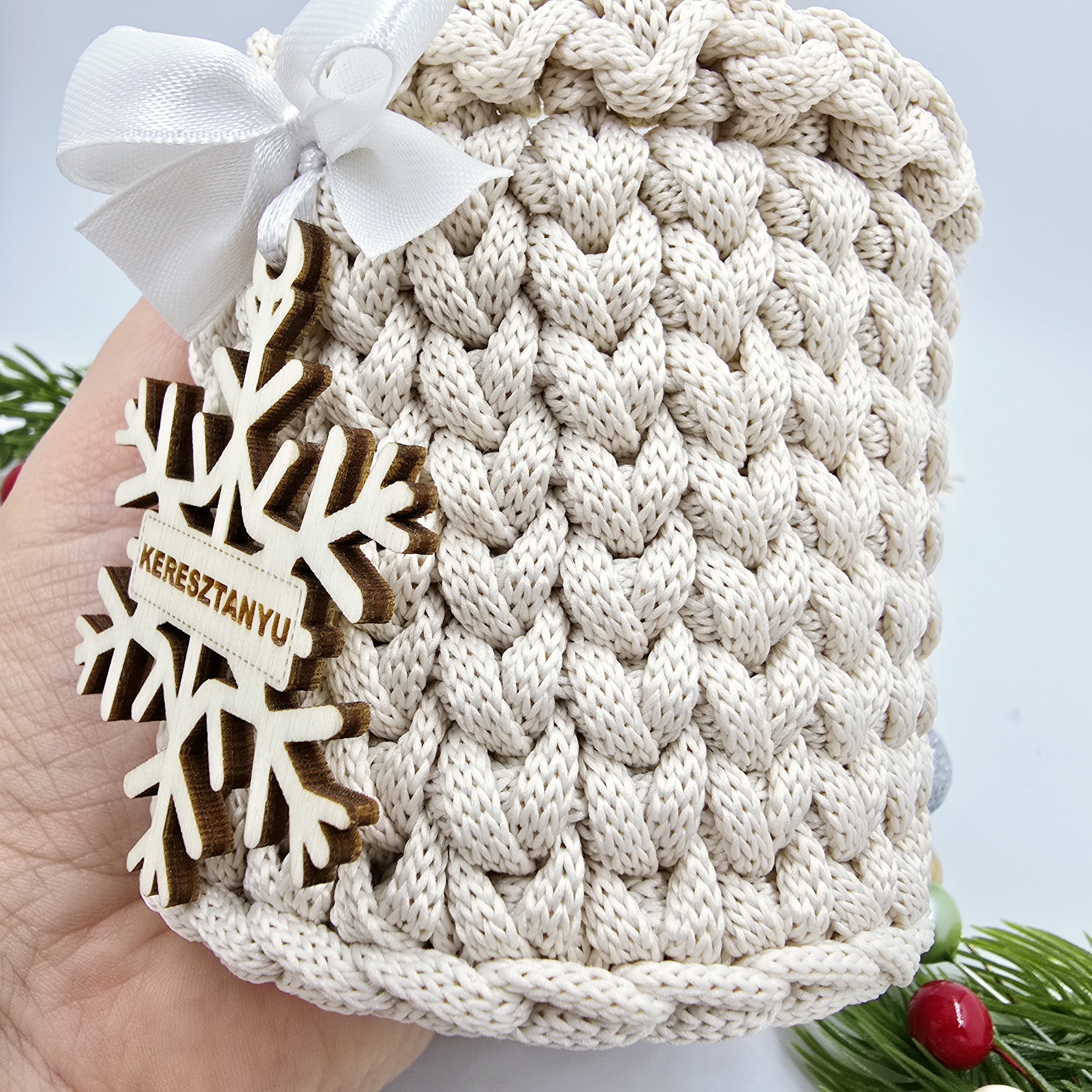 Horgolt karácsonyi gyertyatartó egyedi felirattal