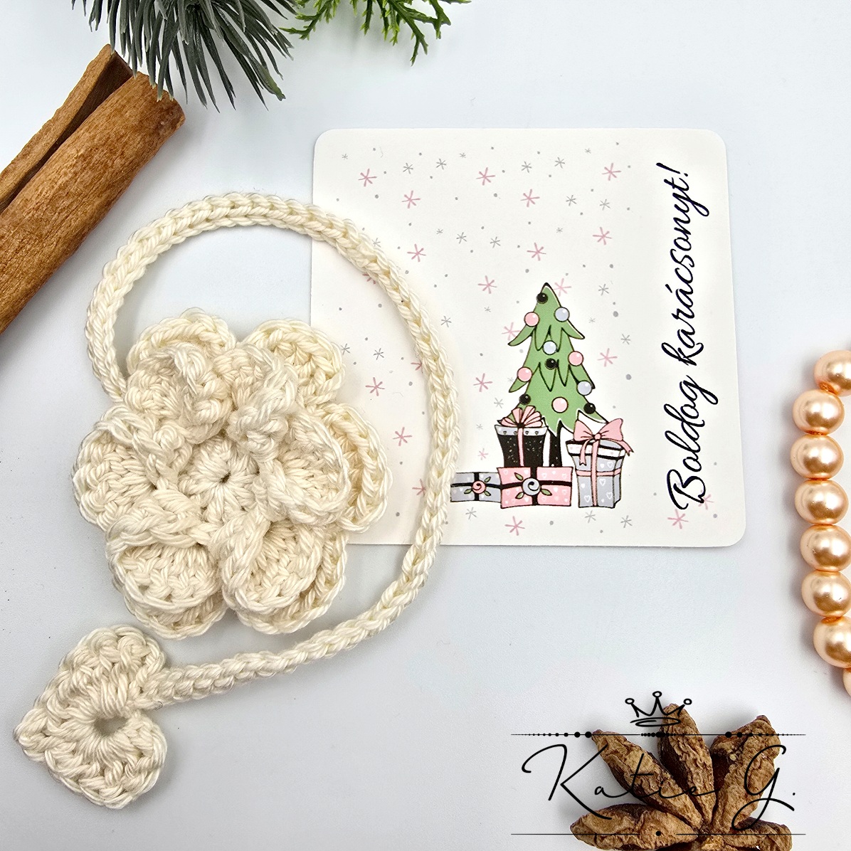 Ez az egyedi, kézzel horgolt könyvjelző tökéletes választás azoknak, akik szeretnek olvasni. A gyönyörű törtfehér virág motívum horgolt pamut fonalból készült, mely 5,5 cm átmérőjű, teljes hossza pedig 28 cm. Elegáns és stílusos, egyedi kialakításának köszönhetően nemcsak praktikus, de dekoratív kiegészítője lehet a könyveknek. A könyvjelzőt egy ünnepi karácsonyi ajándékkártyával együtt szállítjuk, amelyen a „Boldog karácsonyt!” felirat található, így tökéletes választás karácsonyi ajándékként is. (Egyedi, személyre szabható felirat ennél a terméknél nem kérhető.)
