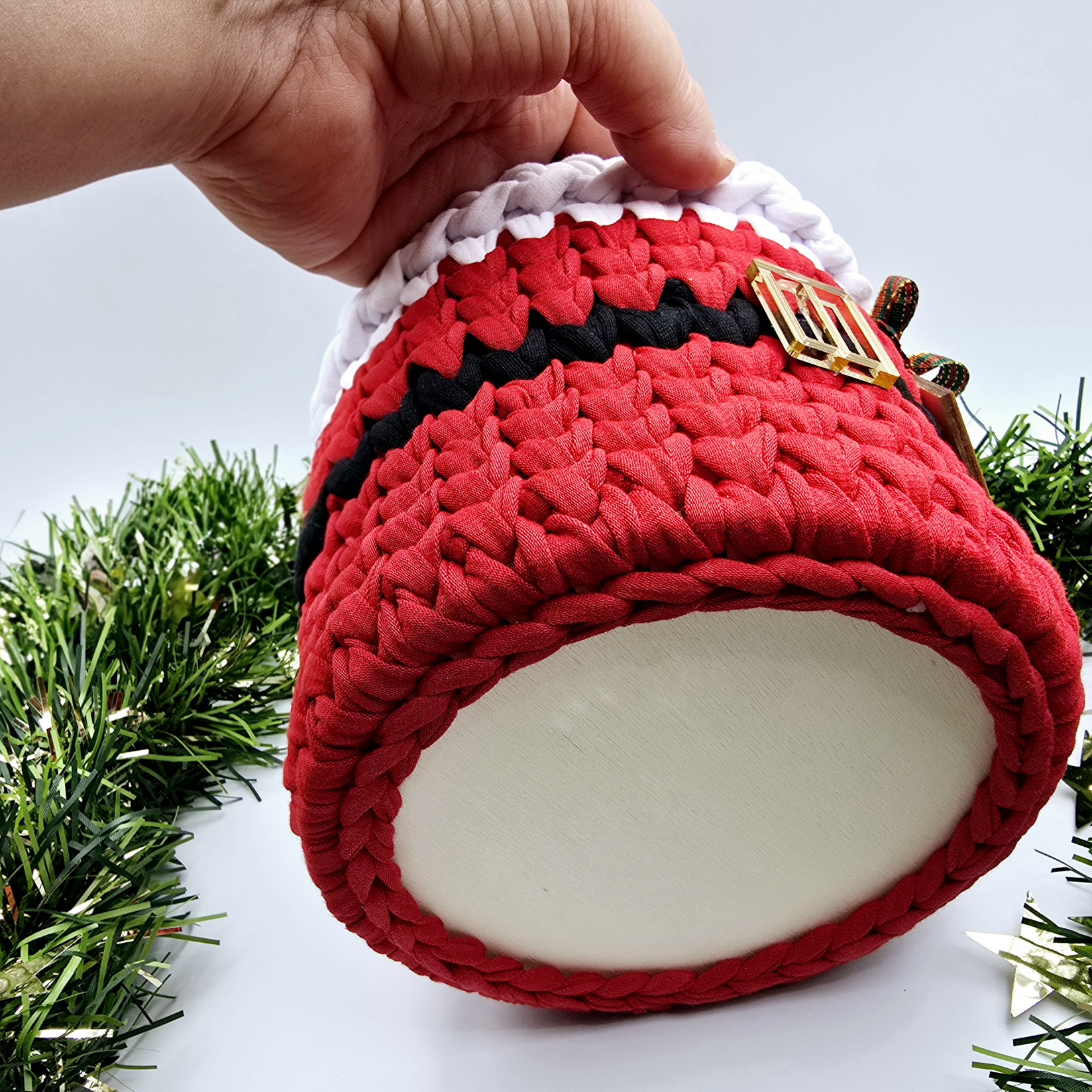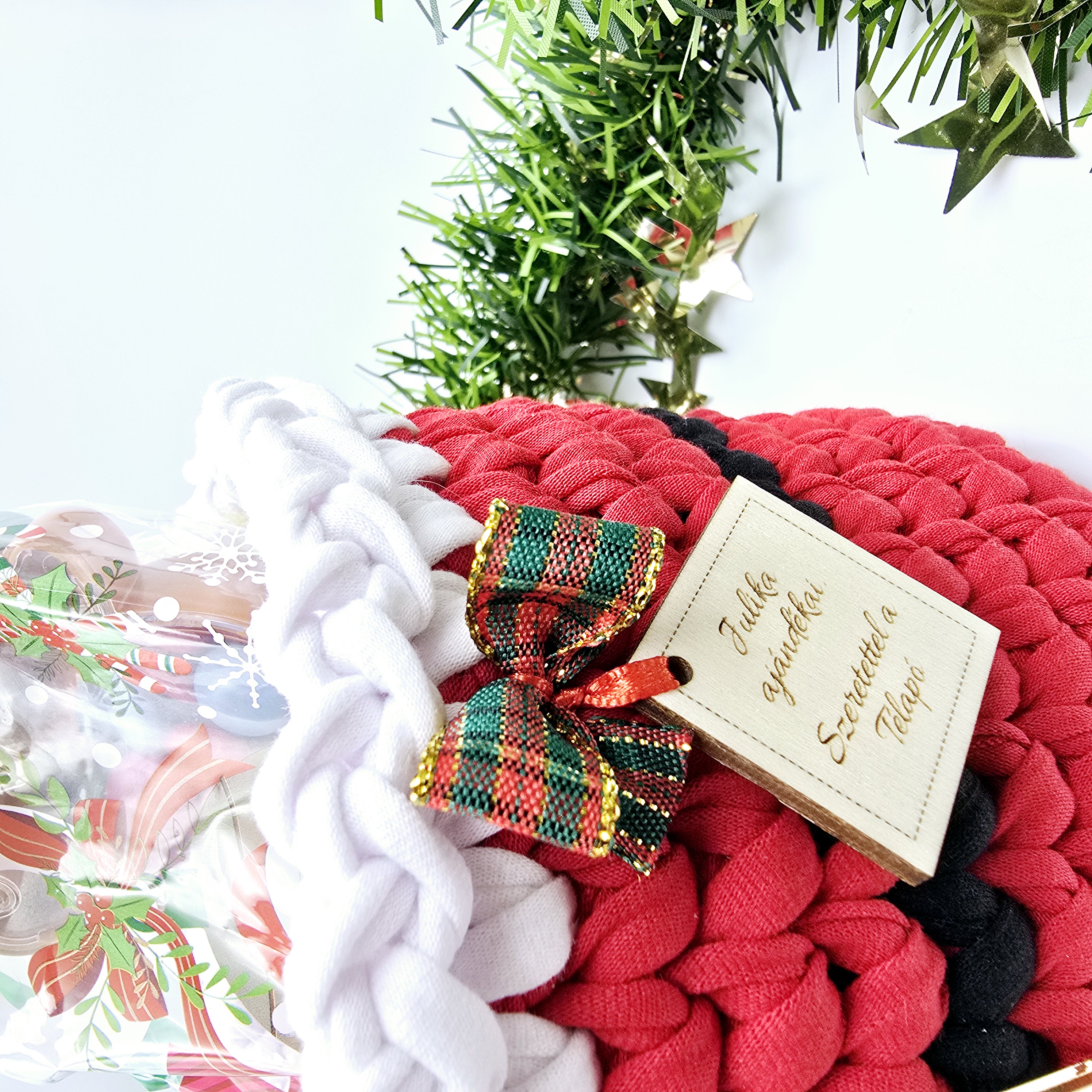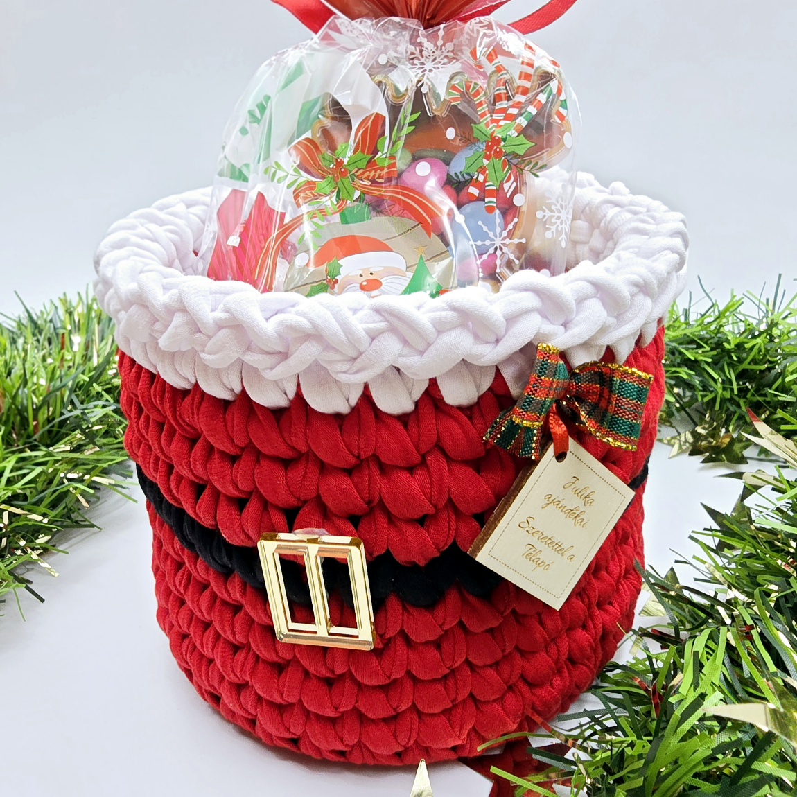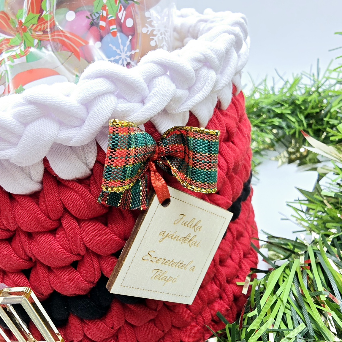 Kezdőlap » Kézműves ajándékok » Horgolt tárolókosarak » Horgolt mikulás tárolókosár, szaloncukortartó egyedi felirattal (087)