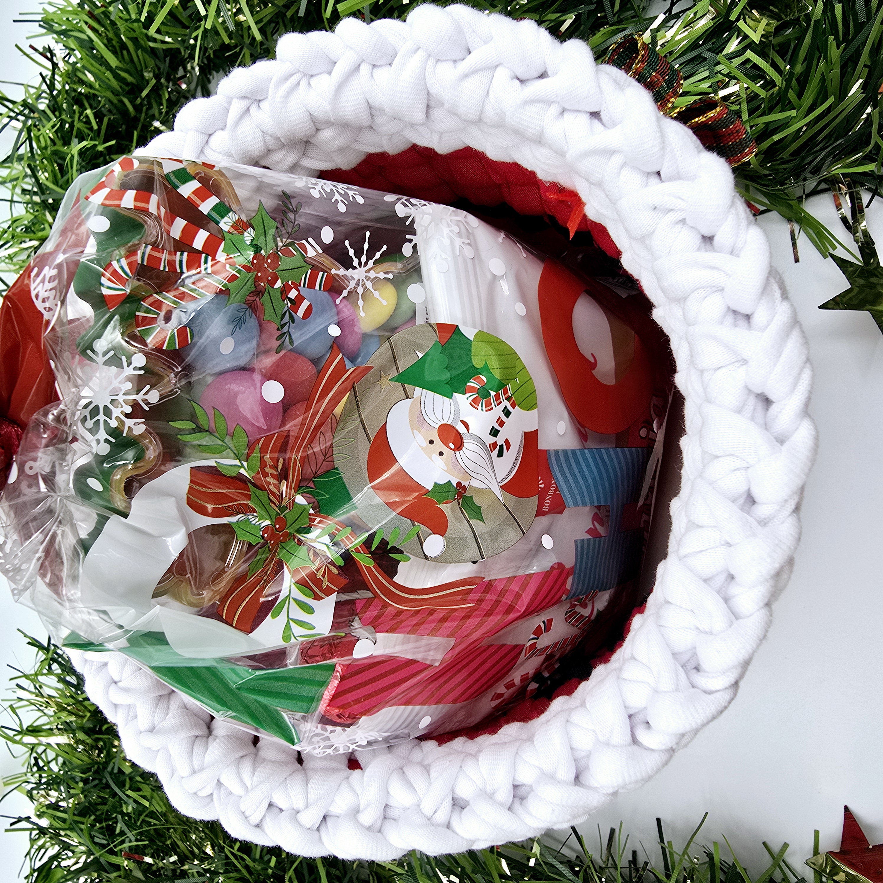 A fotón látható ajándékok a kosárban csak illusztráció, a termék megvásárlásakor csak a horgolt kosarat küldjük.