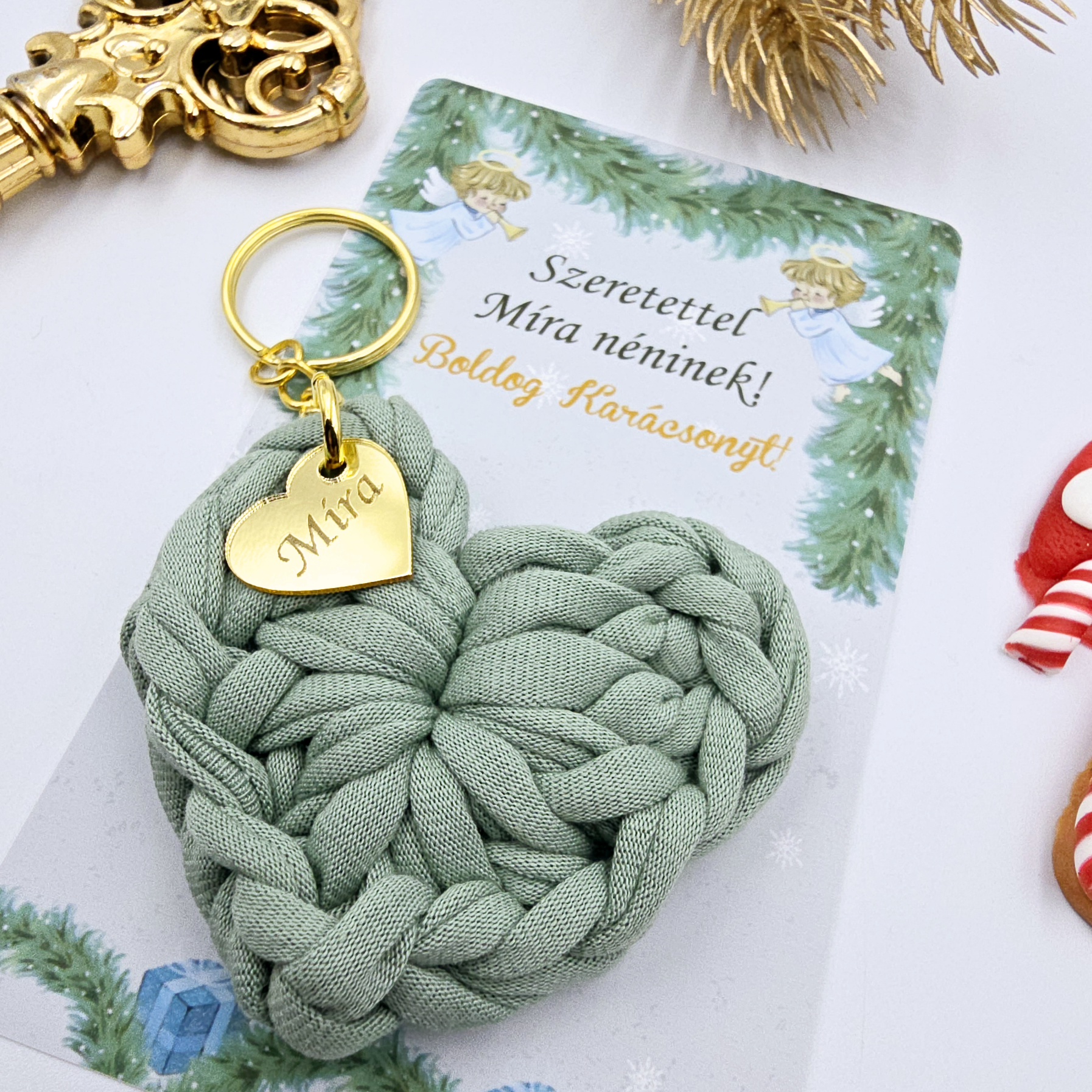Kezdőlap » Kézműves ajándékok karácsonyra » Horgolt szív kulcstartó gravírozott medállal, egyedi karácsonyi ajándékkártyán- 15 (több szín)