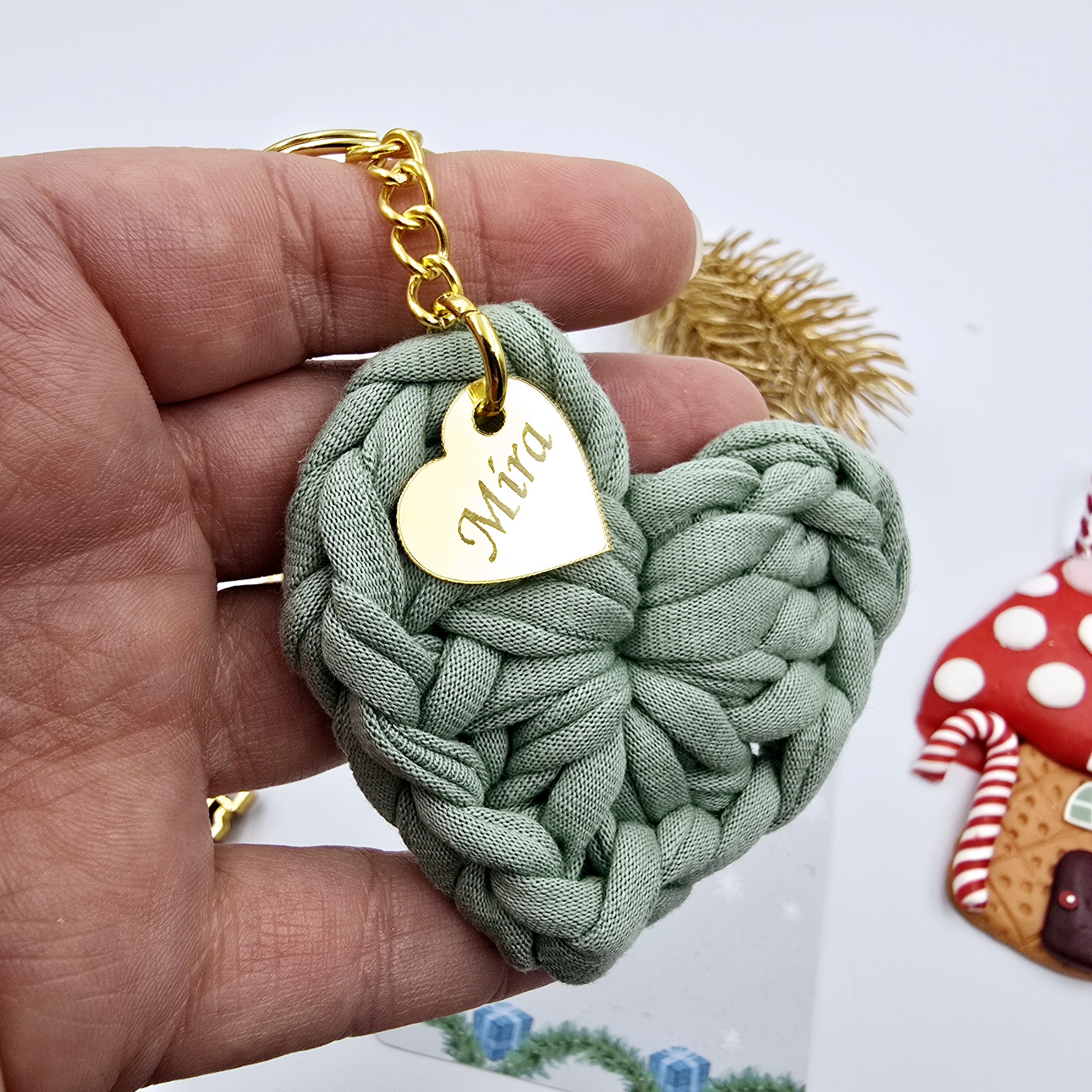 Horgolt szív kulcstartó gravírozott medállal, egyedi karácsonyi ajándékkártyán- 15 (több szín)