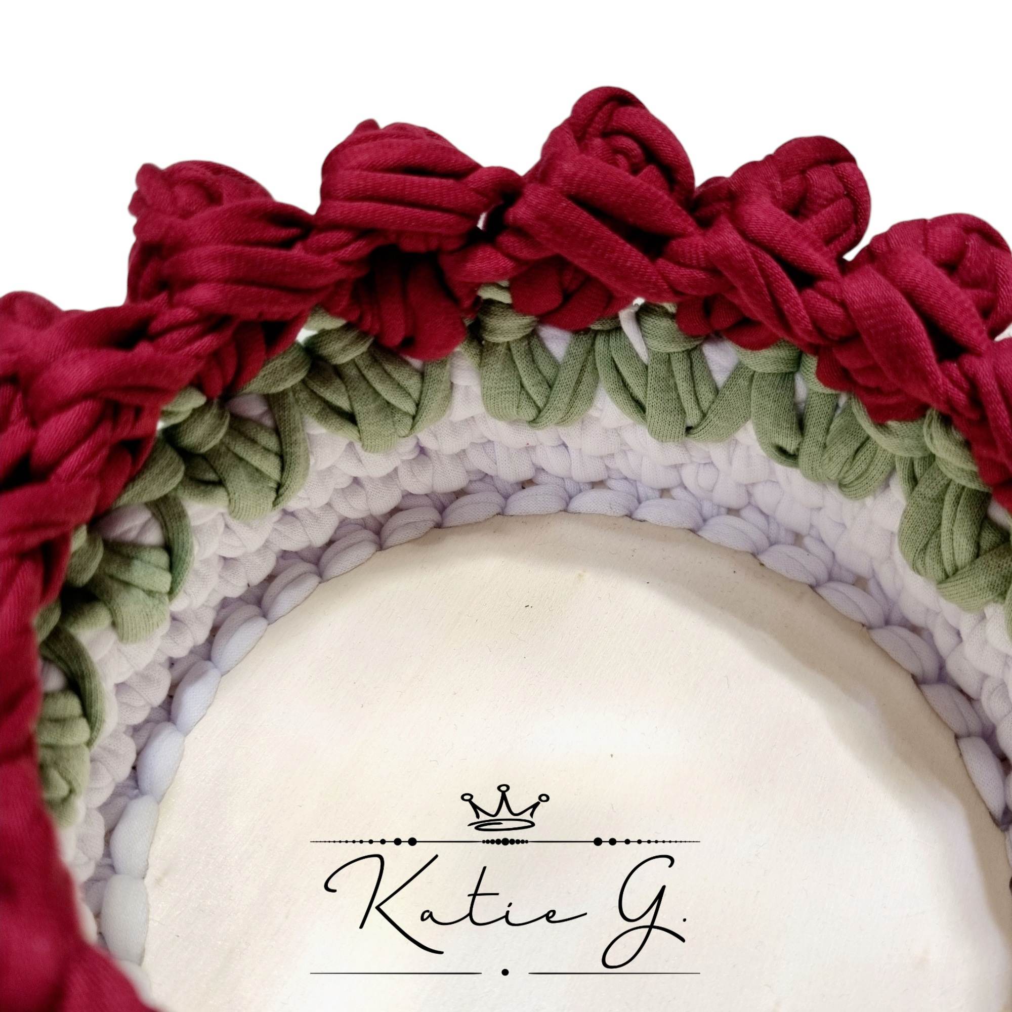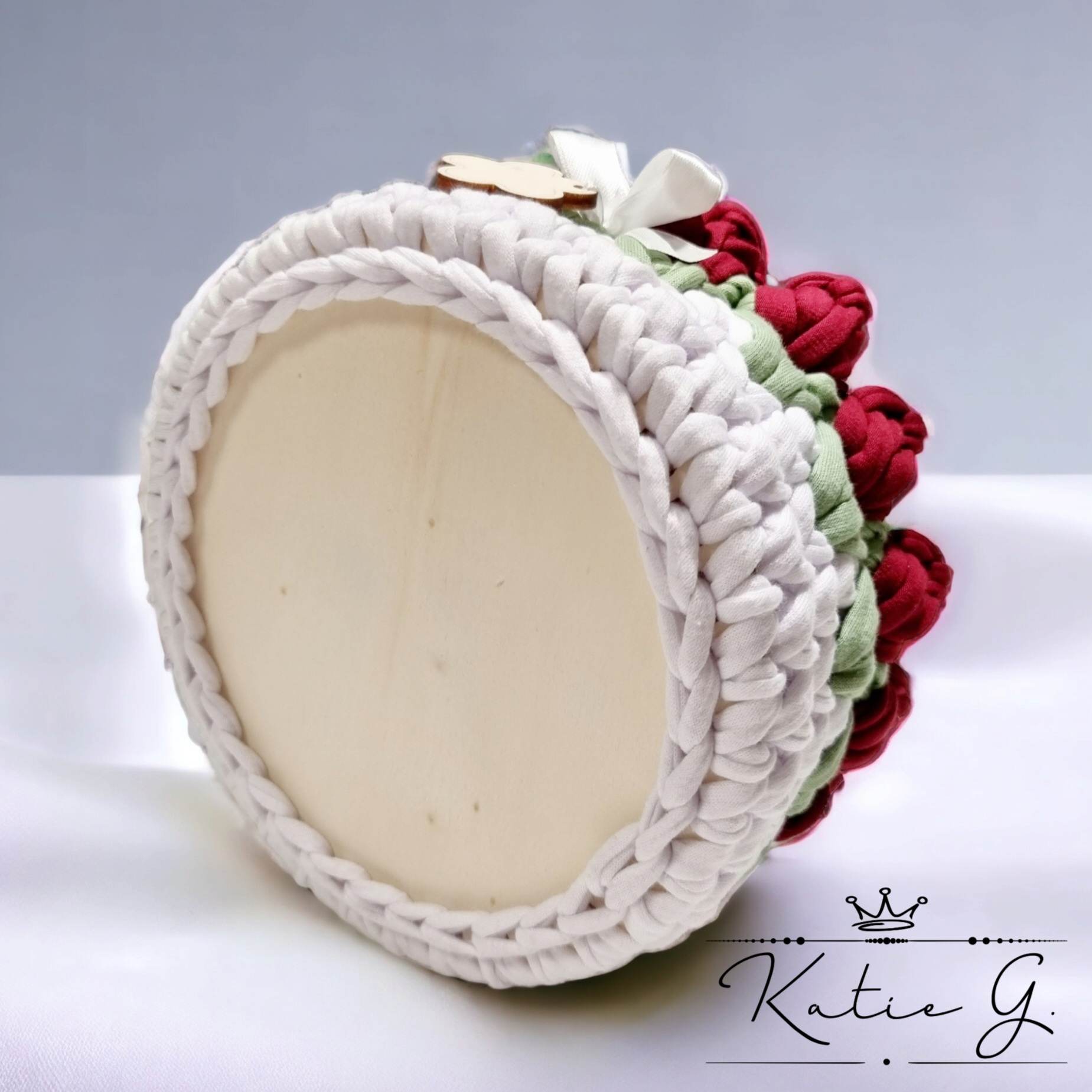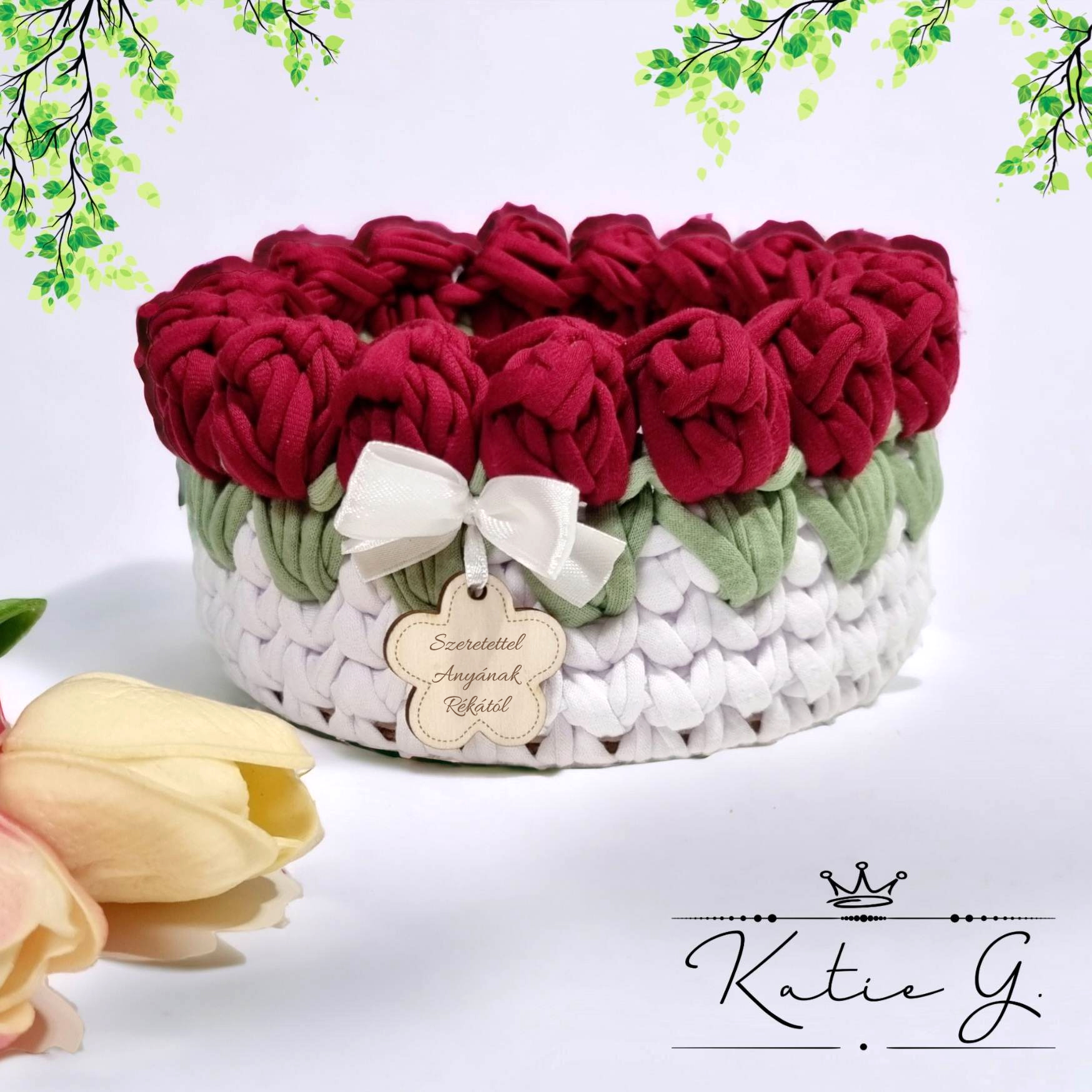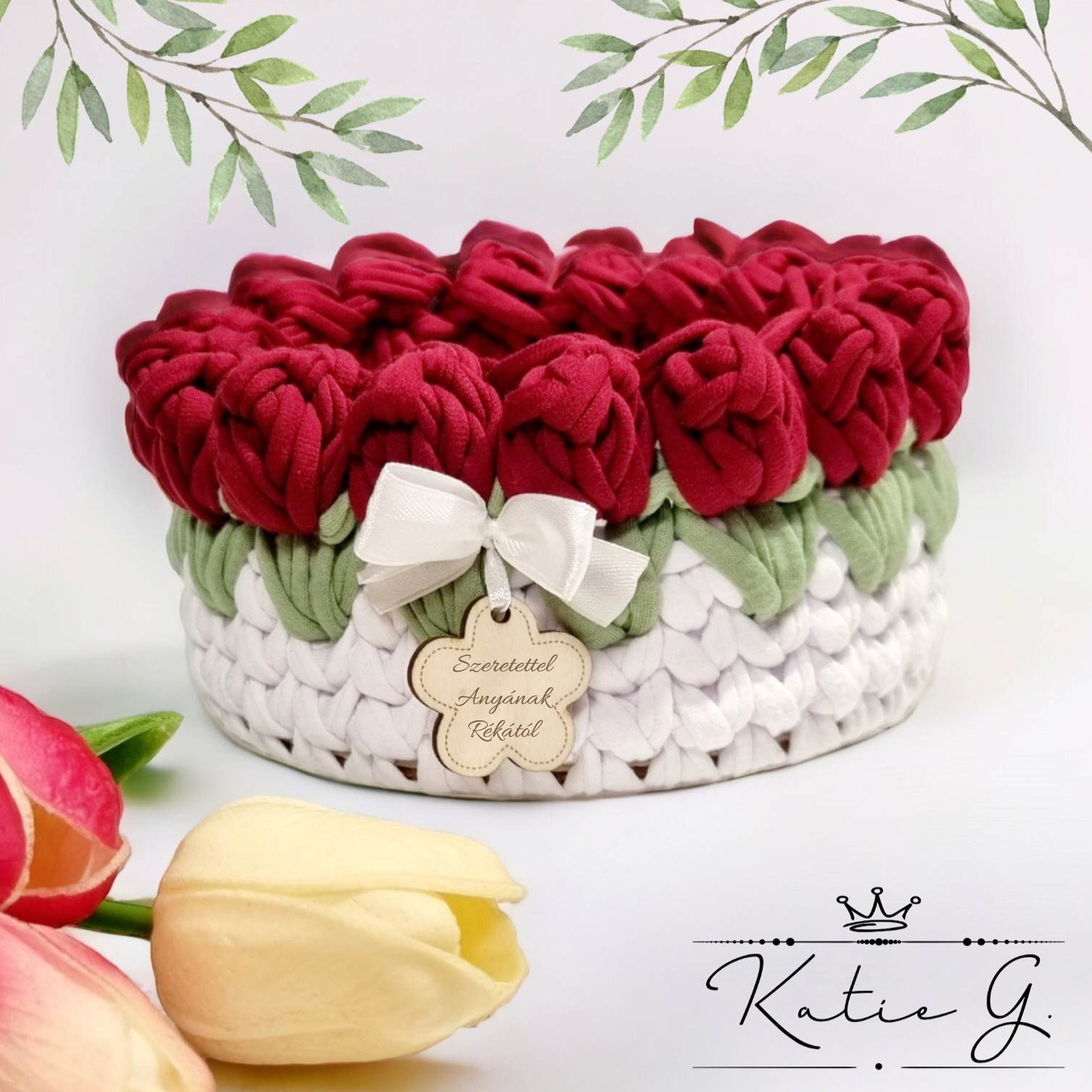 Kezdőlap » Kézműves ajándékok » Horgolt tárolókosarak » Horgolt tulipános tárolókosár egyedi felirattal (bordó)