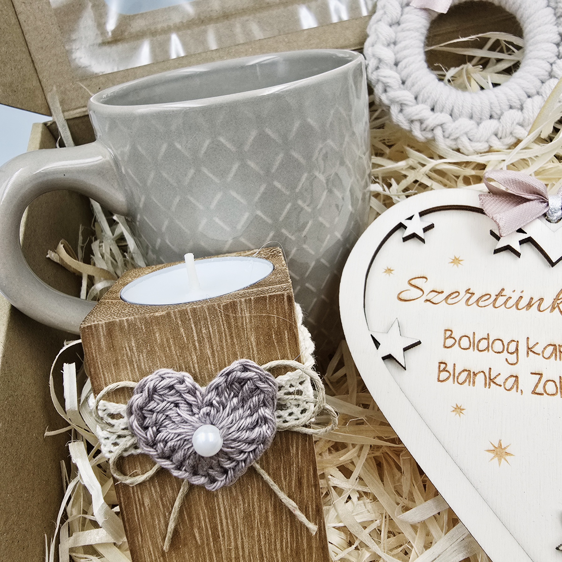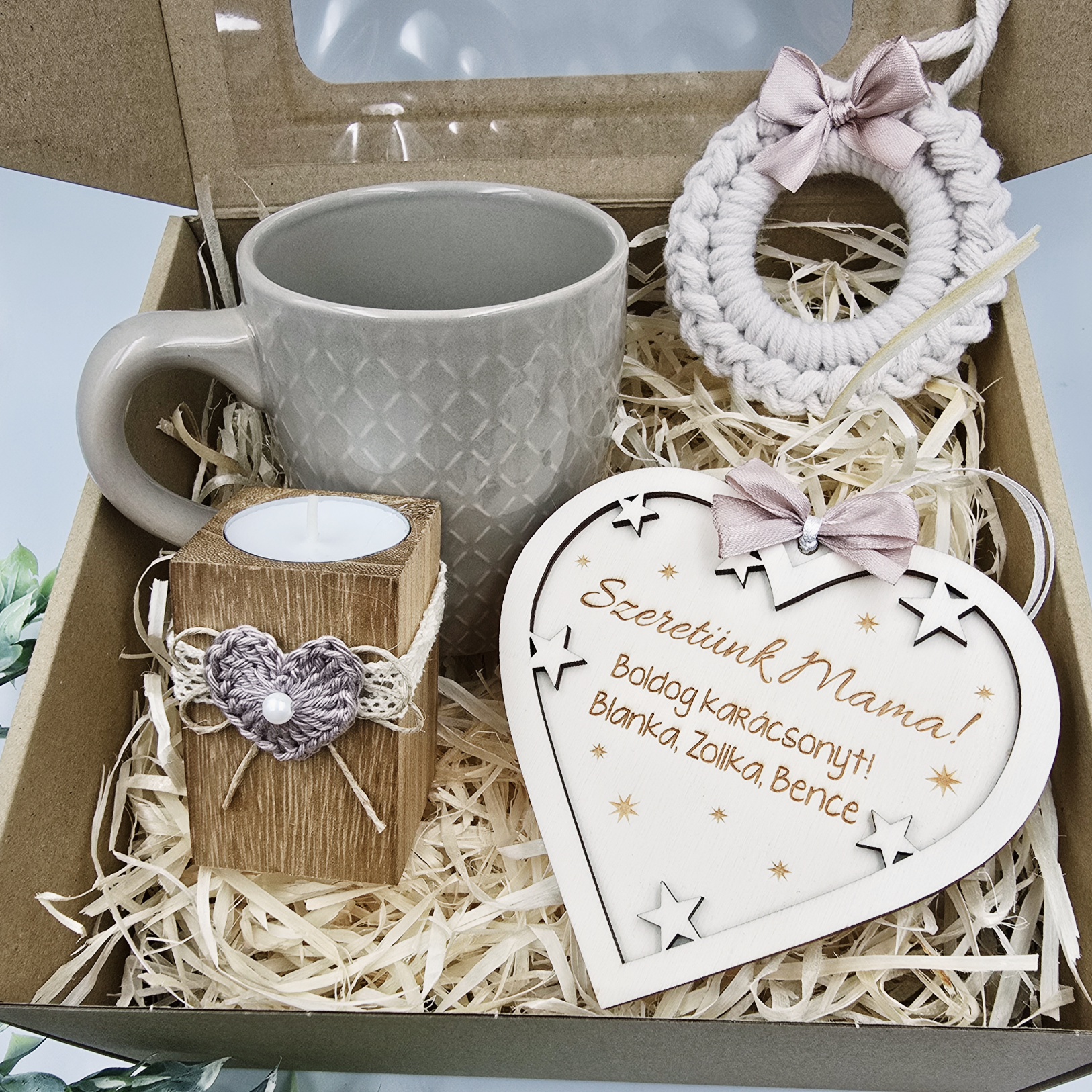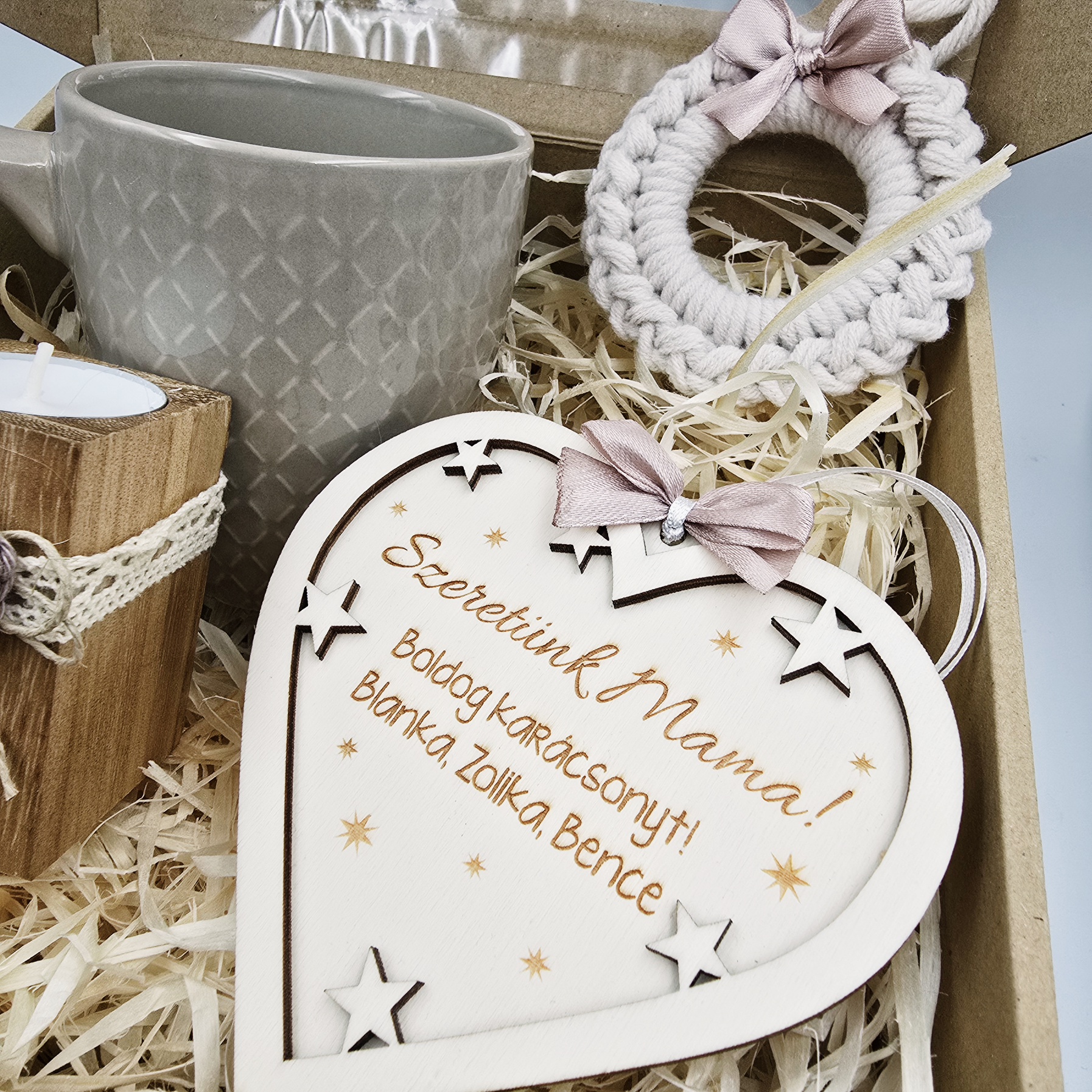 Karácsonyi ajándékdoboz bögrével, mécsessel és gravírozott dísszel – kézműves ajándék karácsonyra