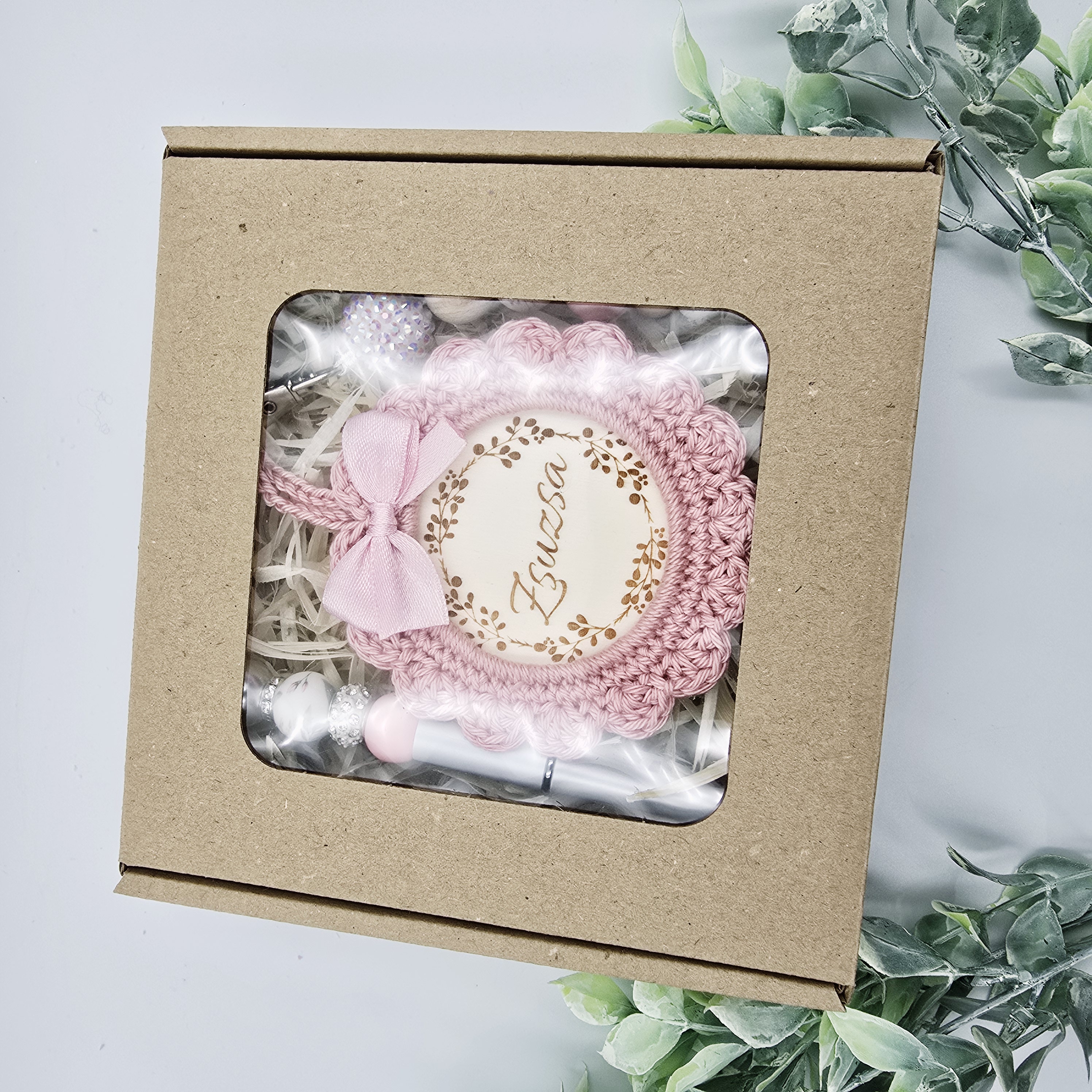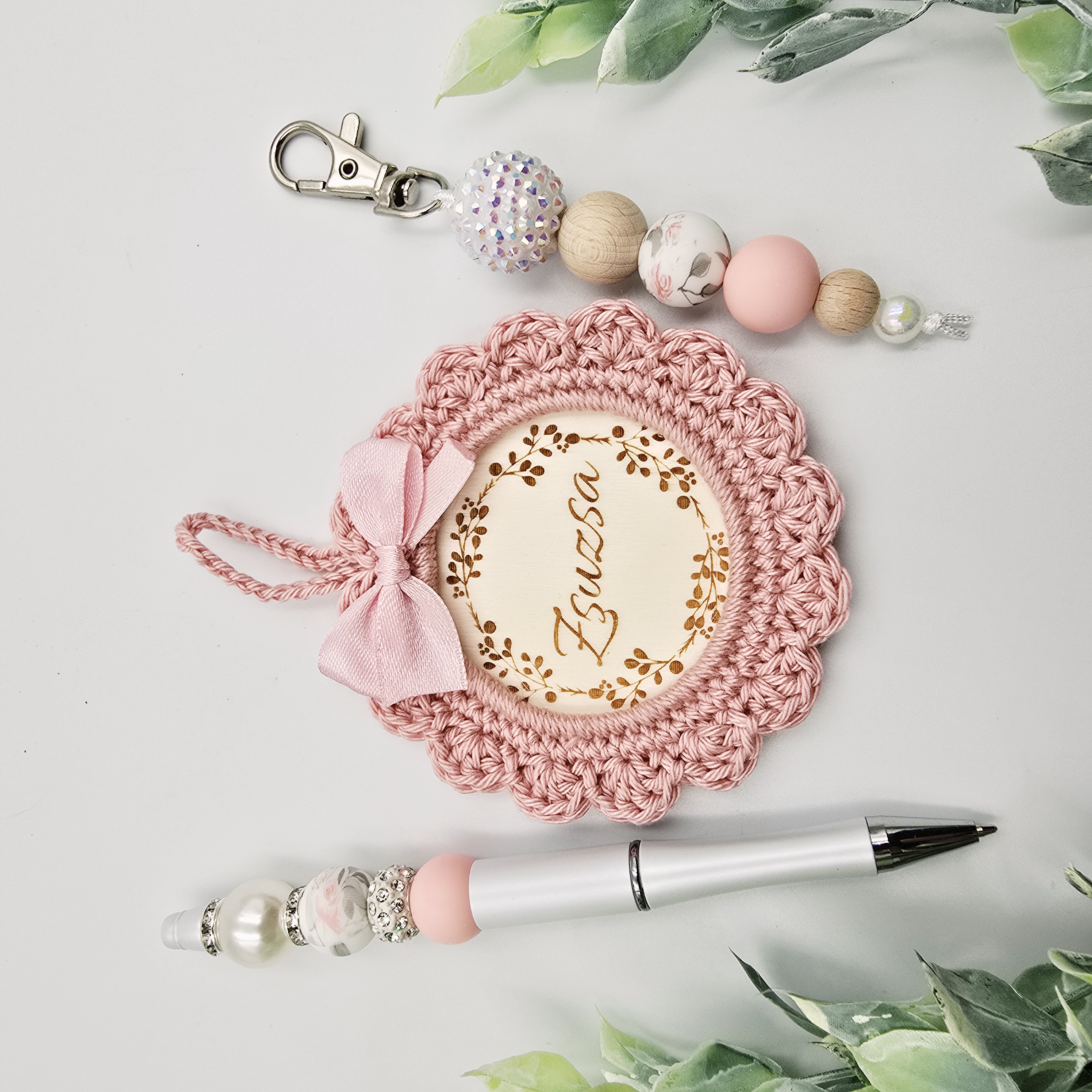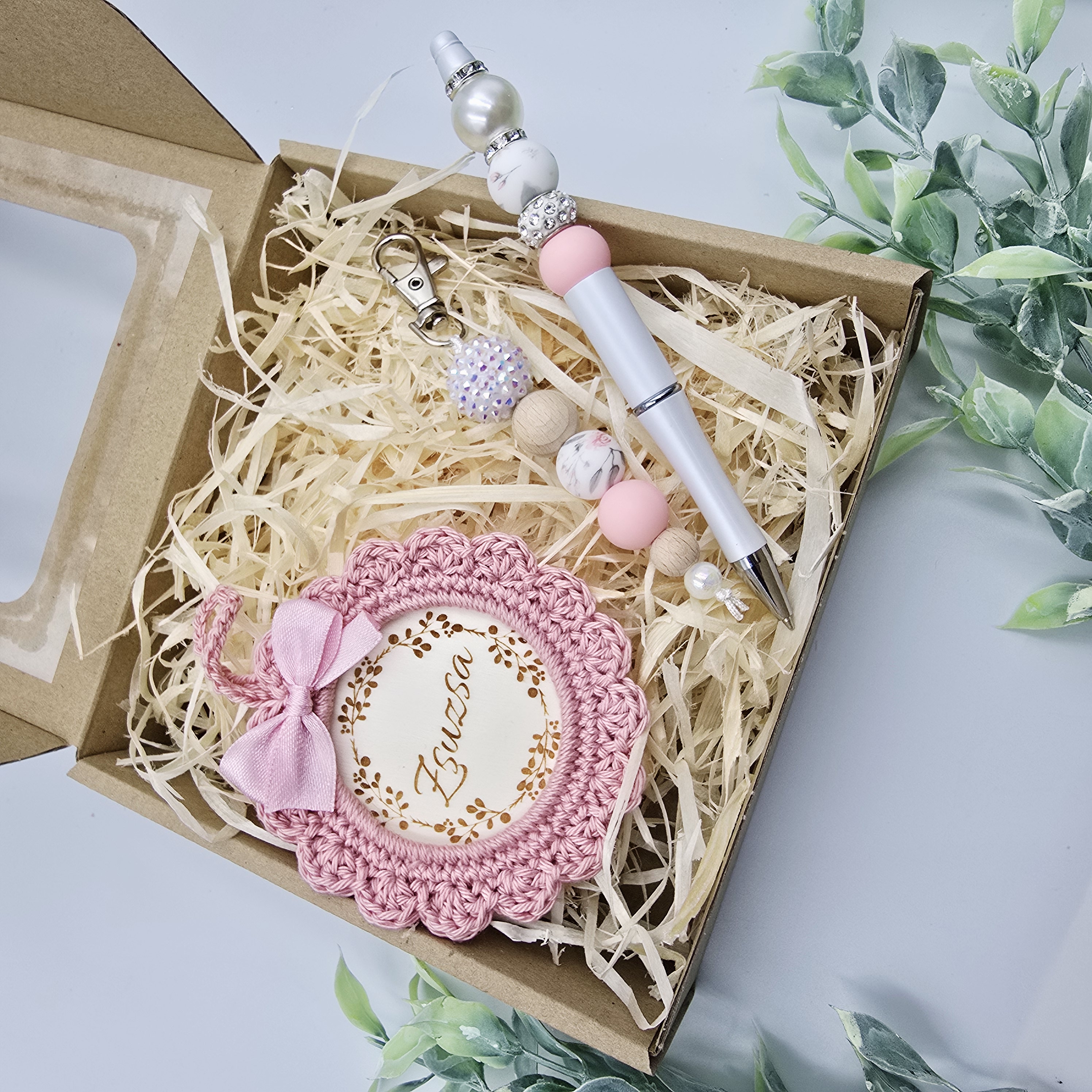 Kezdőlap » Karácsonyi ajándékcsomagok » Karácsonyi ajándékdoboz horgolt dísszel, kulcstartóval és tollal