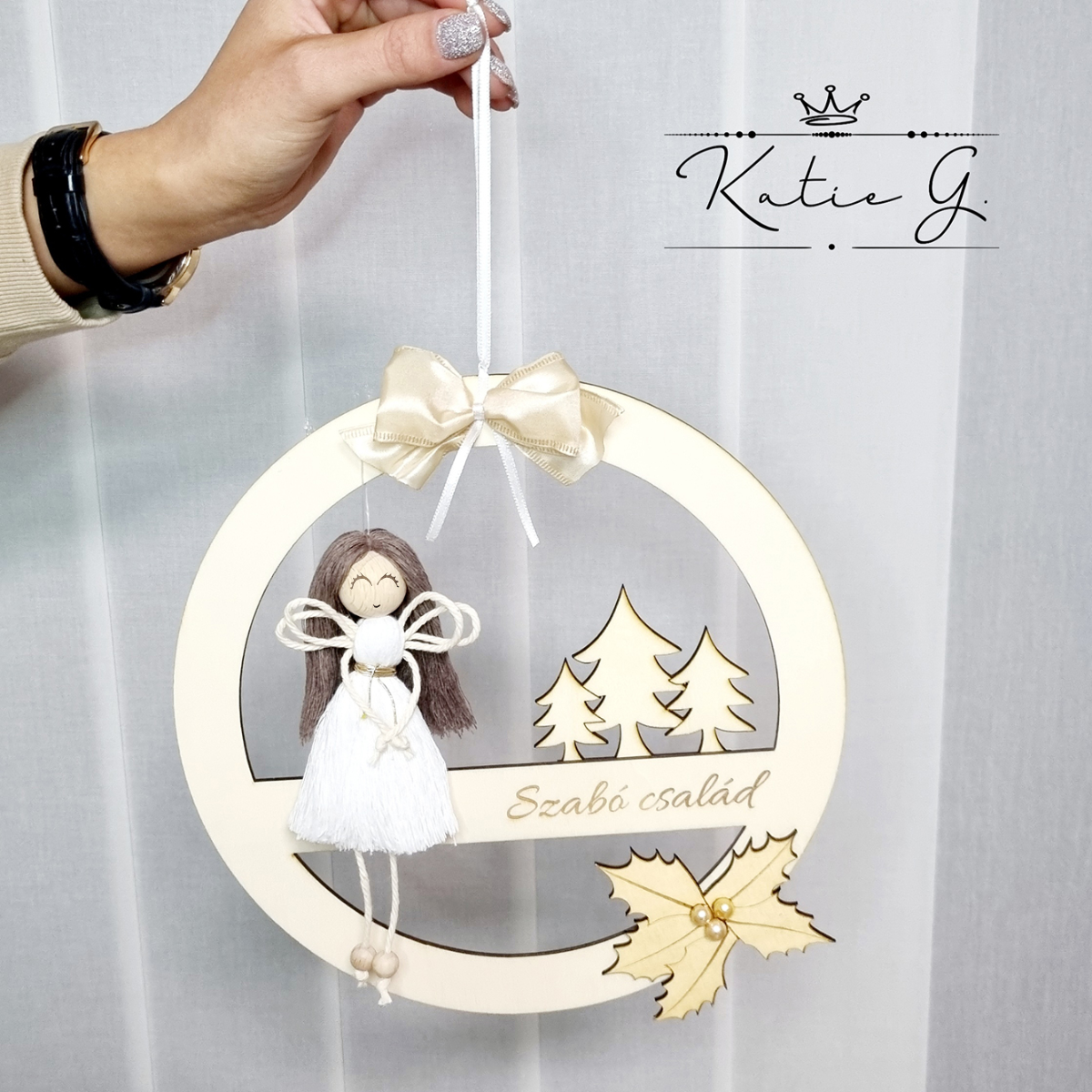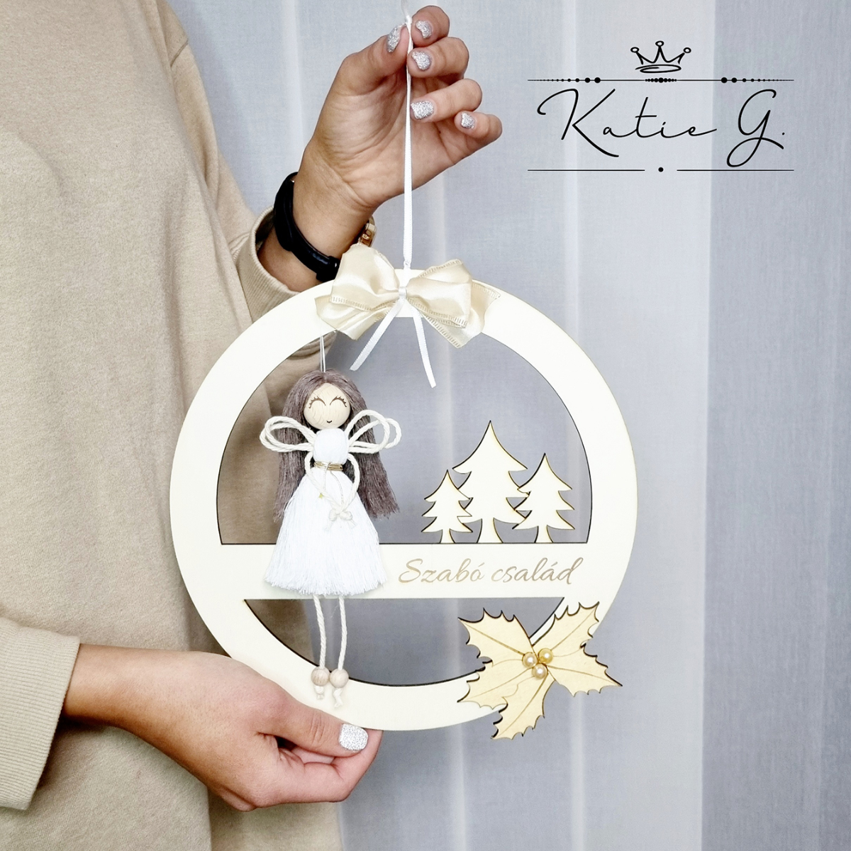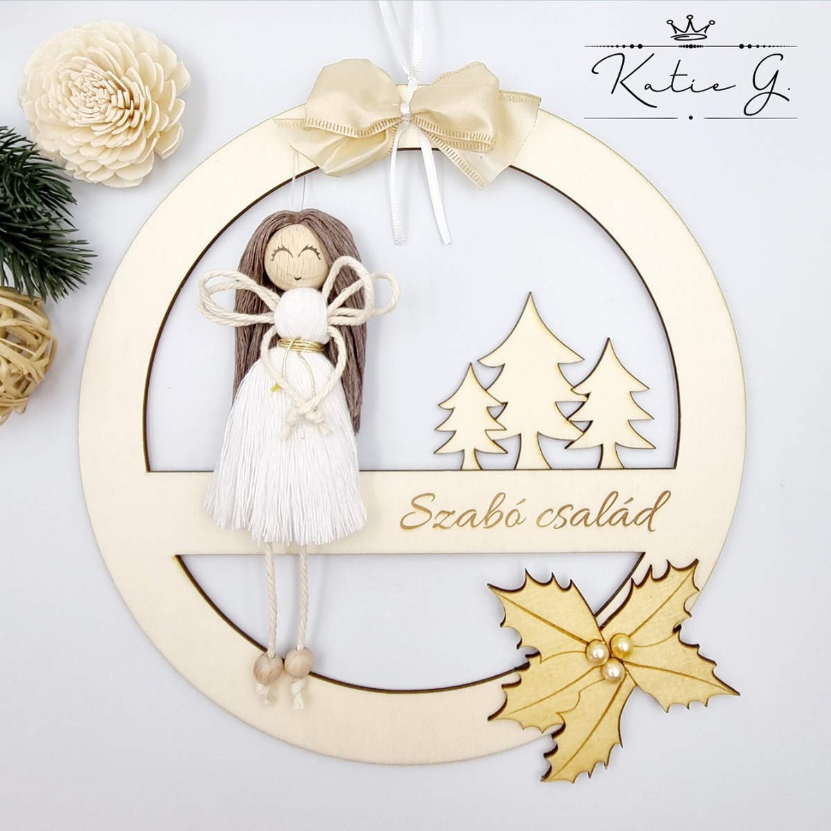 Egyedi felirattal gravírozott ajtódísz, falidísz makramé angyalkával
