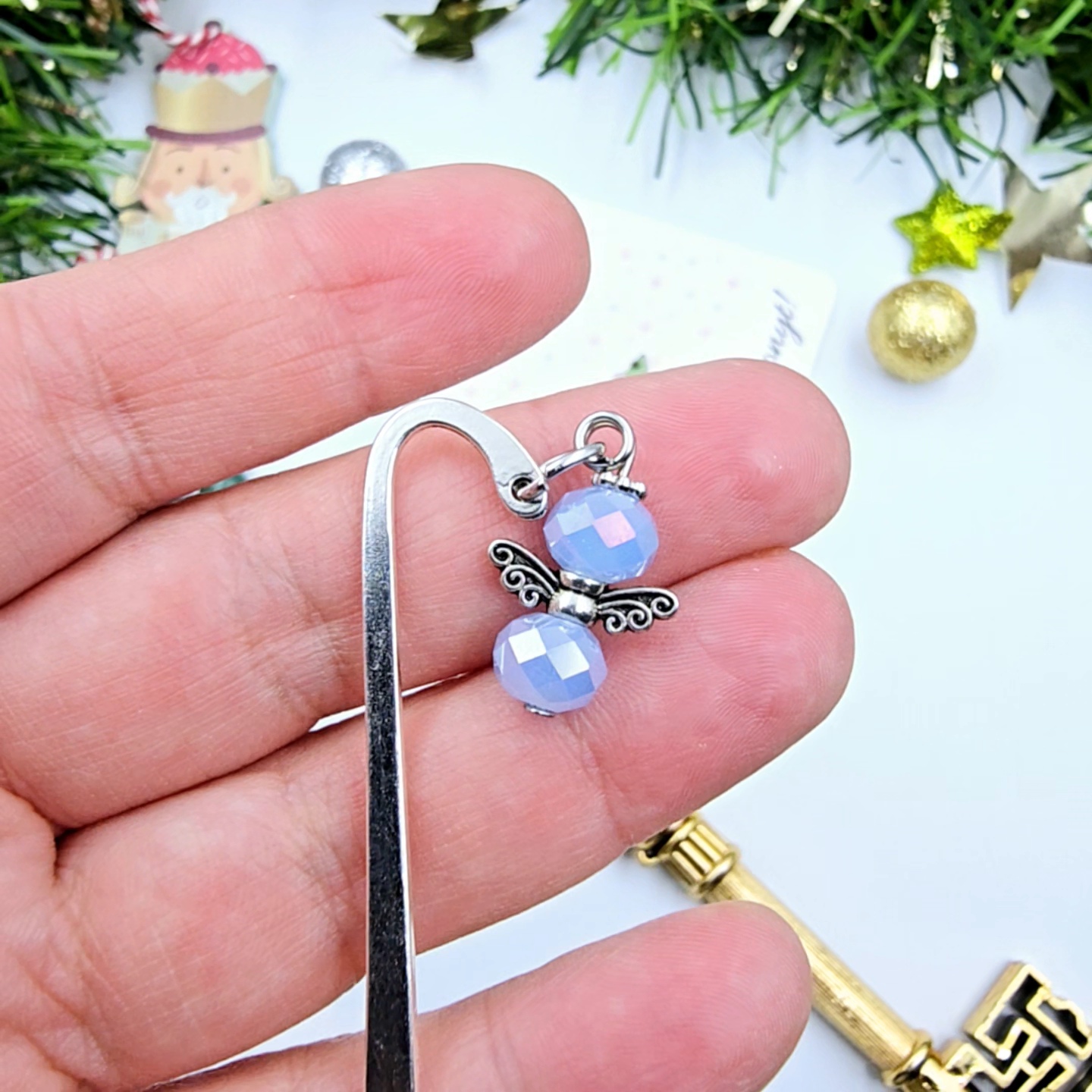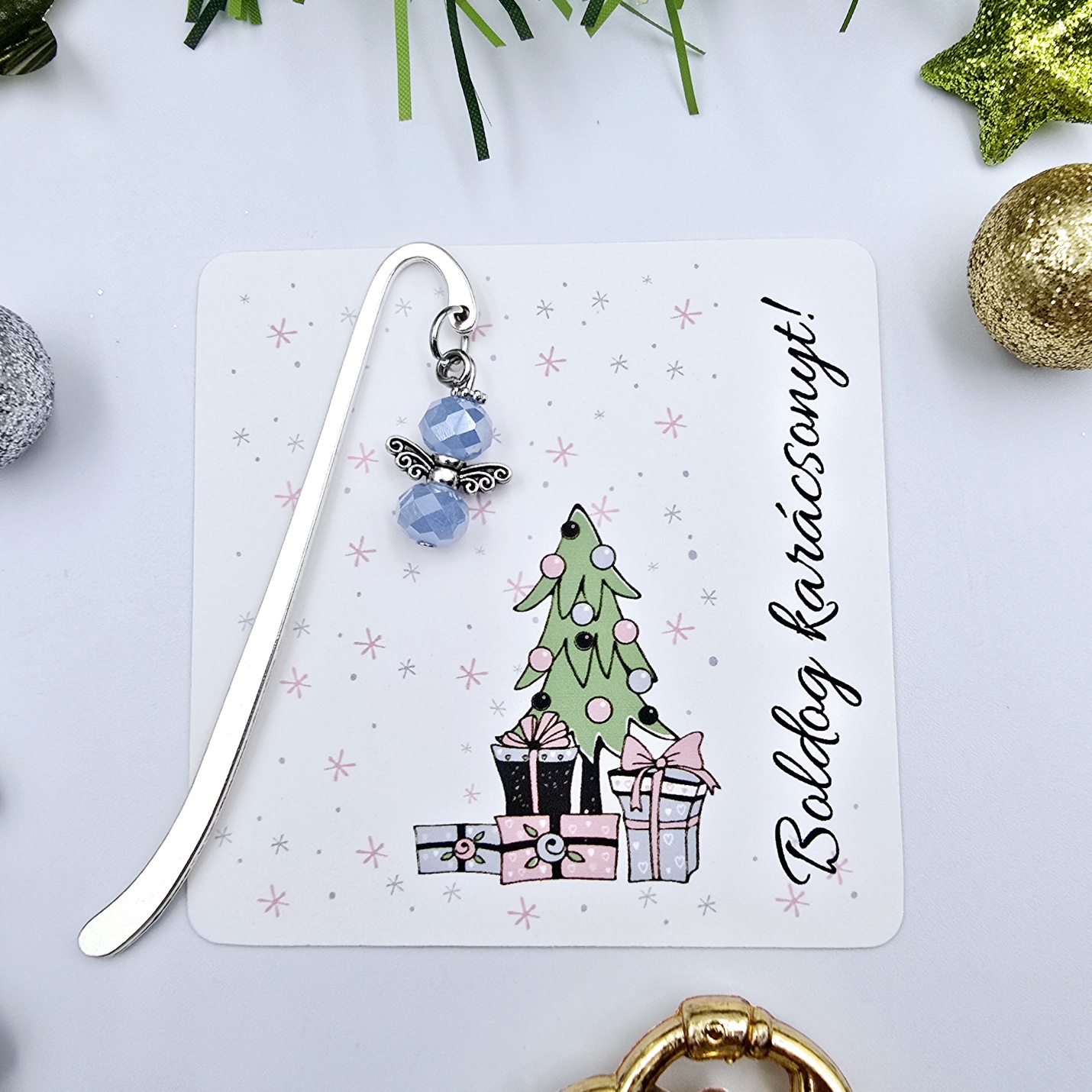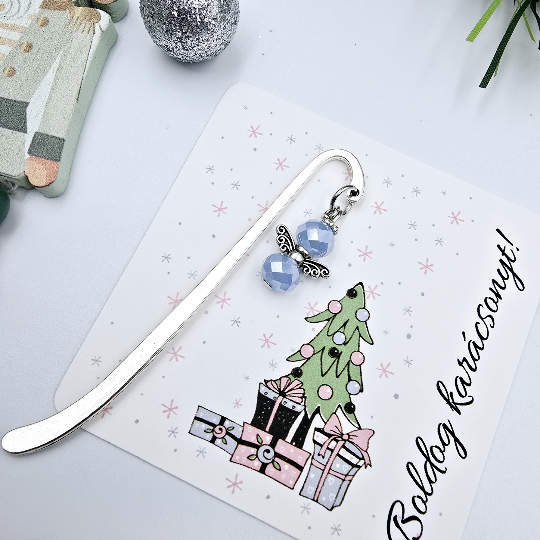 Ez a különleges karácsonyi angyalkás könyvjelző tökéletes választás szeretteink számára, akik értékelik az egyedi és kézzel készített ajándékokat, és ráadásul még az olvasás is a hobbijuk. Az angyalka mérete kb. 2 cm, a könyvjelző szára 8 cm. A könyvjelzőt egy karácsonyi ajándékkártyával szállítjuk, melyen a "Boldog karácsonyt!" üzenet olvasható. (Egyedi, személyre szabható felirat ennél a terméknél nem kérhető.)