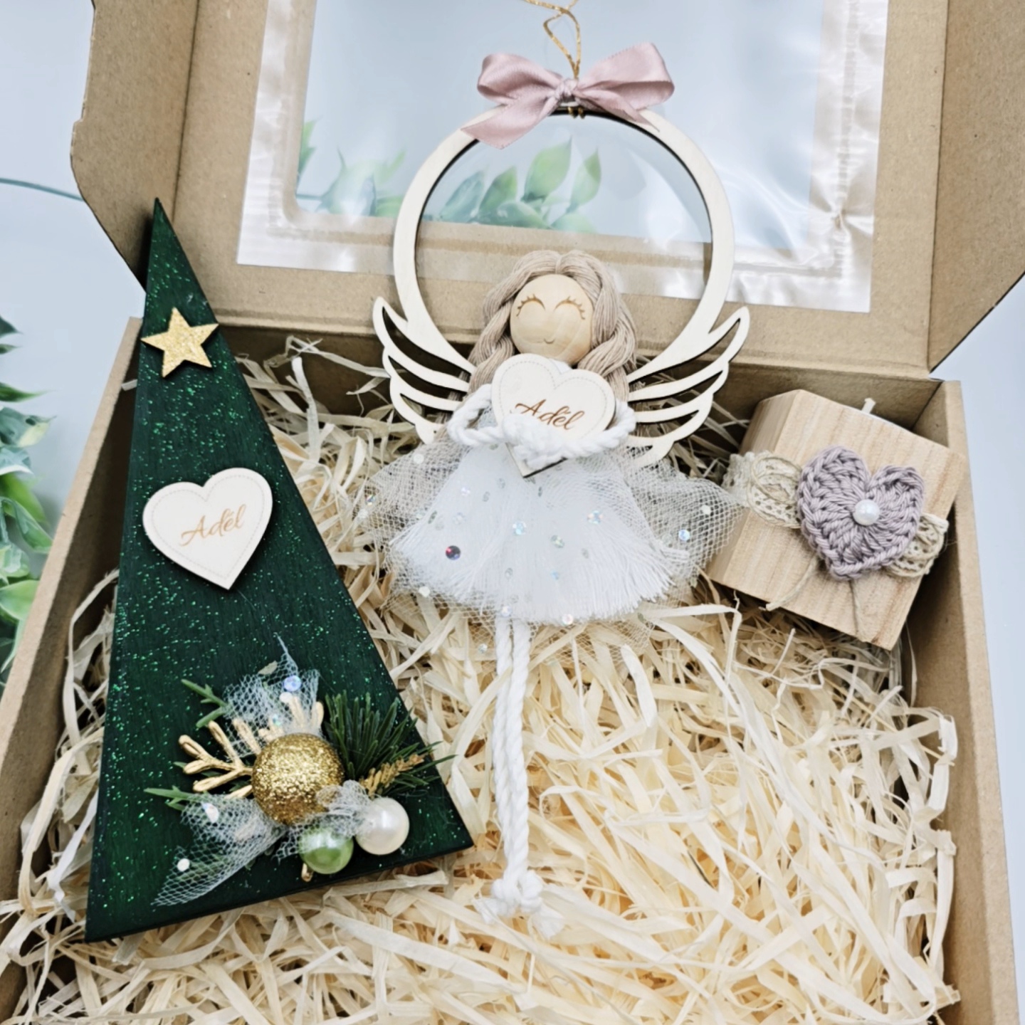 Karácsonyi ajándékdoboz természetes stílusban | Asztali dekor, gyertyatartó és makramé angyalka