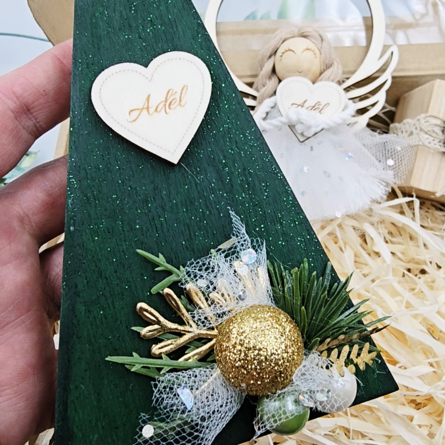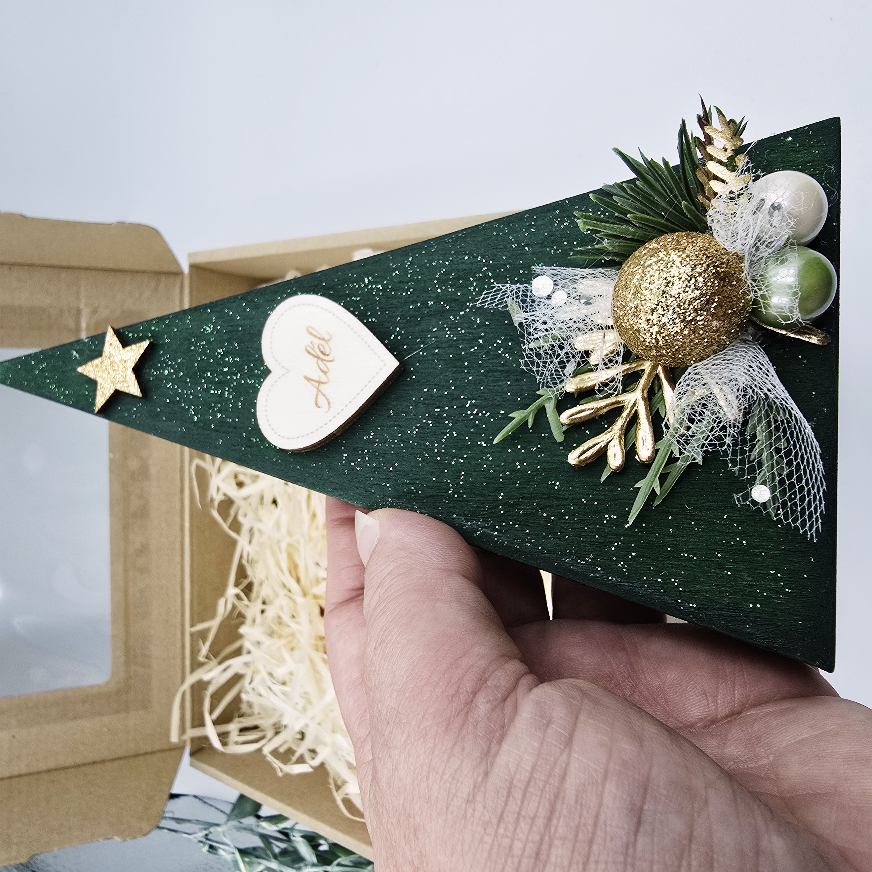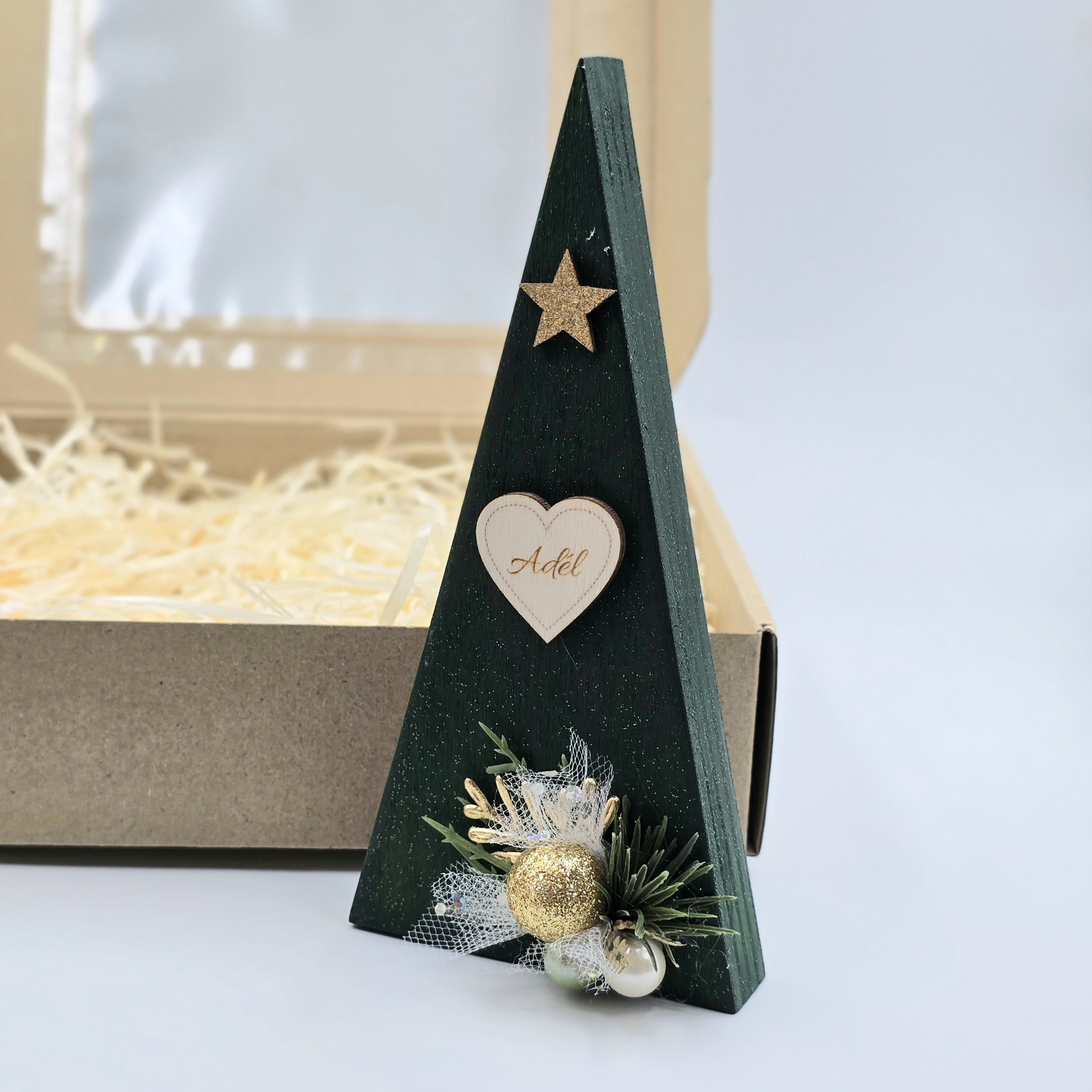 A fából készült karácsonyfa sötétzöld, csillogó felületű, arany díszítéssel és egy gravírozott szívvel. A szívre kérhető egyedi felirat, név vagy rövid üzenet, így teljesen személyre szabható ajándék.