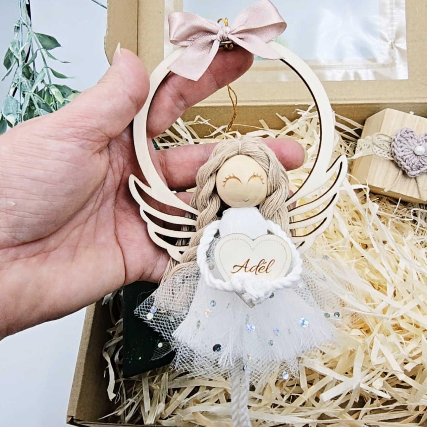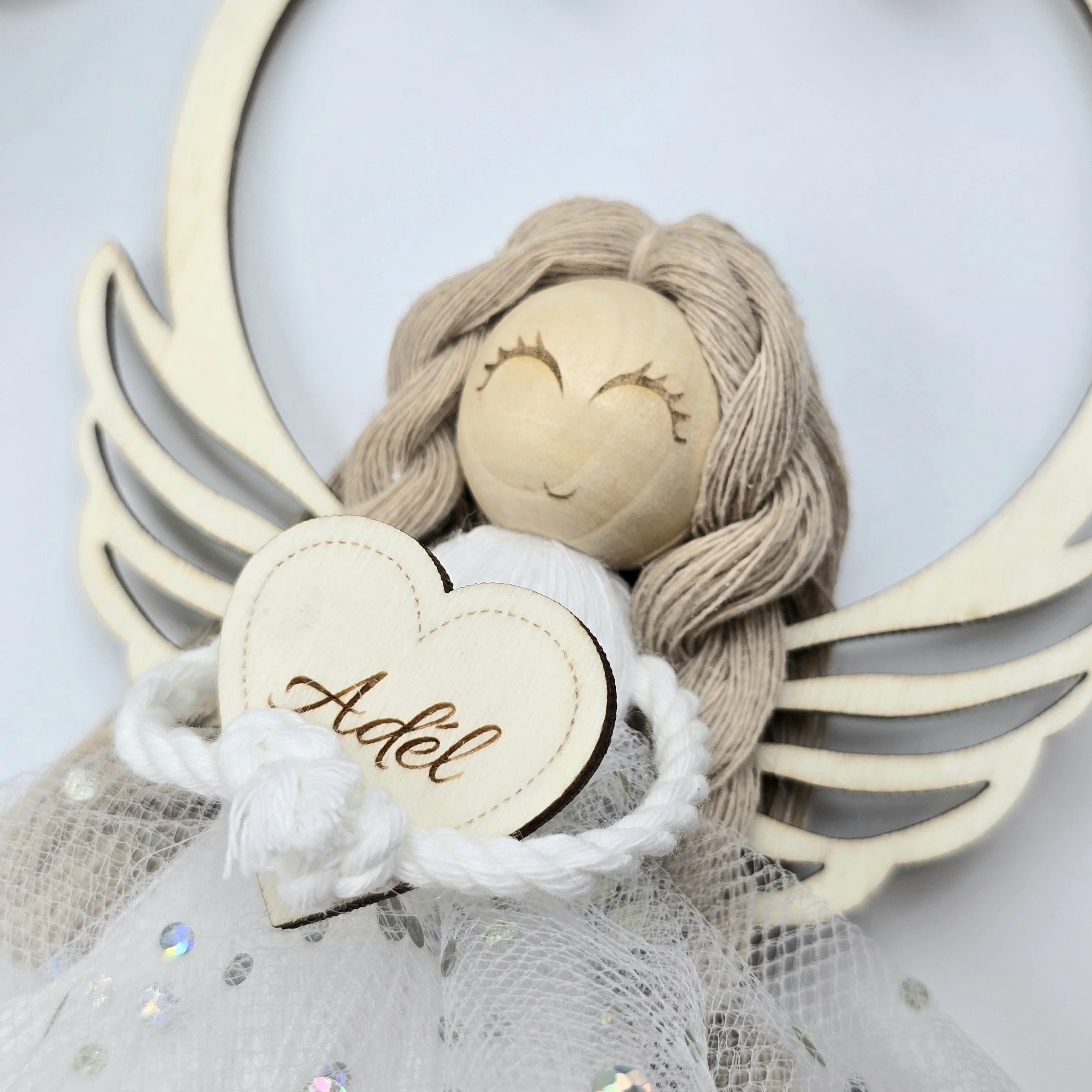 A makramé angyalka szőke hajjal, fehér ruhával és tüllszoknyával készült. Kezében egy gravírozott szívet tart, amelyre név vagy rövid szöveg kérhető. Az angyalka egy 9 cm átmérőjű fa karikán helyezkedik el, amelyet madzaggal bárhová felakaszthatsz — ajtóra, falra vagy polcra is ideális ünnepi dísz.