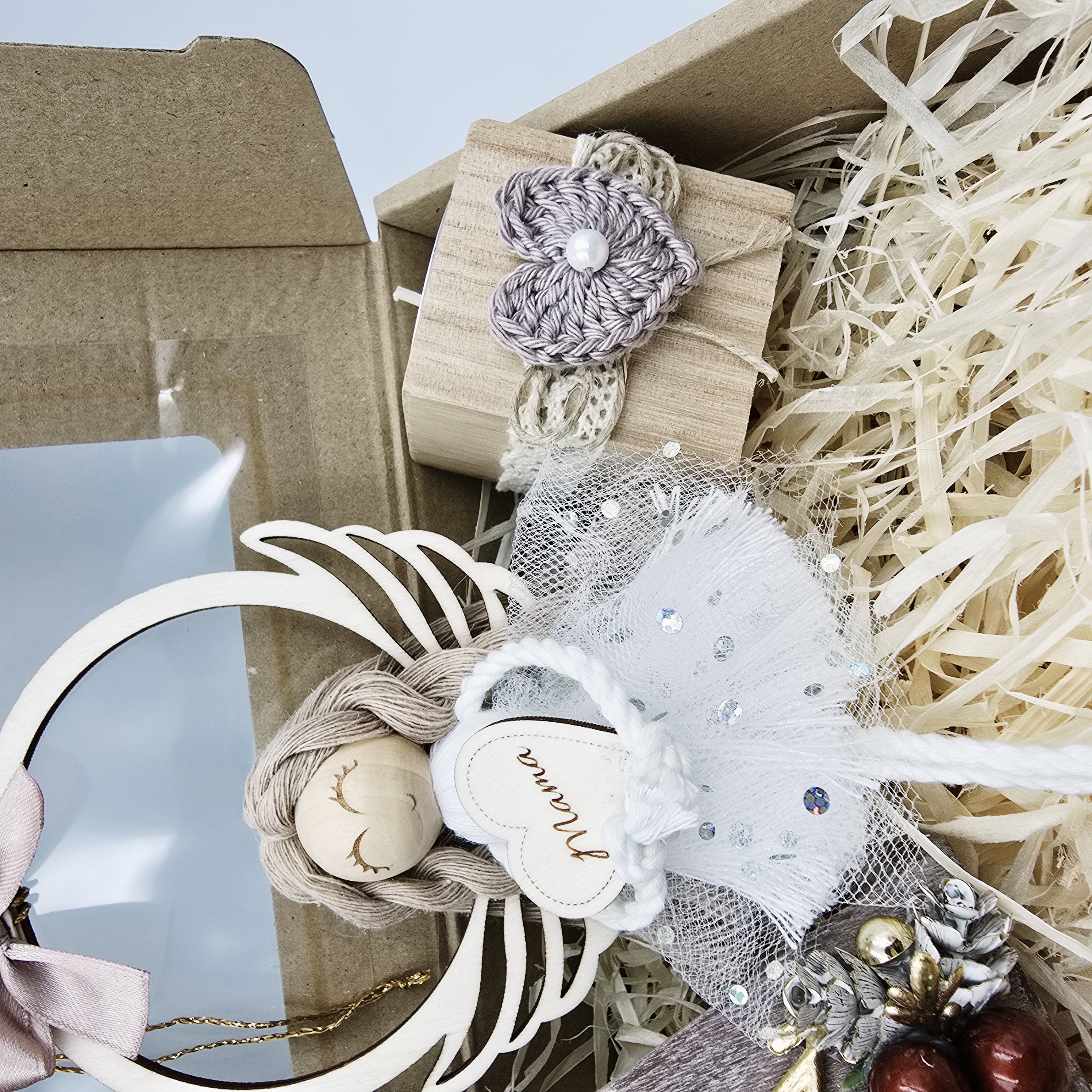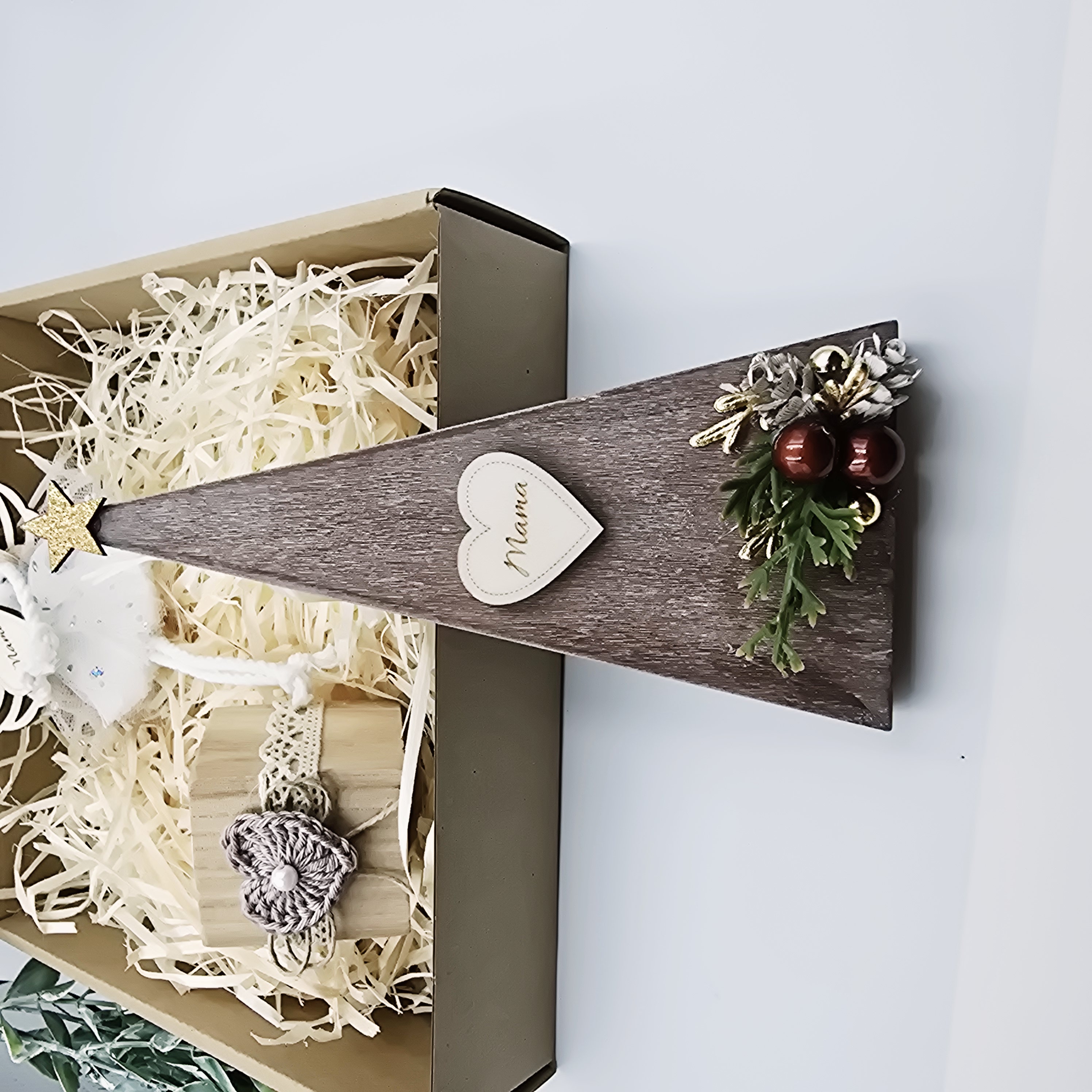 Ez a karácsonyi ajándékdoboz a természetes stílus és a kézműves részletek kedvelőinek készült. Minden eleme egyedi és gondosan kidolgozott, így nemcsak ajándékként, hanem ünnepi dekorációként is megállja a helyét.