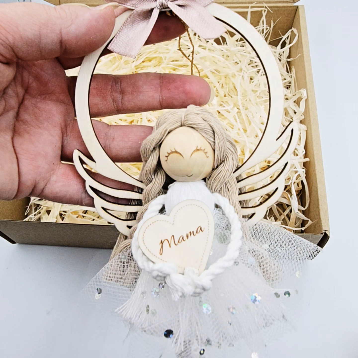 A makramé angyalka szőke hajjal, fehér ruhával és tüllszoknyával készült. Kezében egy gravírozott szívet tart, amelyre név vagy rövid szöveg kérhető. Az angyalka egy 9 cm átmérőjű fa karikán helyezkedik el, amelyet madzaggal bárhová felakaszthatsz — ajtóra, falra vagy polcra is ideális ünnepi dísz.