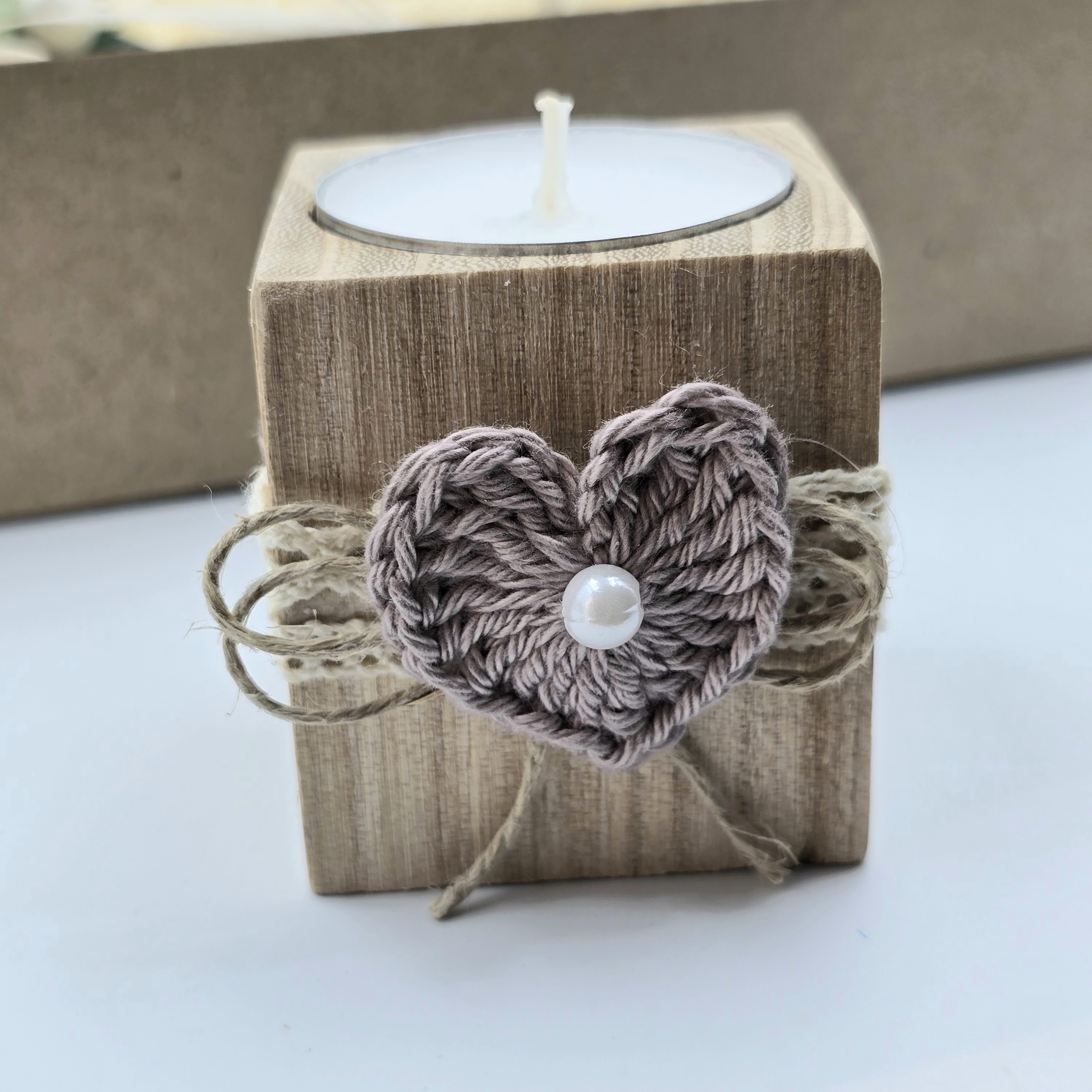 A teamécses fa gyertyatartóban kapott helyet, csipkés szalaggal és apró, kézzel horgolt szívvel díszítve. A mécses bármikor cserélhető, bármely átlagos méretű (4 cm-es) teamécses illik bele.