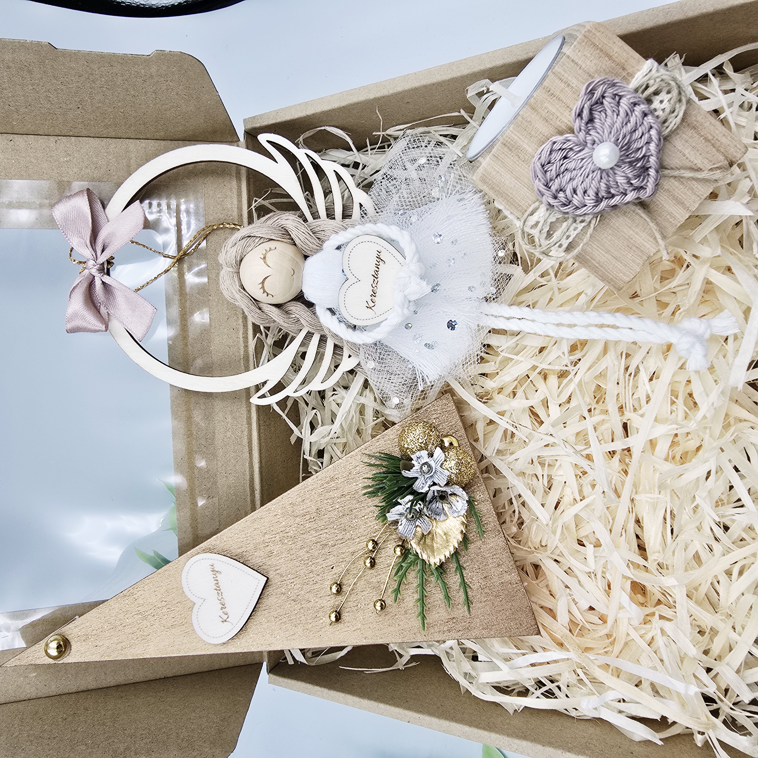 Karácsonyi ajándékdoboz természetes stílusban | Asztali dekor, gyertyatartó és makramé angyalka