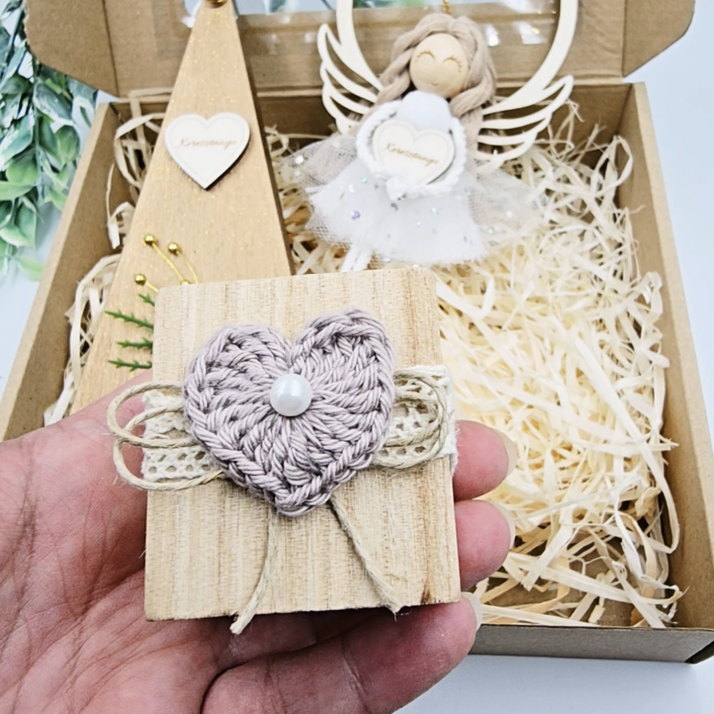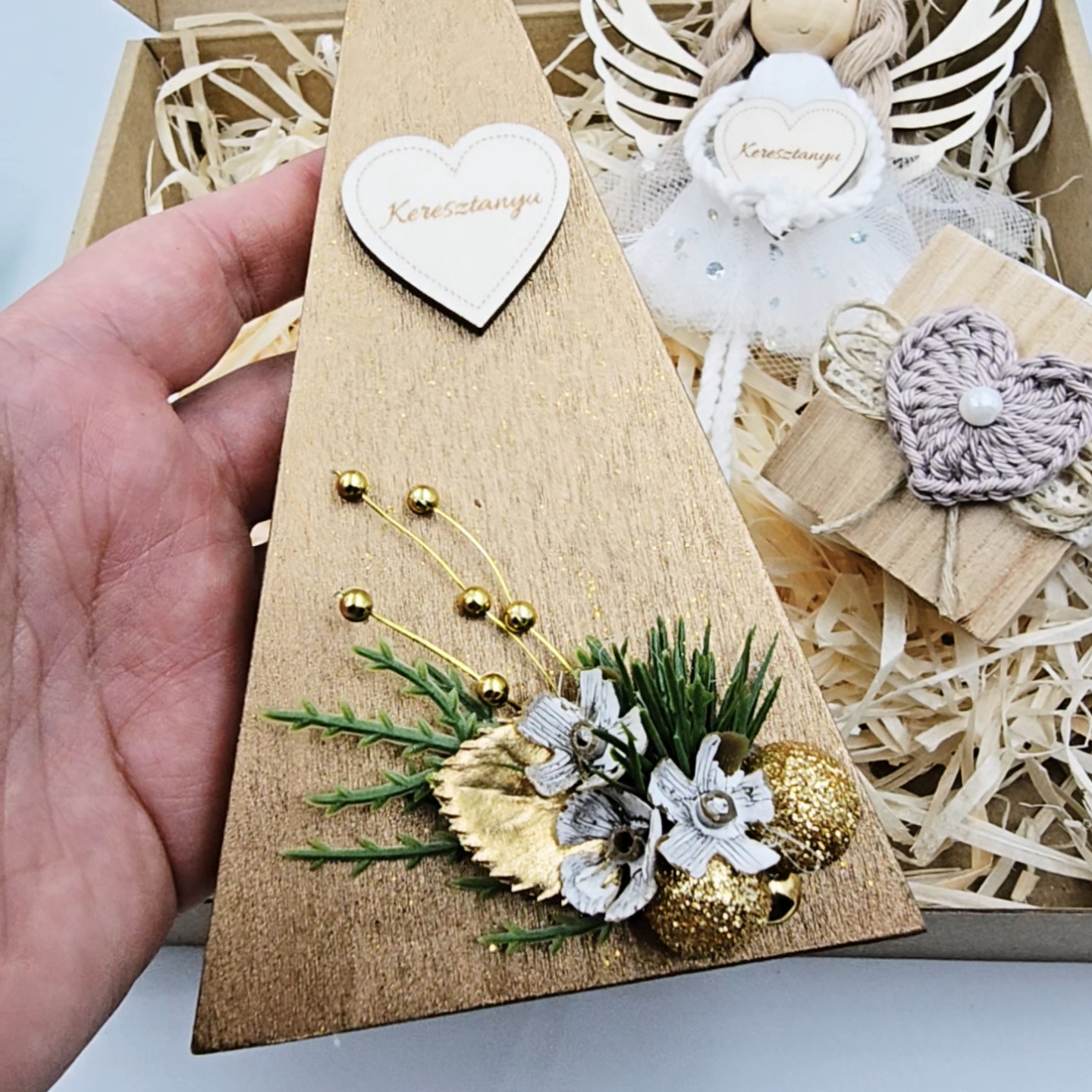 Ez a karácsonyi ajándékdoboz a természetes stílus és a kézműves részletek kedvelőinek készült. Minden eleme egyedi és gondosan kidolgozott, így nemcsak ajándékként, hanem ünnepi dekorációként is megállja a helyét.