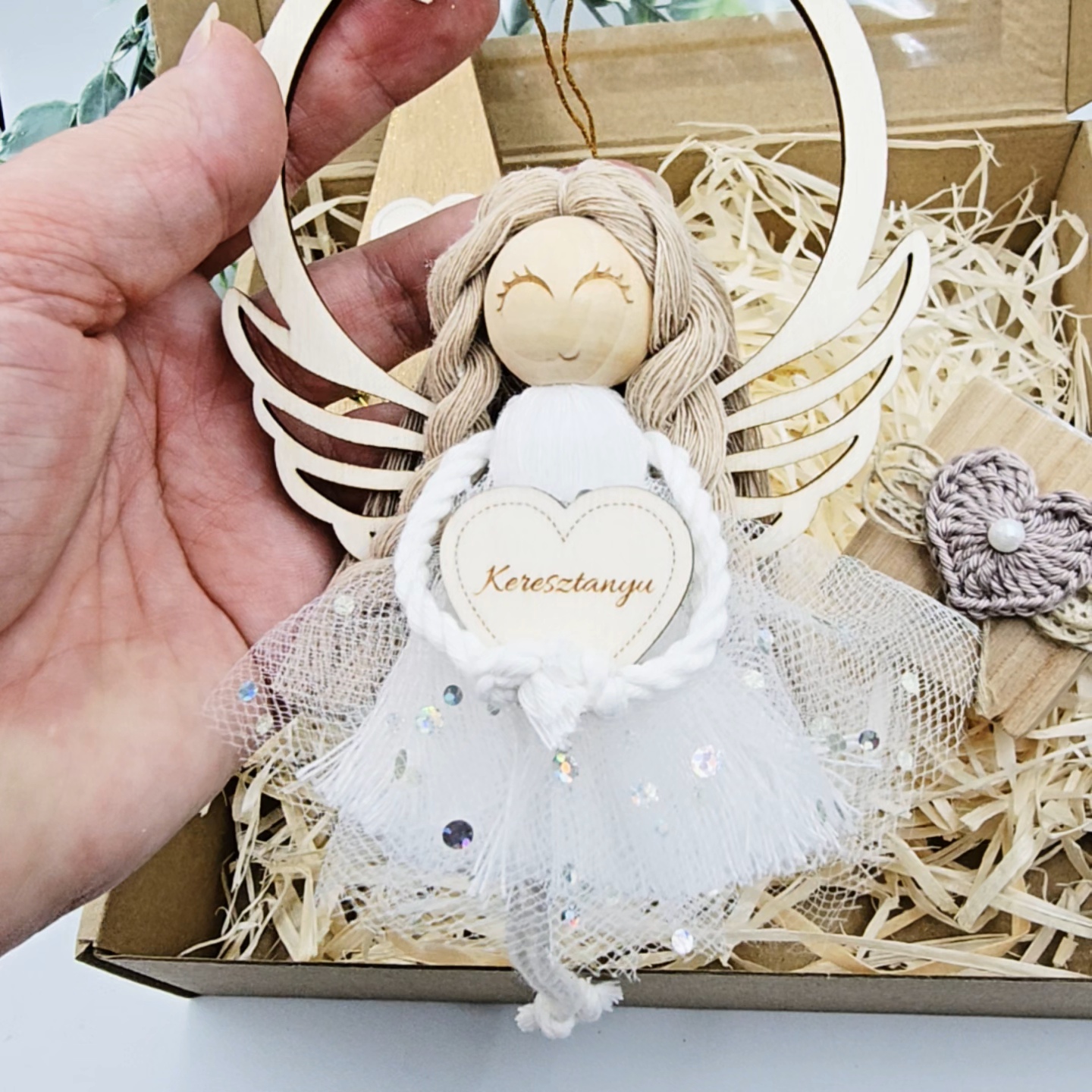 A makramé angyalka szőke hajjal, fehér ruhával és tüllszoknyával készült. Kezében egy gravírozott szívet tart, amelyre név vagy rövid szöveg kérhető. Az angyalka egy 9 cm átmérőjű fa karikán helyezkedik el, amelyet madzaggal bárhová felakaszthatsz — ajtóra, falra vagy polcra is ideális ünnepi dísz.