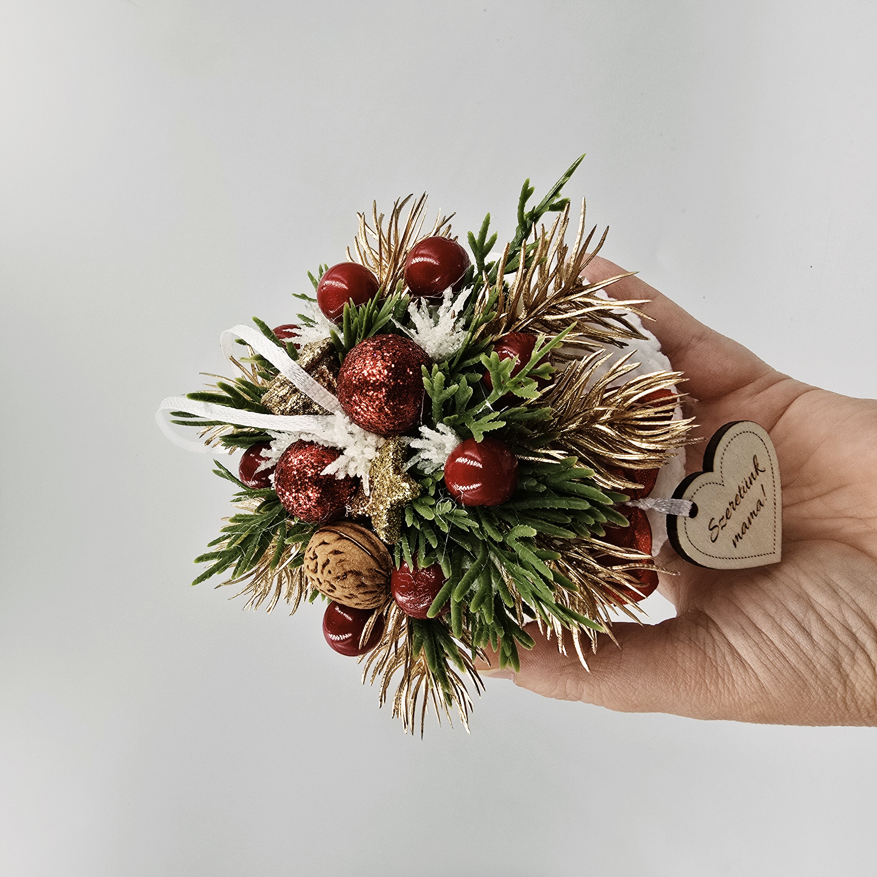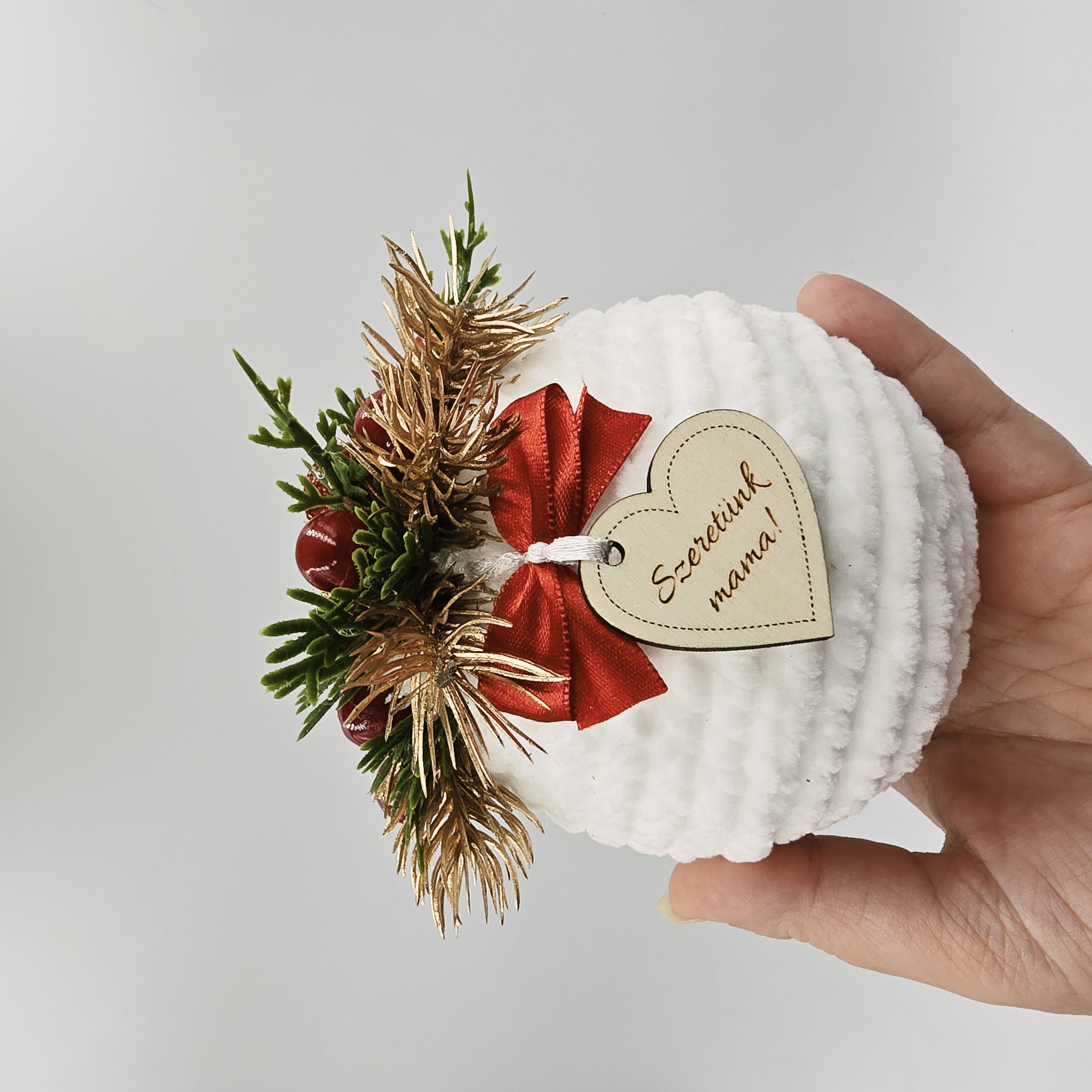 Kézzel készült karácsonyi gömb, puha horgolt zsenília fonallal borított hungarocell alappal. A tetején apró díszek teszik ünnepivé. Minden darab egyedi, kézzel készített.
