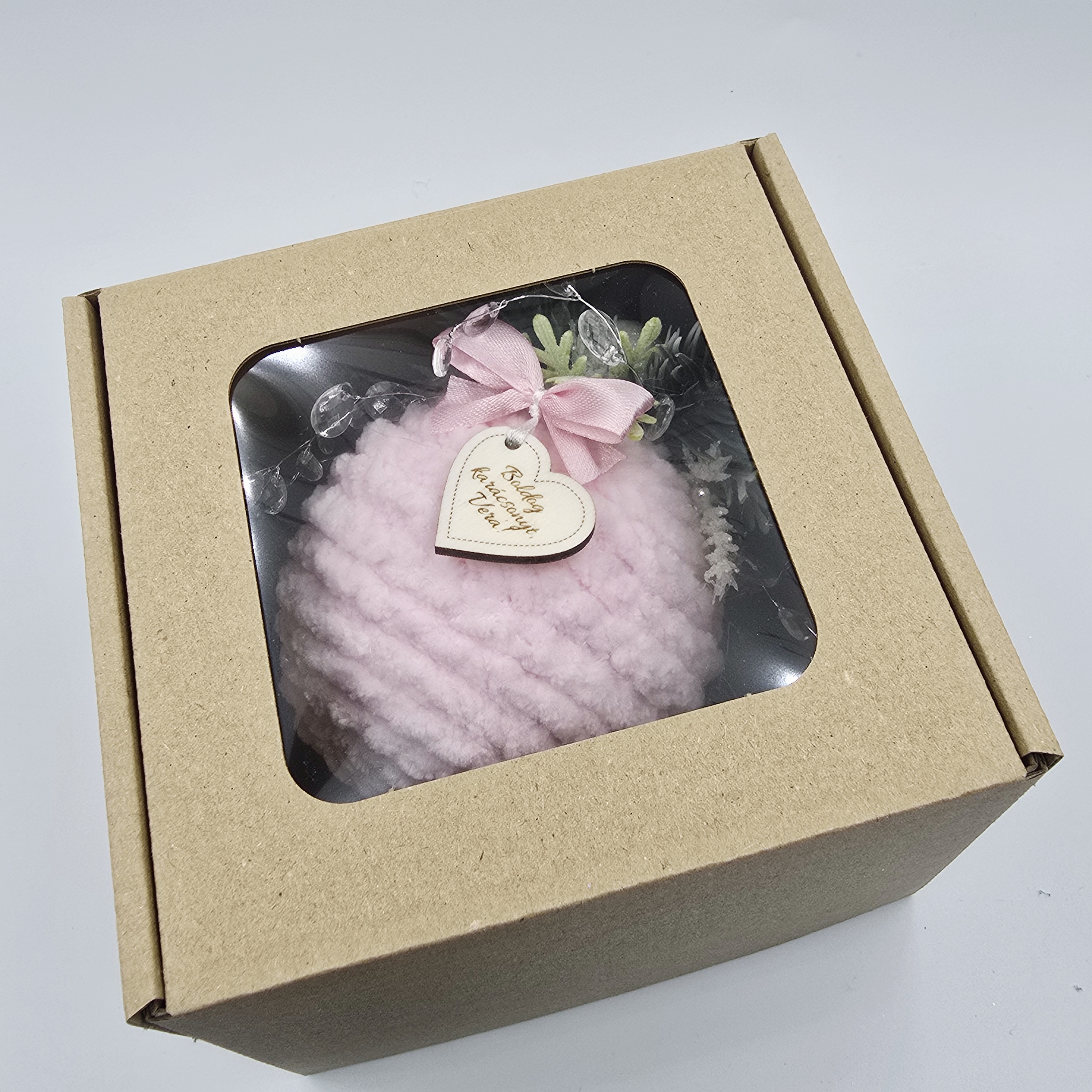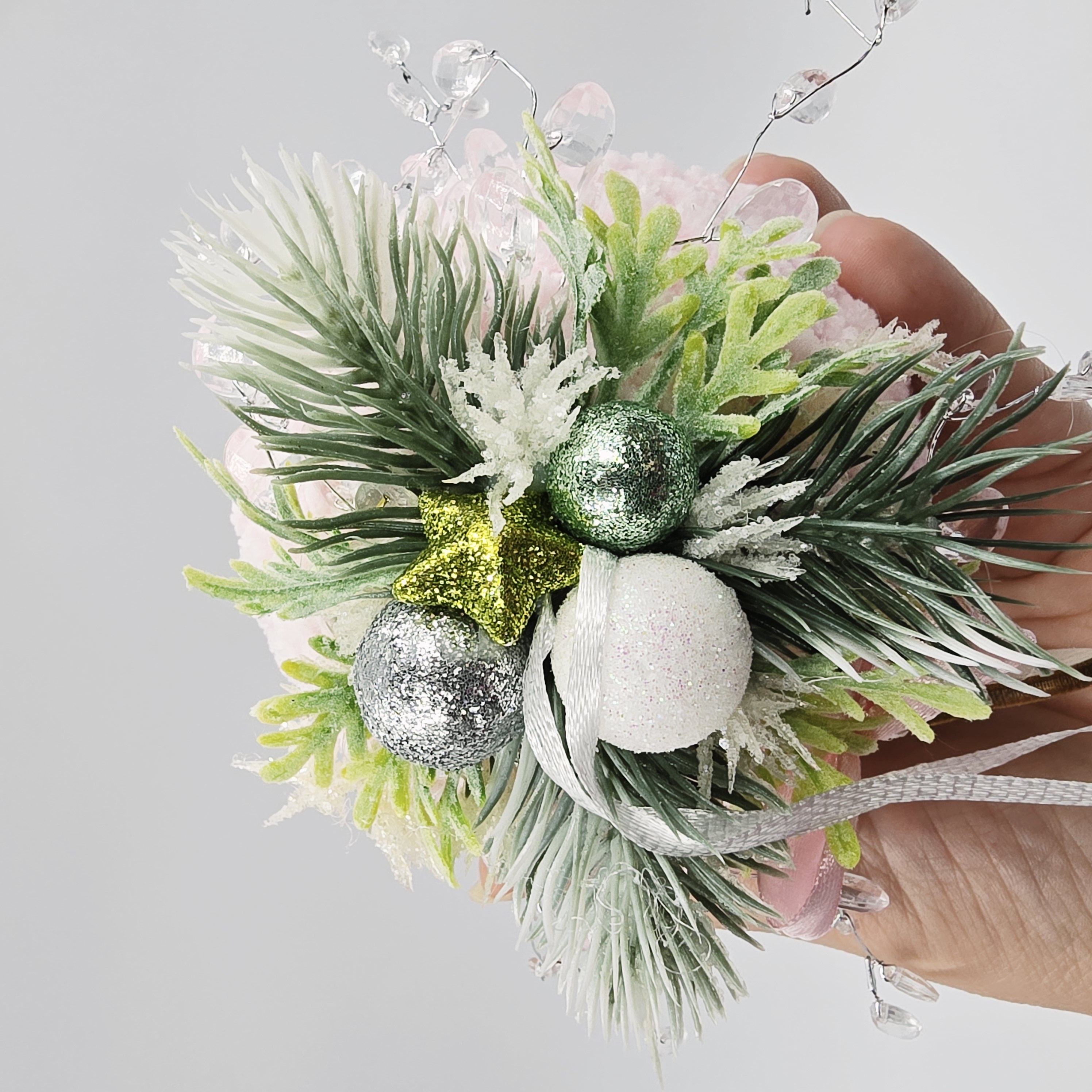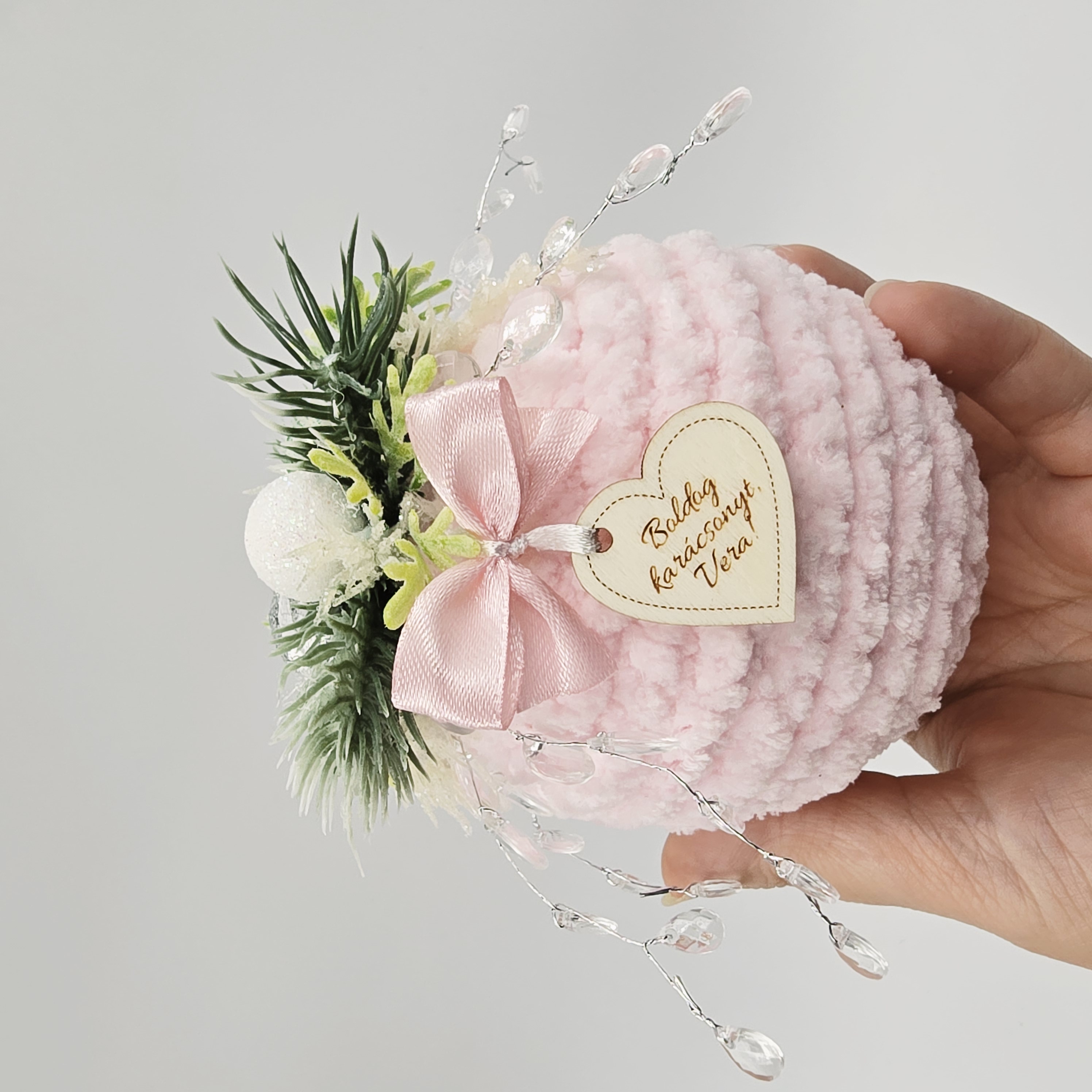 Kézzel készült karácsonyi gömb, puha horgolt zsenília fonallal borított hungarocell alappal. A tetején apró díszek teszik ünnepivé. Minden darab egyedi, kézzel készített.