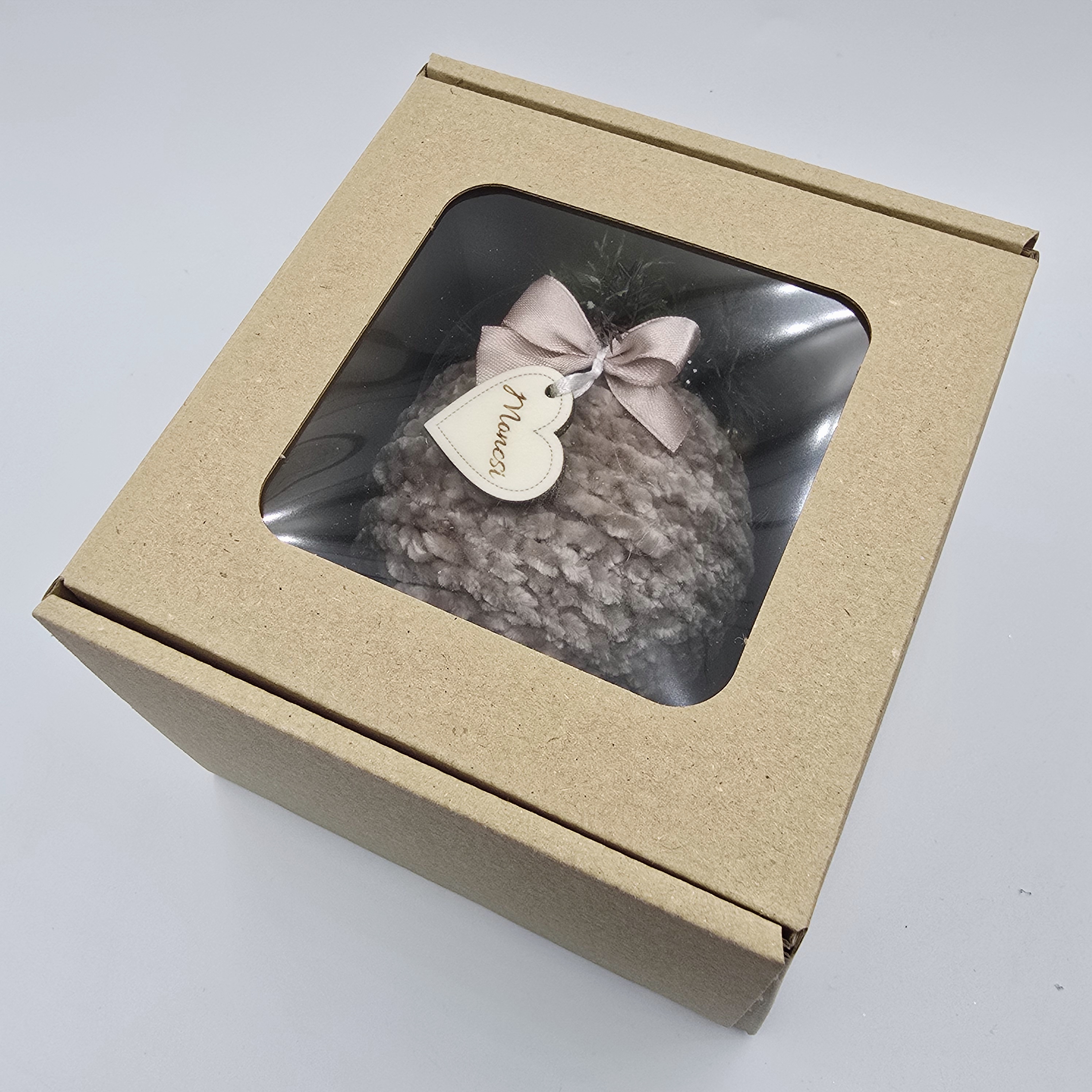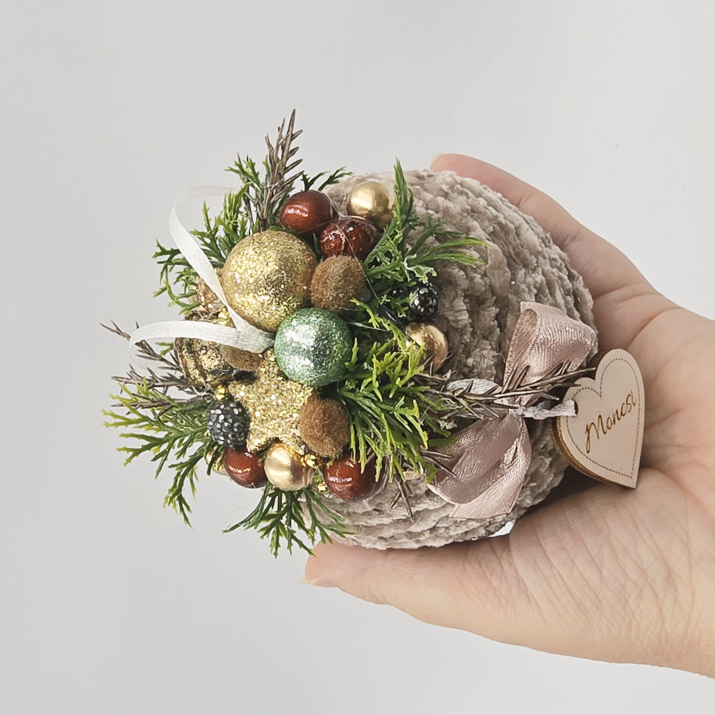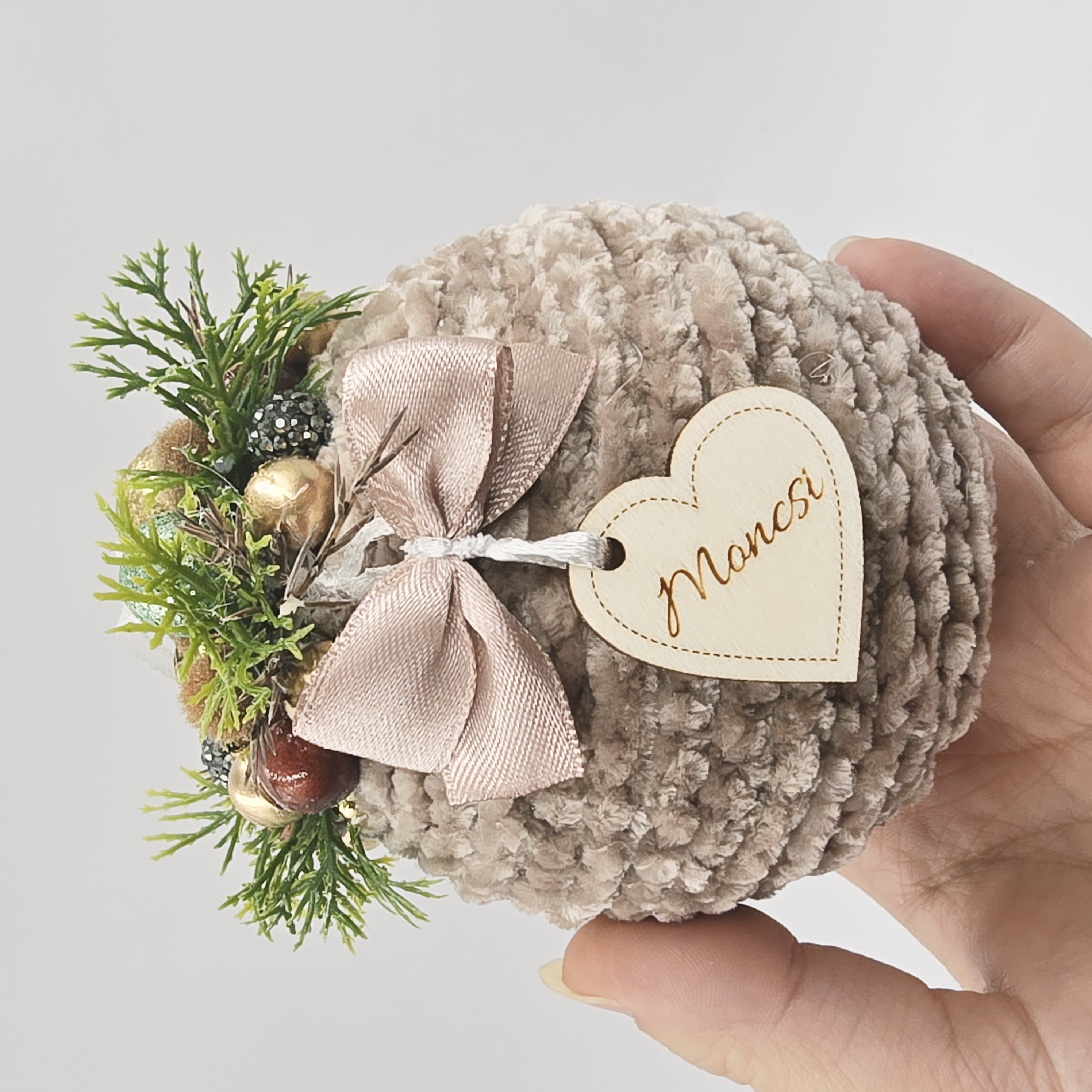 Kézzel készült karácsonyi gömb, puha horgolt zsenília fonallal borított hungarocell alappal. A tetején apró díszek teszik ünnepivé. Minden darab egyedi, kézzel készített.