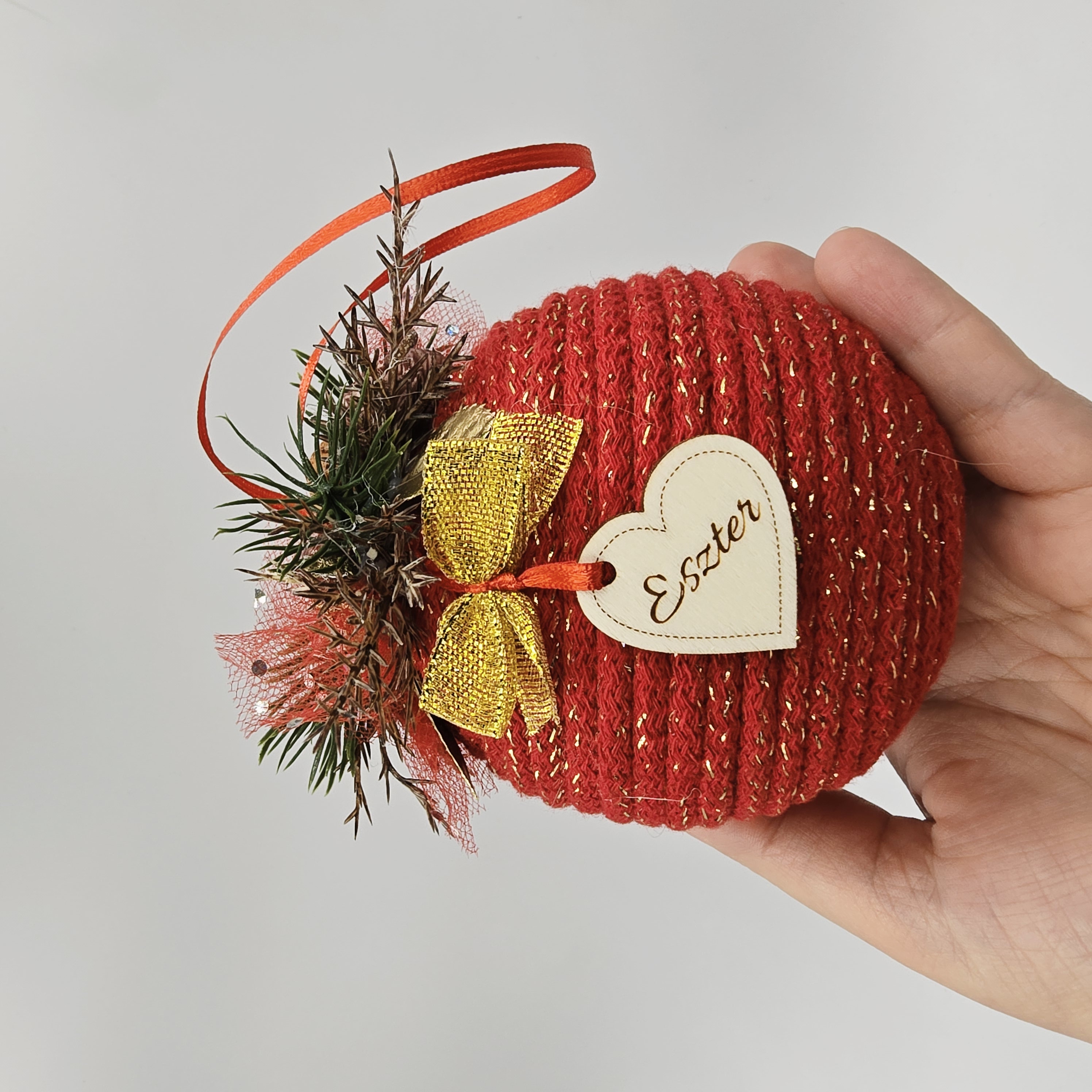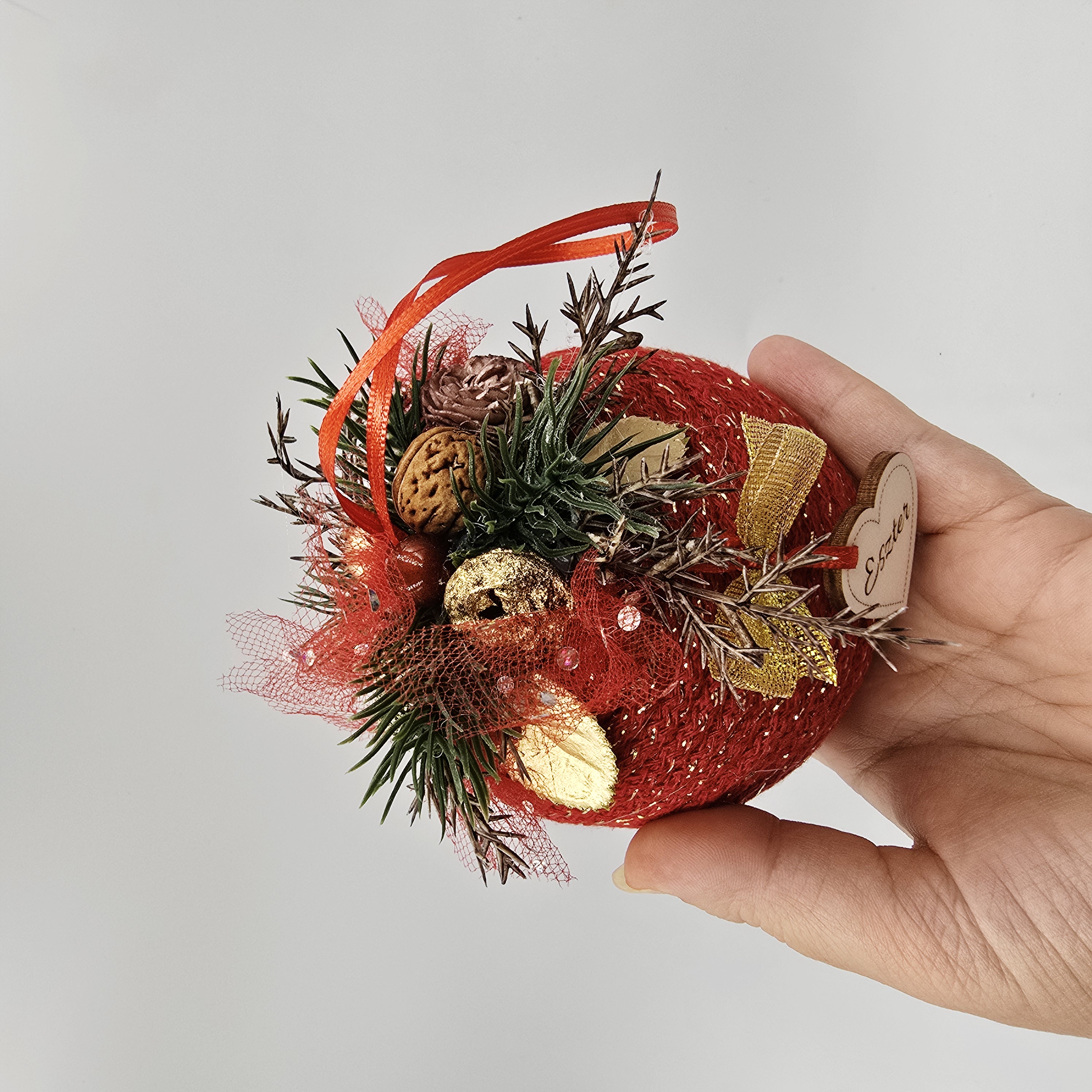 Kézzel készült karácsonyi gömb, zsinórfonallal borított hungarocell alappal. A tetején apró díszek teszik ünnepivé. Minden darab egyedi, kézzel készített.