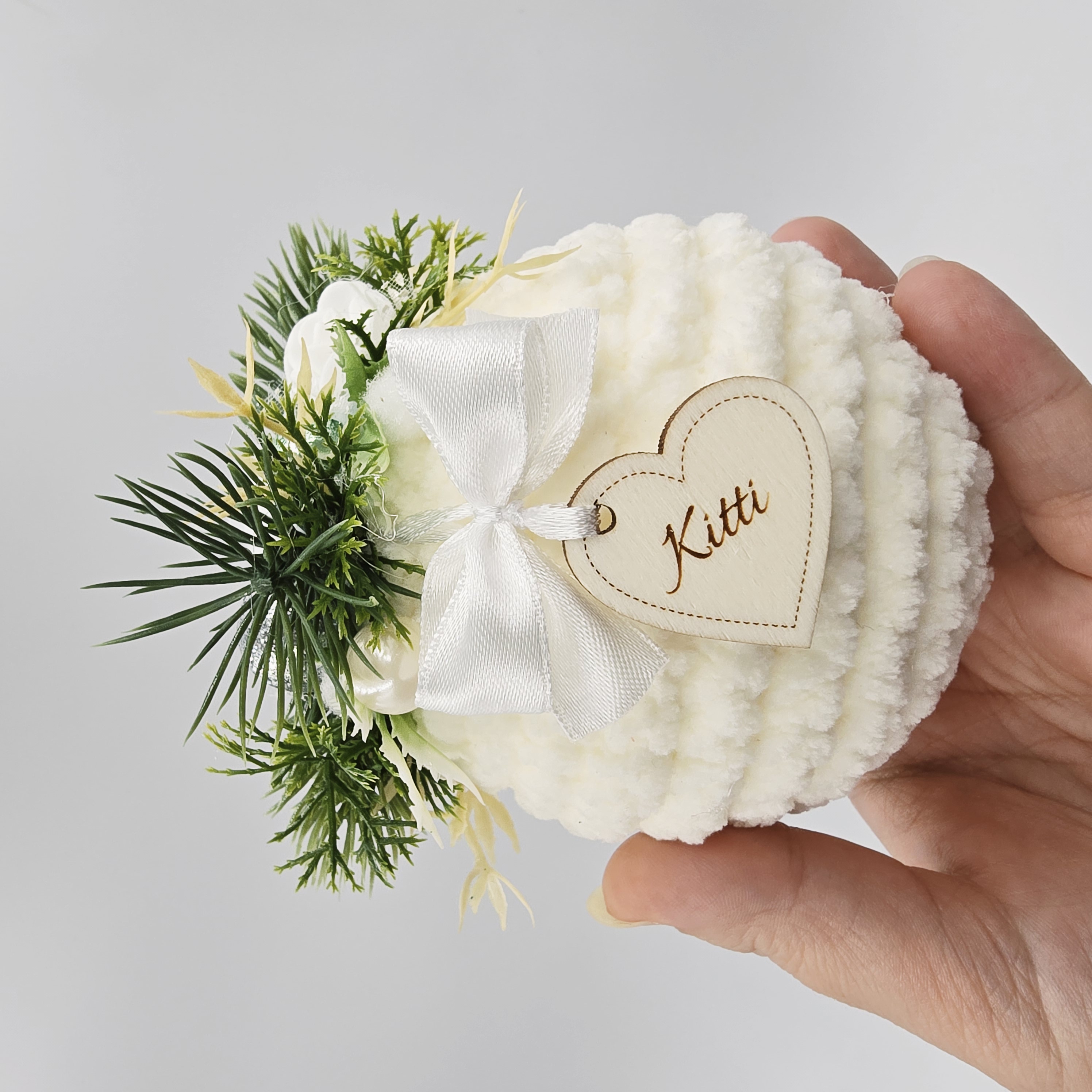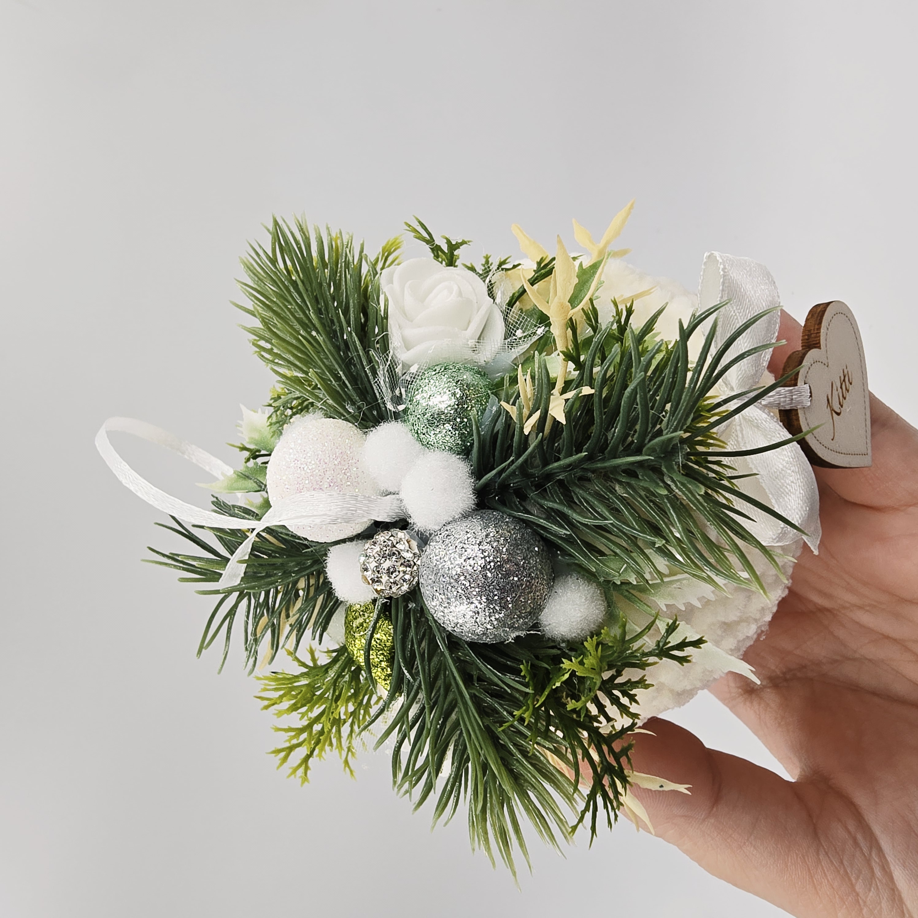 Kézzel készült karácsonyi gömb, puha horgolt zsenília fonallal borított hungarocell alappal. A tetején apró díszek teszik ünnepivé. Minden darab egyedi, kézzel készített.
