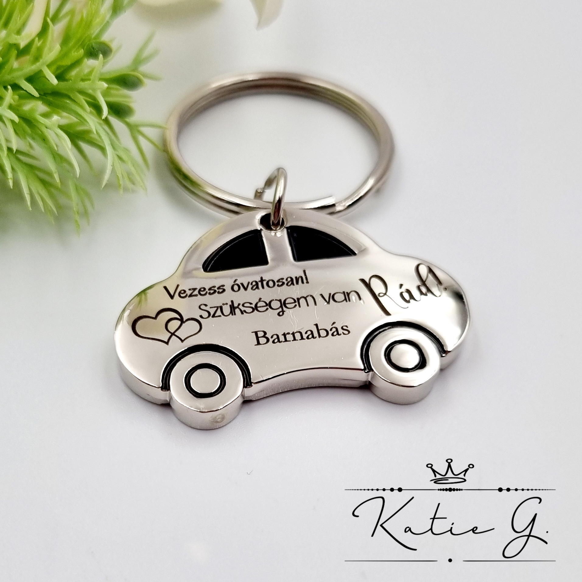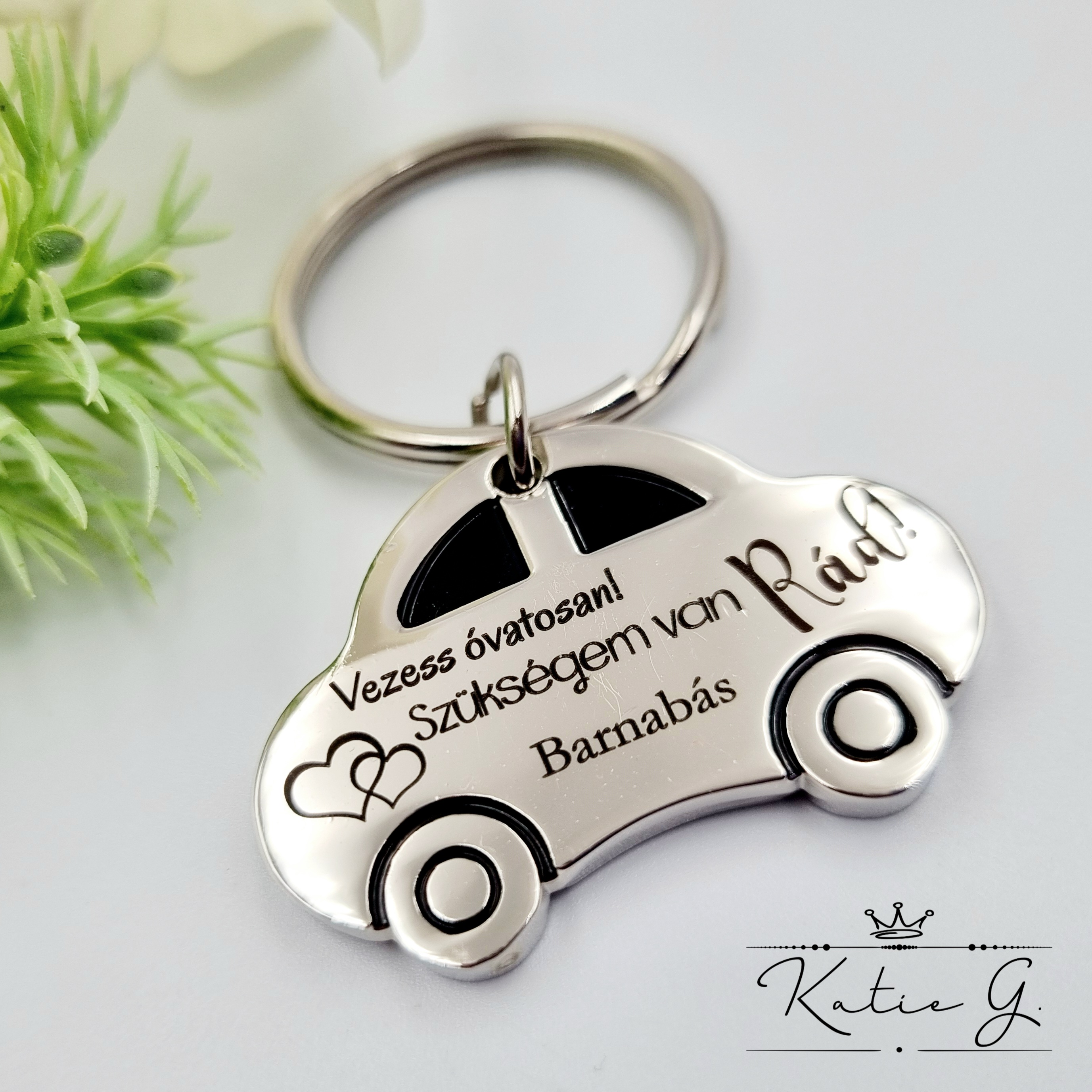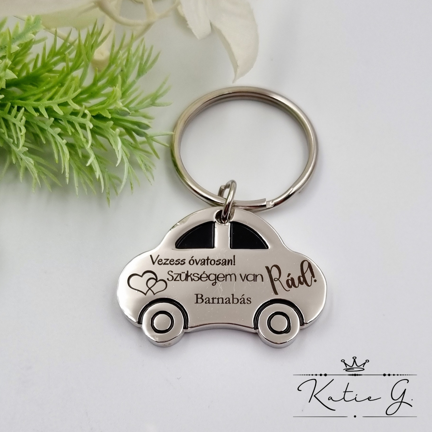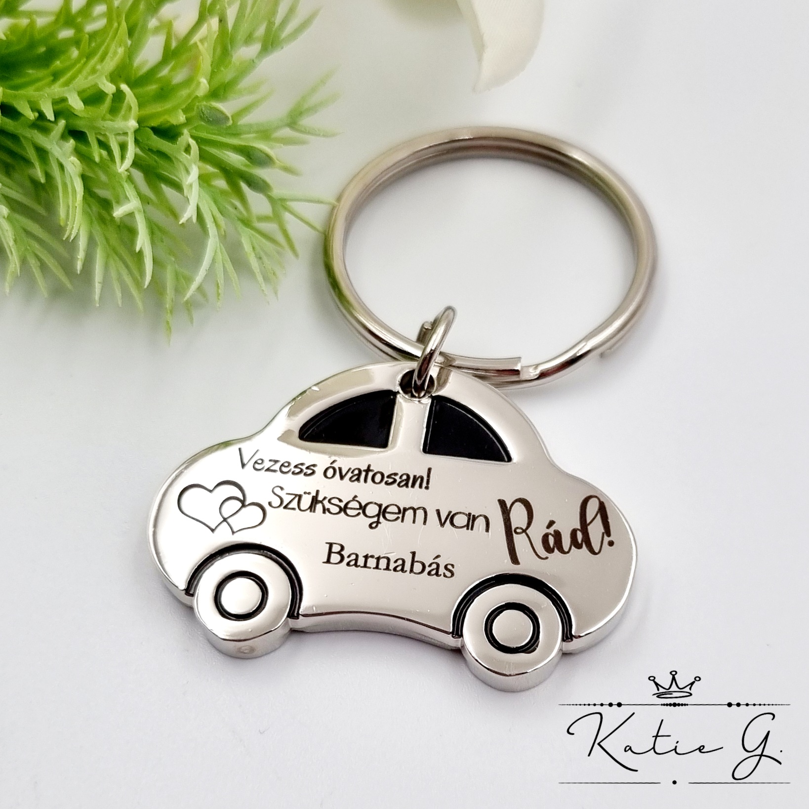 Kezdőlap » Gravírozott kulcstartók » Kisautó kulcstartó "Vezess óvatosan! Szükségem van Rád!" felirattal, egyedi névvel