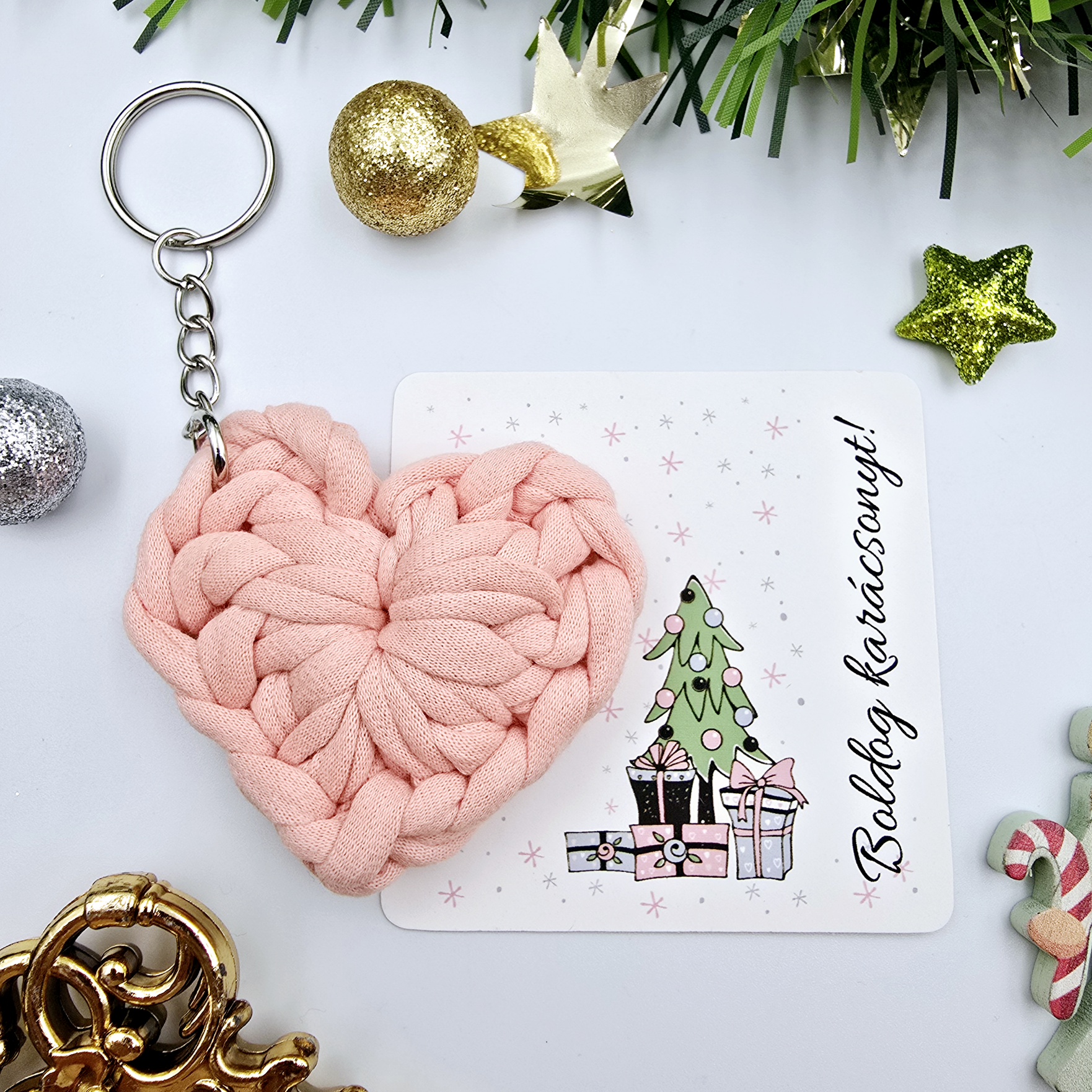 A kulcstartó a képen látható 7,5 cm-es karácsonyi ajándékkártyán érkezik, melyen „Boldog karácsonyt!” felirat található. ( Egyedi, személyre szabható felirat ennél a terméknél nem kérhető. ) Ez a szett ideális választás, ha valami különlegeset keresel karácsonyi ajándéknak, amely kifejezi az ünnepi hangulatot és a személyes törődést.