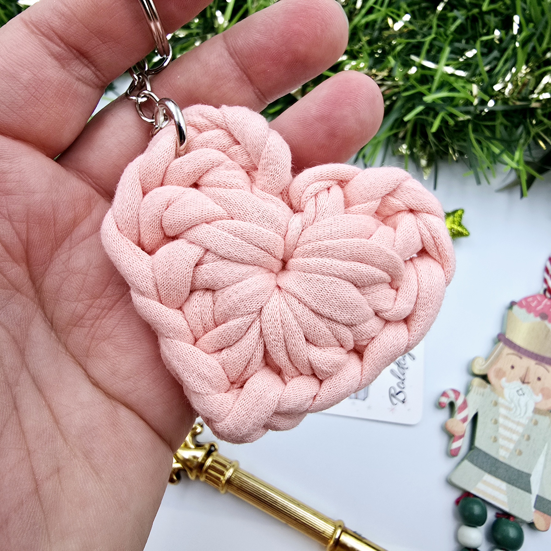 Lepd meg szeretteidet egy különleges, kézzel készített szív alakú kulcstartóval, amelyet a szeretet és gondoskodás ihletett! Ez a 6x5 cm-es, minőségi pólófonalból készült szív kulcstartó bármilyen táskára vagy kulcscsomóra tökéletesen illik.