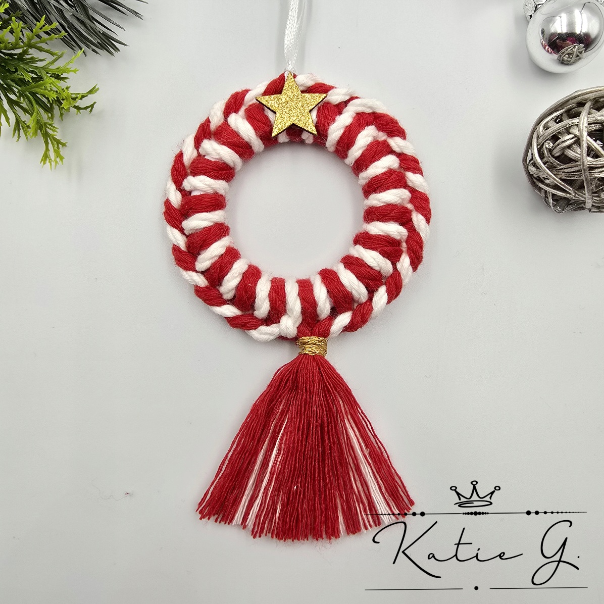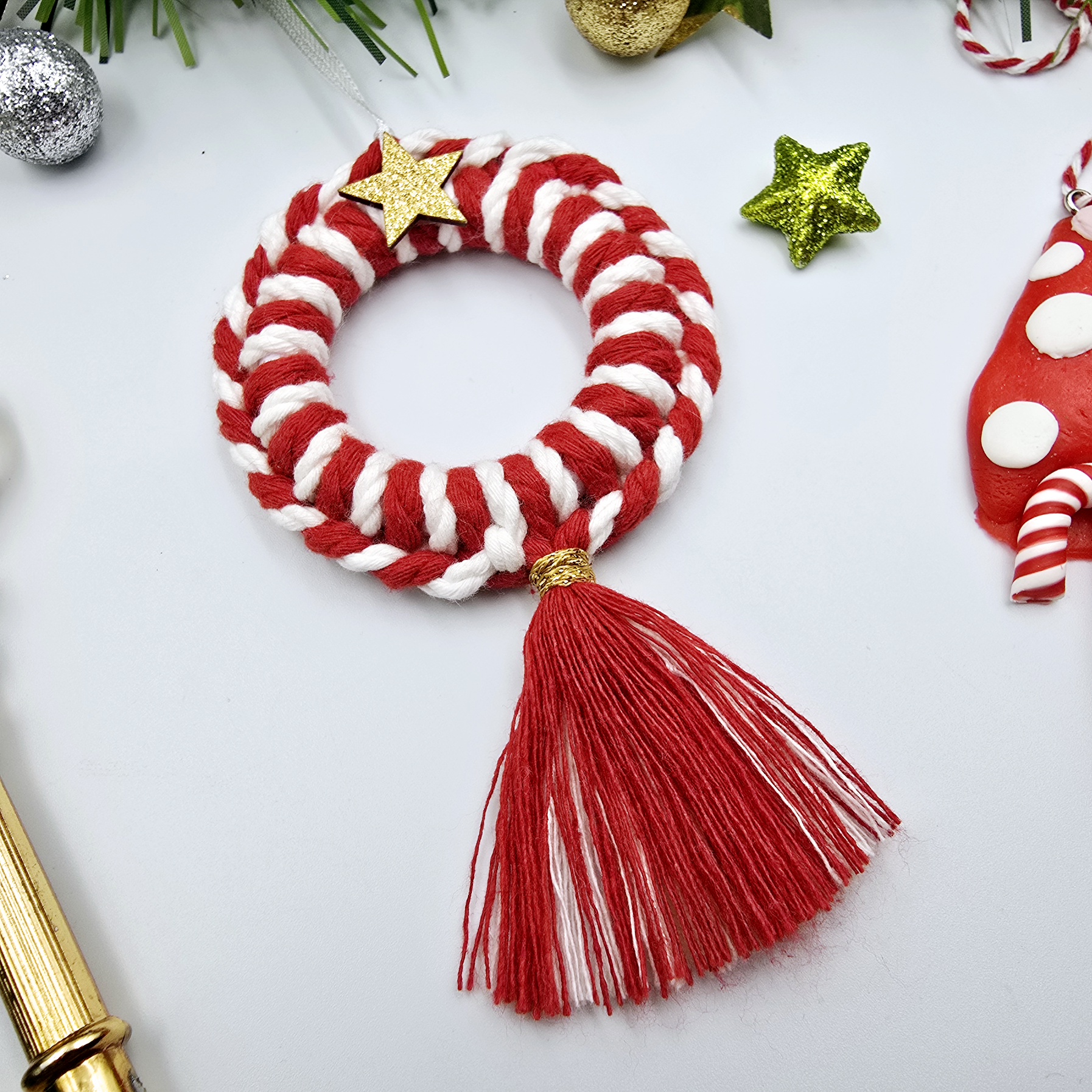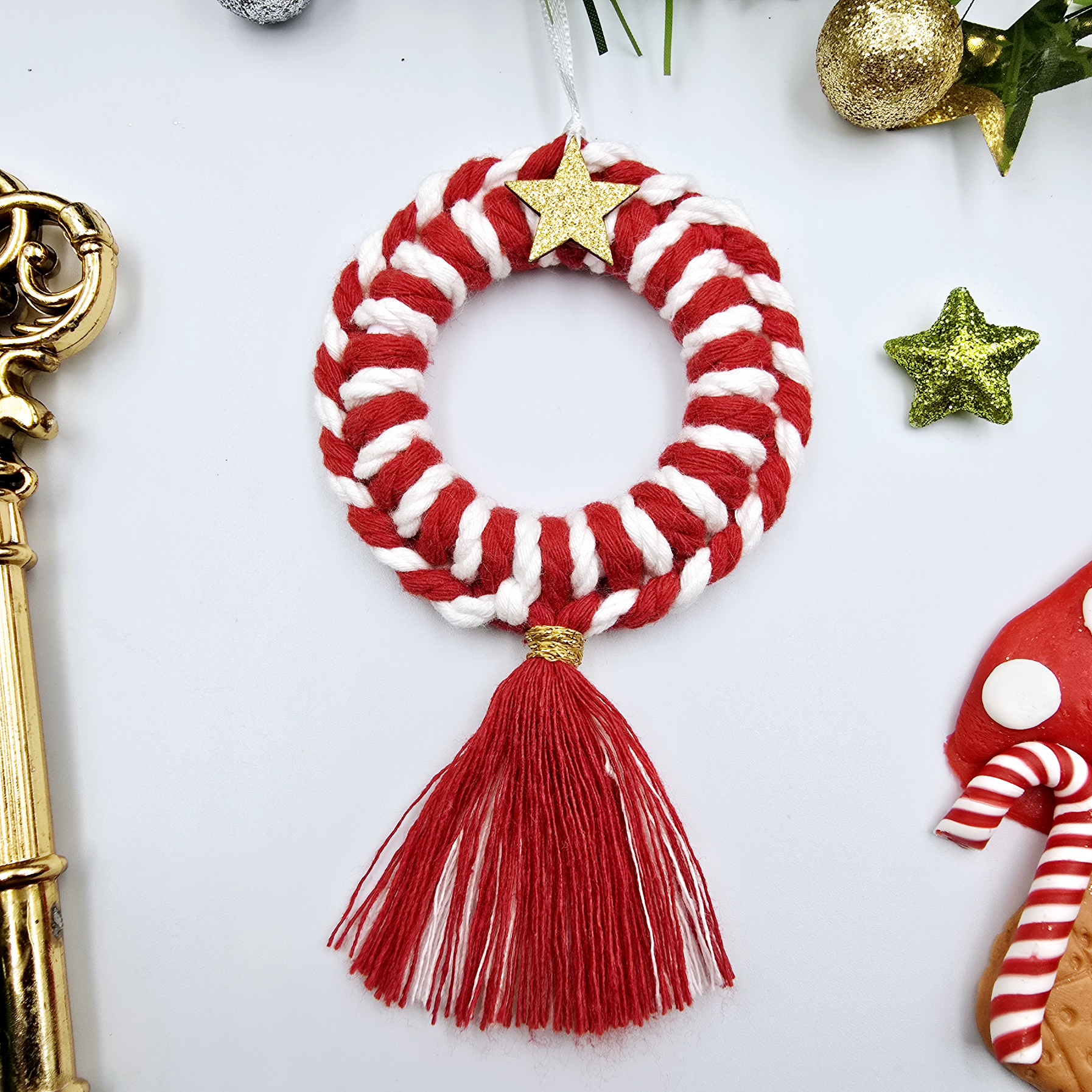 Vidd haza az ünnepek hangulatát ezzel a bájos, kézzel készített makramé koszorú díszítéssel! A 7 cm átmérőjű, piros és fehér színekben készült koszorú kiváló minőségű pamutfonalból készült, ami melegséget és meghittséget sugároz. A koszorú tetején egy arany csillag díszeleg, amely finom csillogást kölcsönöz a dísznek, míg az alján egy piros bojt egészíti ki a hagyományos, ugyanakkor elegáns megjelenést.