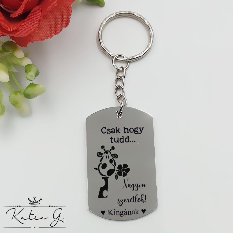 Ez a kulcstartó a képen látható grafikus elrendezéssel, "Csak hogy tudd... Nagyon szeretlek!" felirattal készül. Az idézeten változtatni nincs lehetőség. A kulcstartó mégis személyessé tehető, mert az alsó részre te döntheted el, hogy mit gravírozzunk.