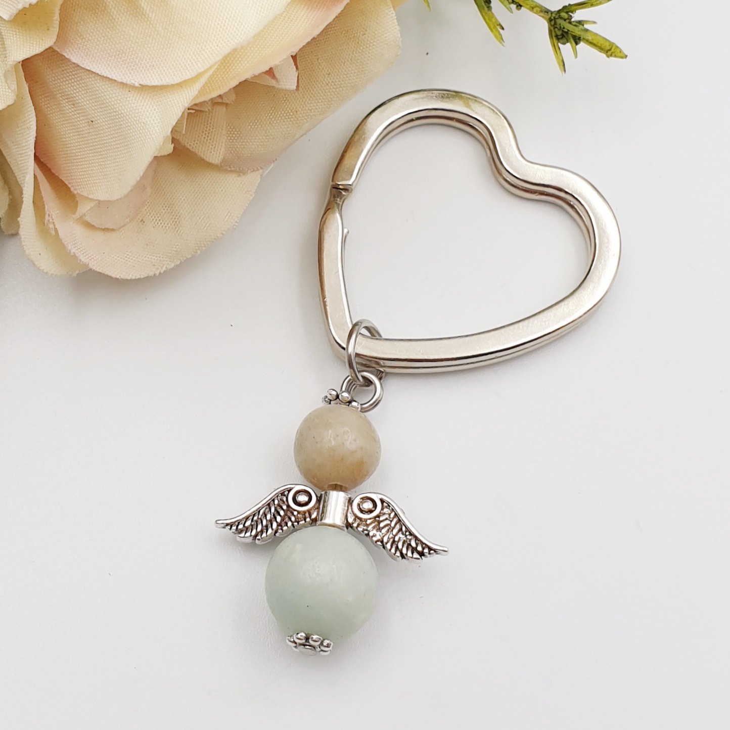 Kezdőlap » Anyák napi ajándékok » "Rachel" - ékszer kulcstartó amazonit angyalkával, szív alakú kulcstartón